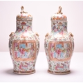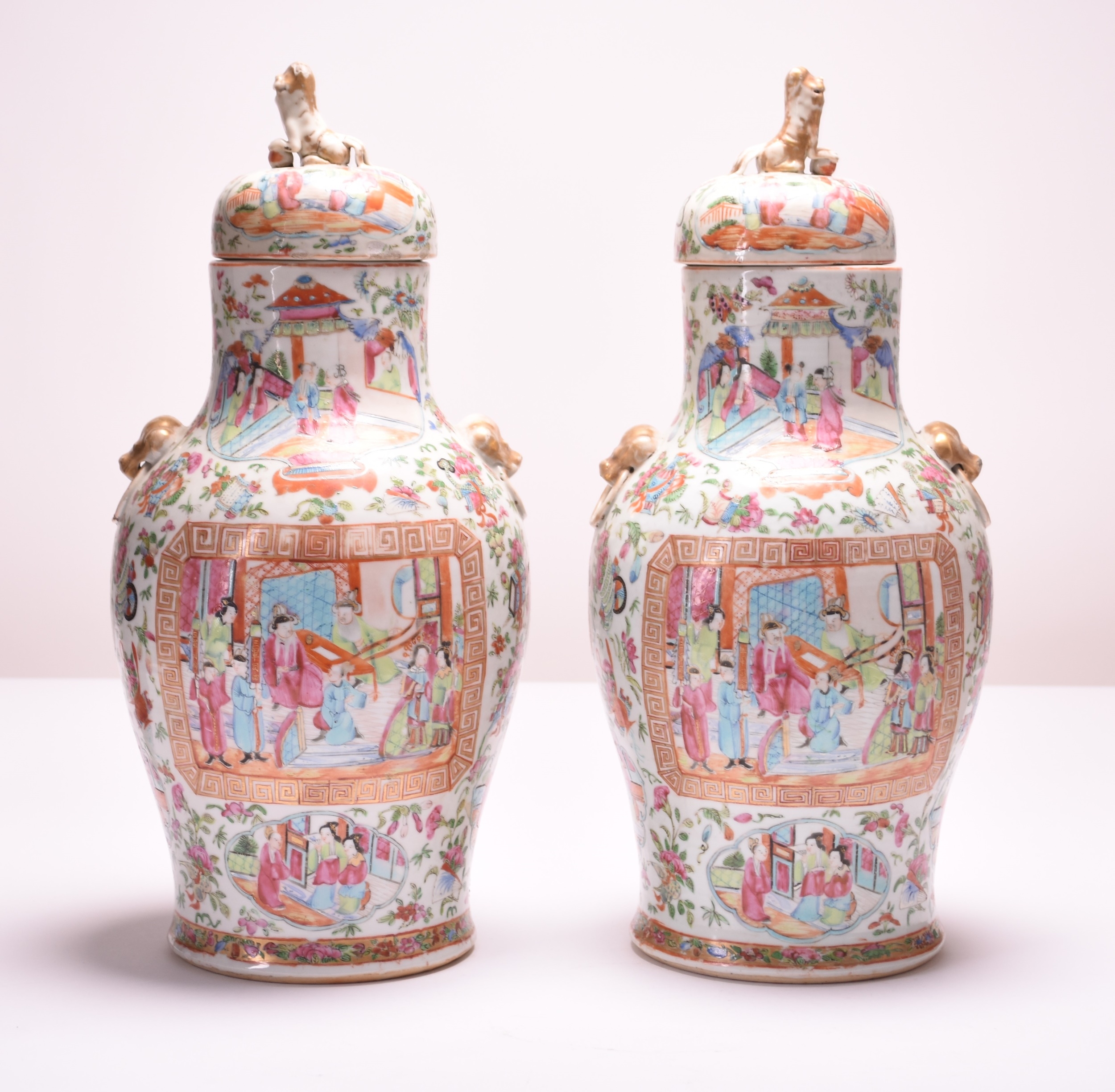 A pair of Chinese Canton famille rose porcelain vases and covers 19th century Of baluster form with twin dog-head and ring 'handles', the domed covers with lion dog finials, decorated with panels of high status figures in interior settings, surrounded by scattered flowers, foliage and precious objects. 48cm high (2)