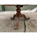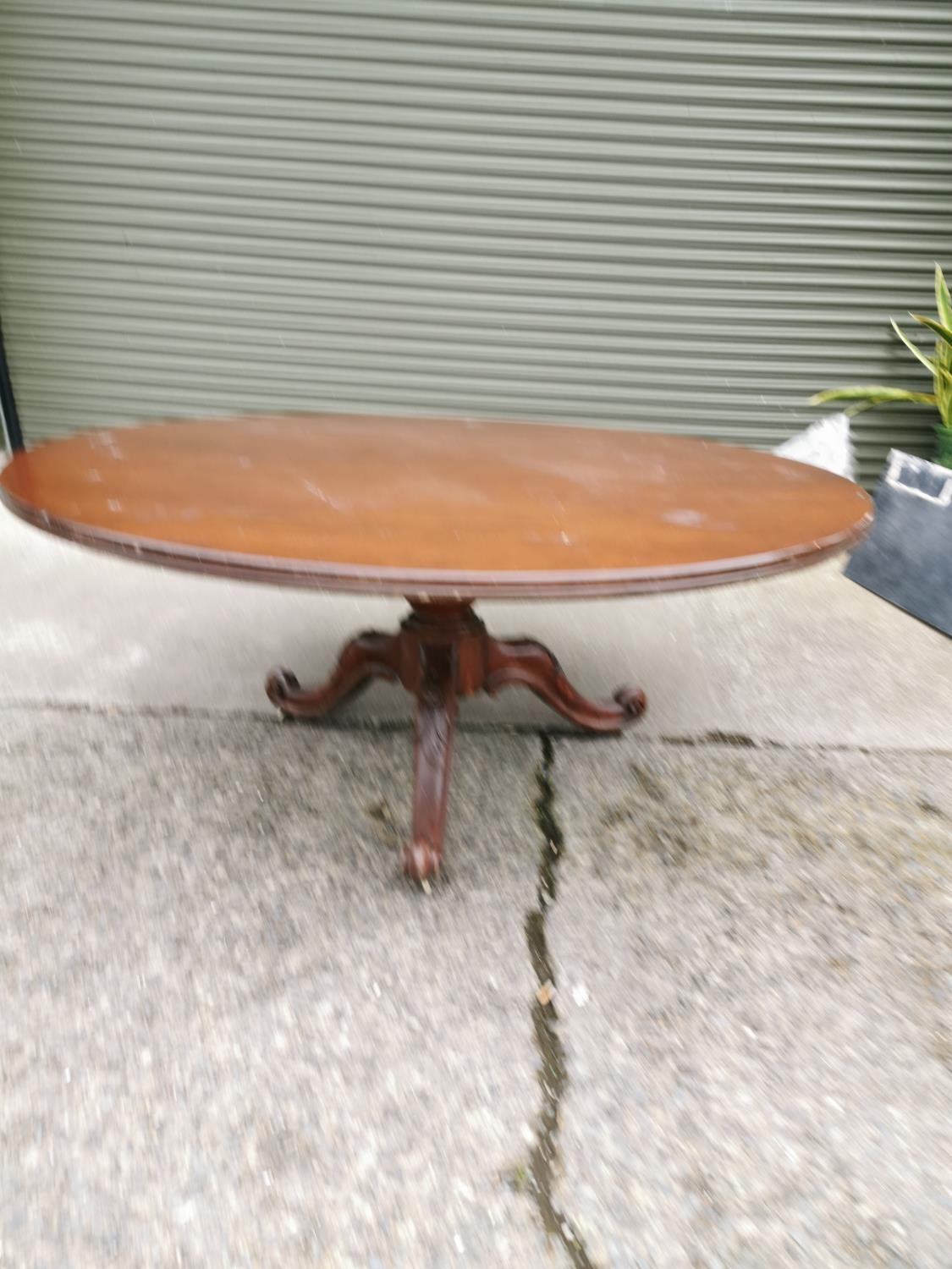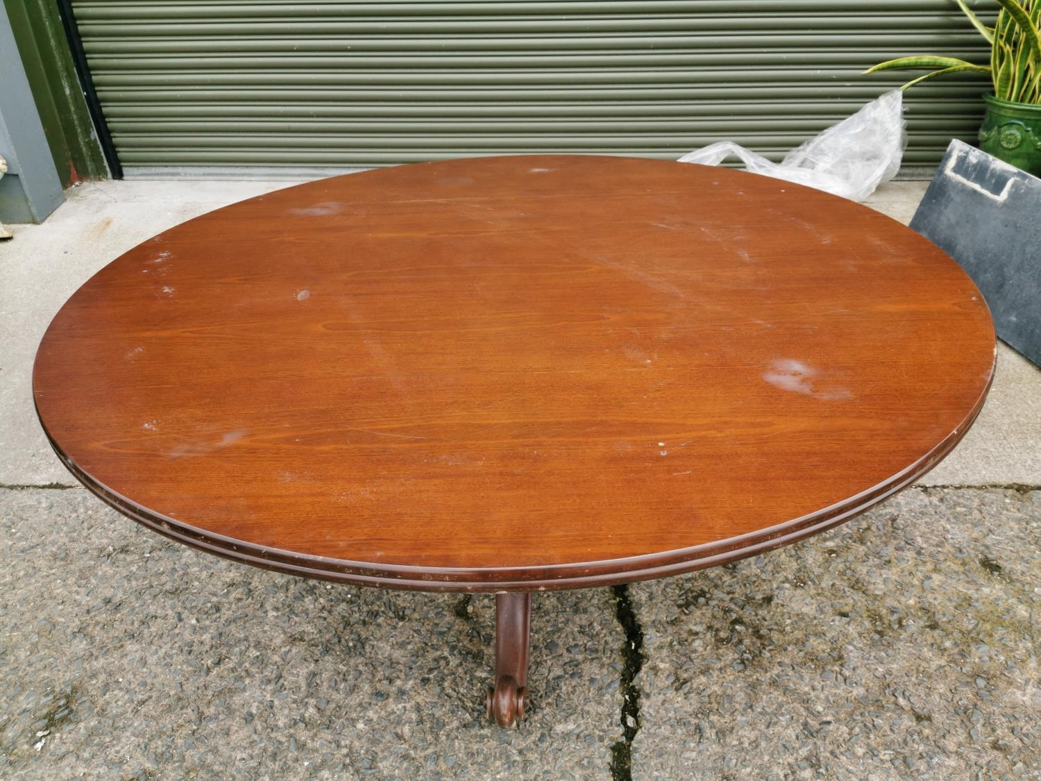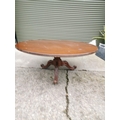 Mahogany centre table raised on turned column and three out swept legs { 73cm H X 166 cm Dia }.
