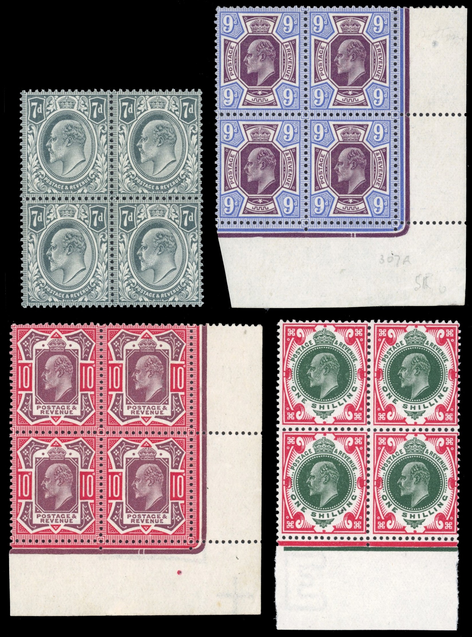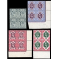 1902-10 De La Rue set to 1s in blocks of four fresh unmounted o.g., the 9d and 10d corner marginals and 1s bottom marginal; a fine group