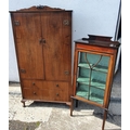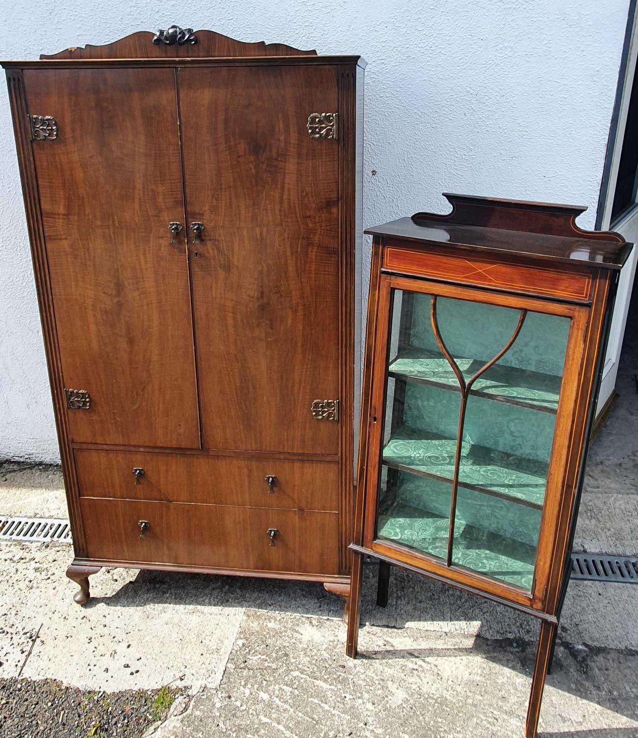 An Edwardian Mahogany and inlaid Display Cabinet along with a Walnut veneered Wardrobe/Display Cabinet. 59w x 136h x 39d cm.
