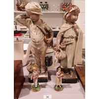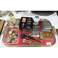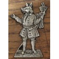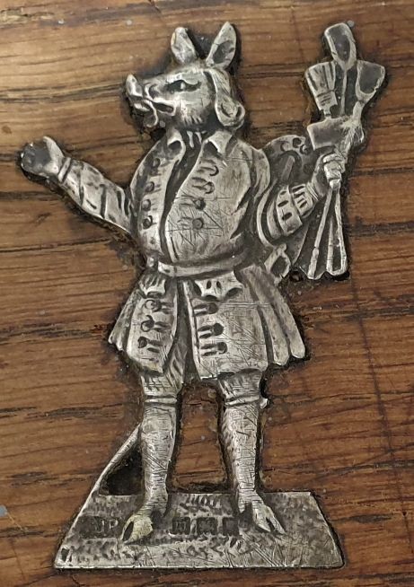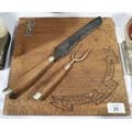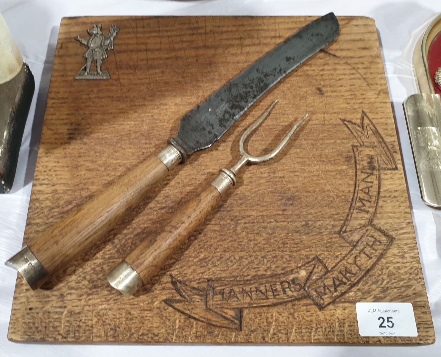 An oak chopping board with silver hallmarked boar figure motif together with a carving knife and fork with hallmarked silver collars.