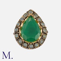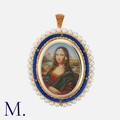 An Enamel Miniature Brooch Pendant, in 18 carat yellow gold, depicting a stylised interpretation of the Mona Lisa, within a border of blue enamel decoration and pearls. Marked 18K 750 ITALY.
