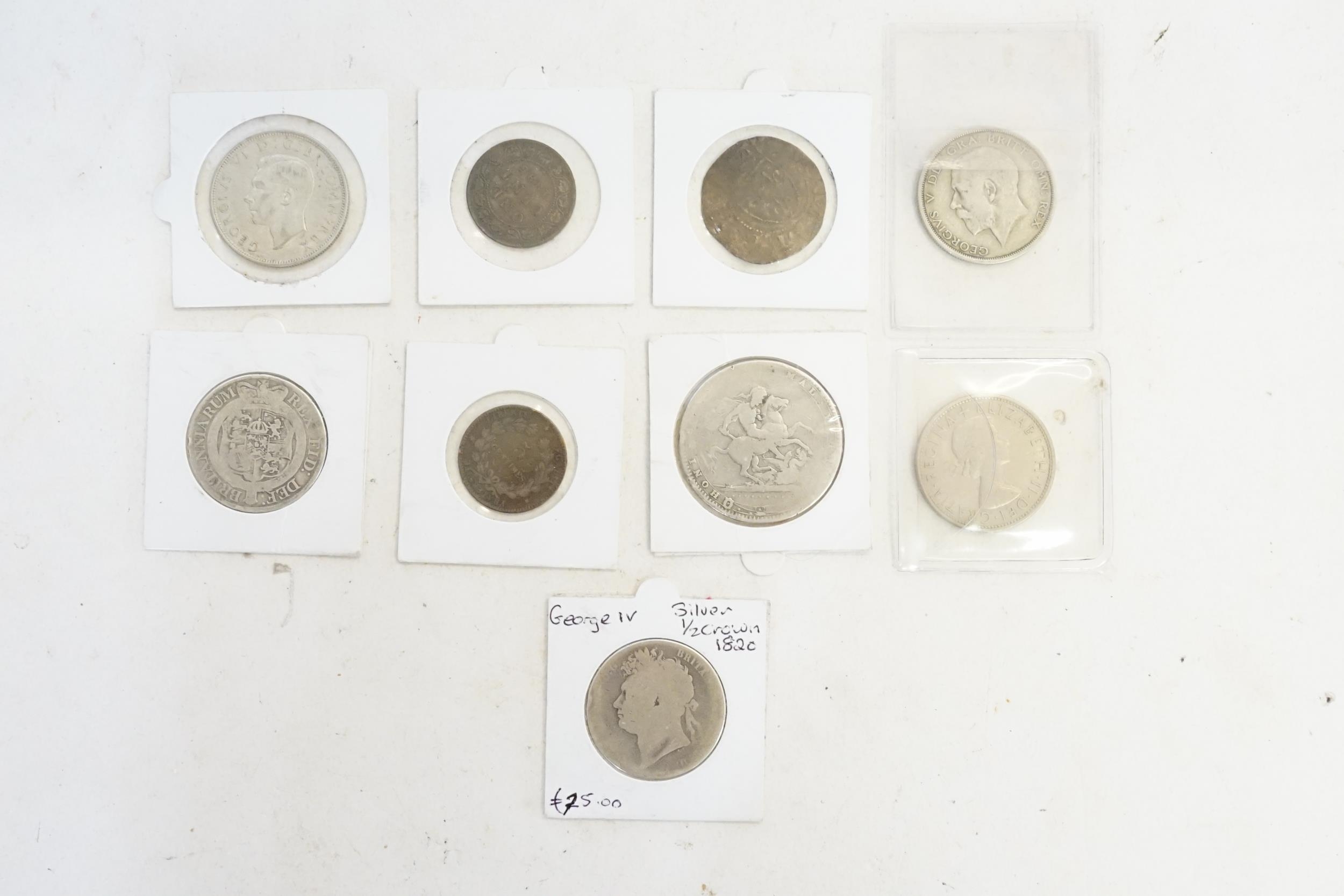 A Collection of Coins to include a 1945 Half Crown, 1845 Canadian One Cent, 1819 Georgi III Silver Half Crown, a George III Silver Crown, a 1820 George IV Half Crown, etc. (9 Coins in Total).