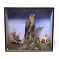 A late Victorian taxidermy group study of a hen harrier, ermine stoat and golden plover, within a naturalistic setting with painted sides and background, unlabelled, height 63cm, width 68.5cm and depth 26.5cm, slight damage.