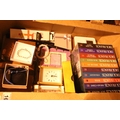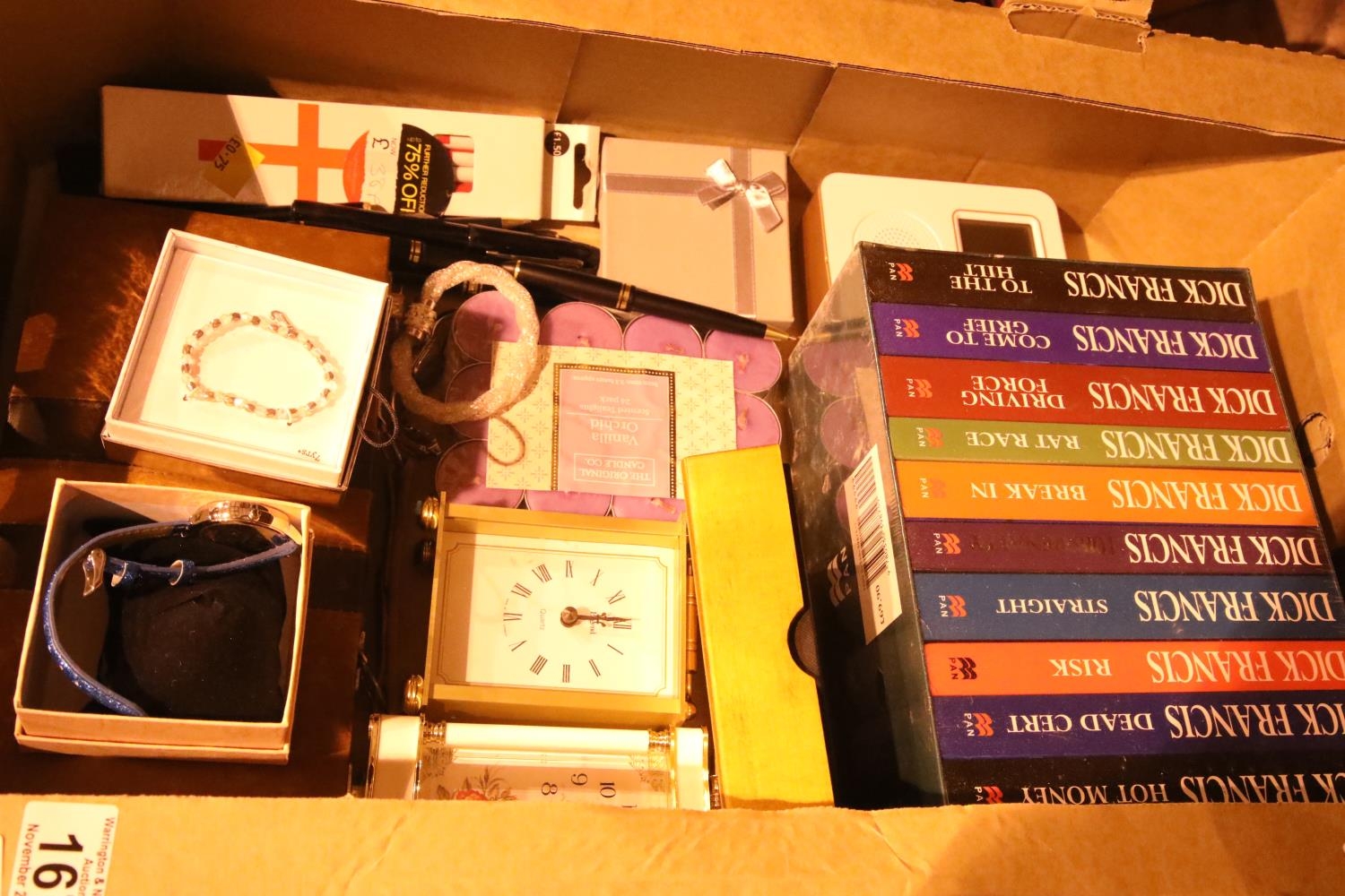 Box of mixed items including pens and Dick Francis novel. Not available for in-house P&P