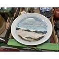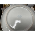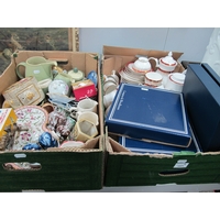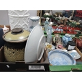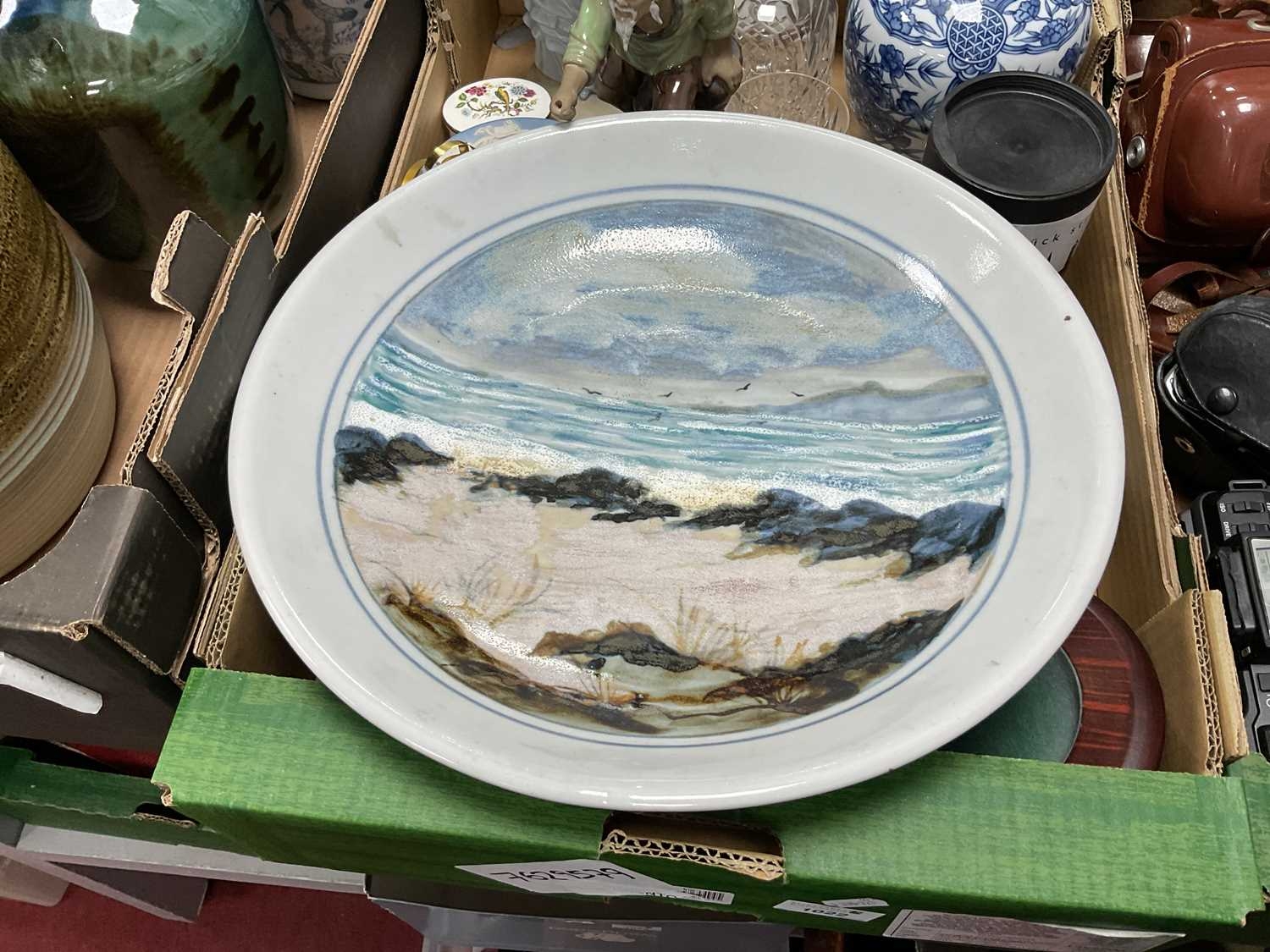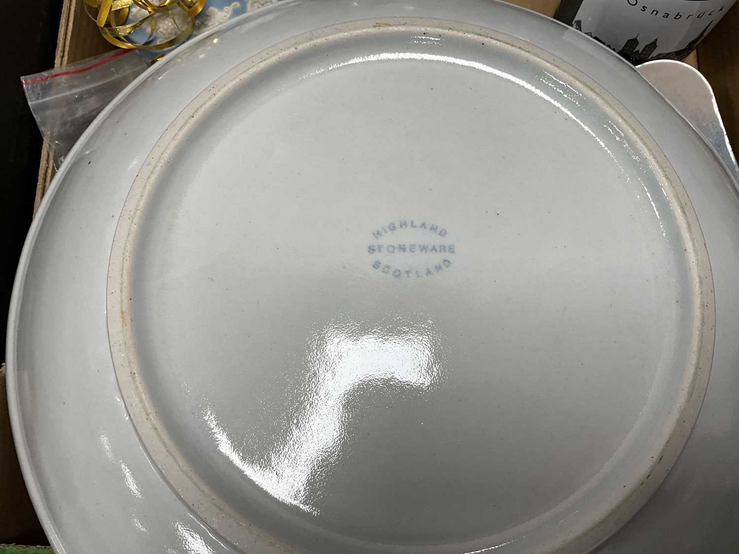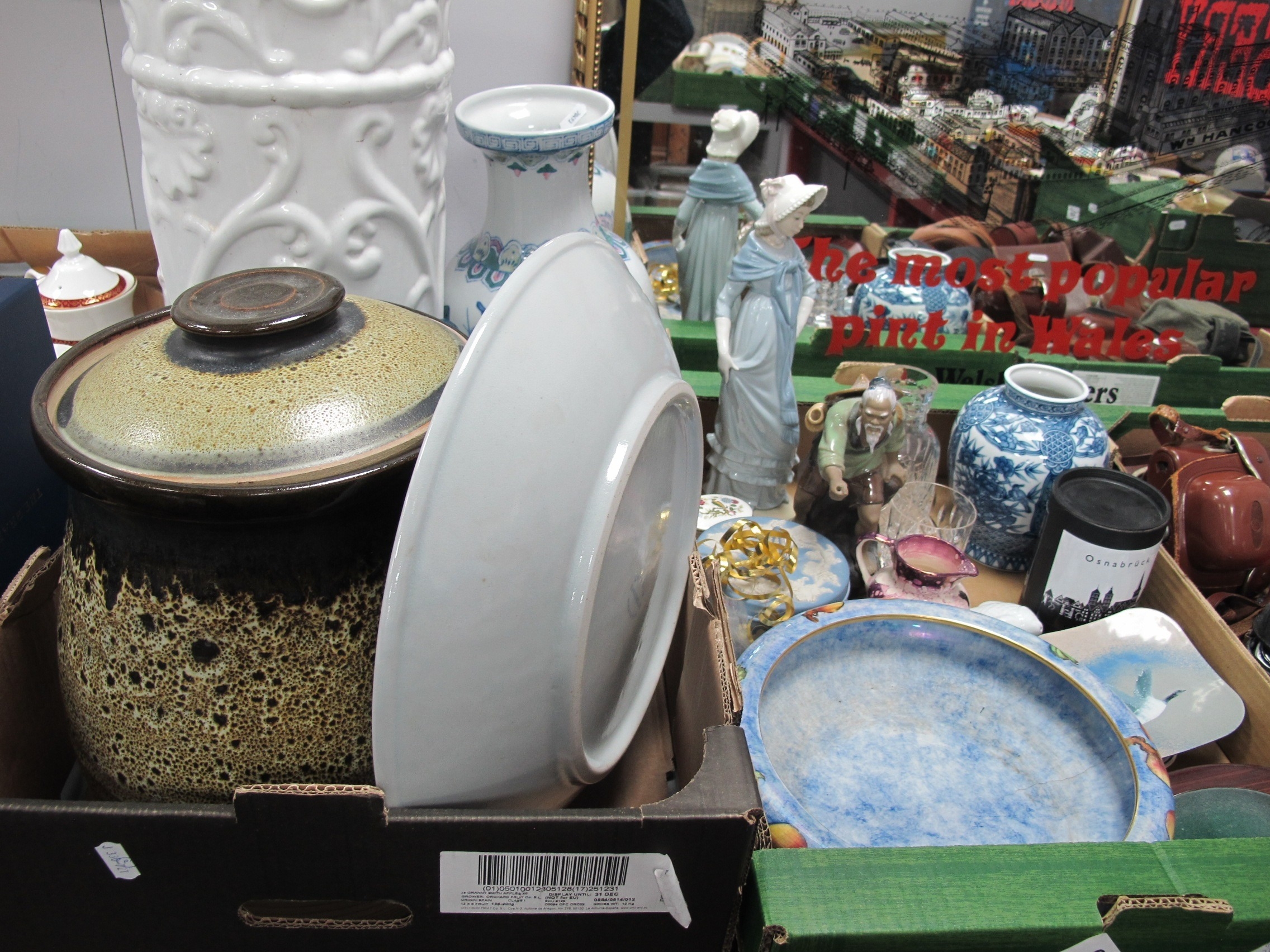 Highland Pottery Dish, 36cm diameter, large stoneware lidded jar, Wedgwood Jasper lidded jar, Nao and Chinese figurines, carafe, osnabrück tumbler, enamelled ashtray:- Two Boxes.
