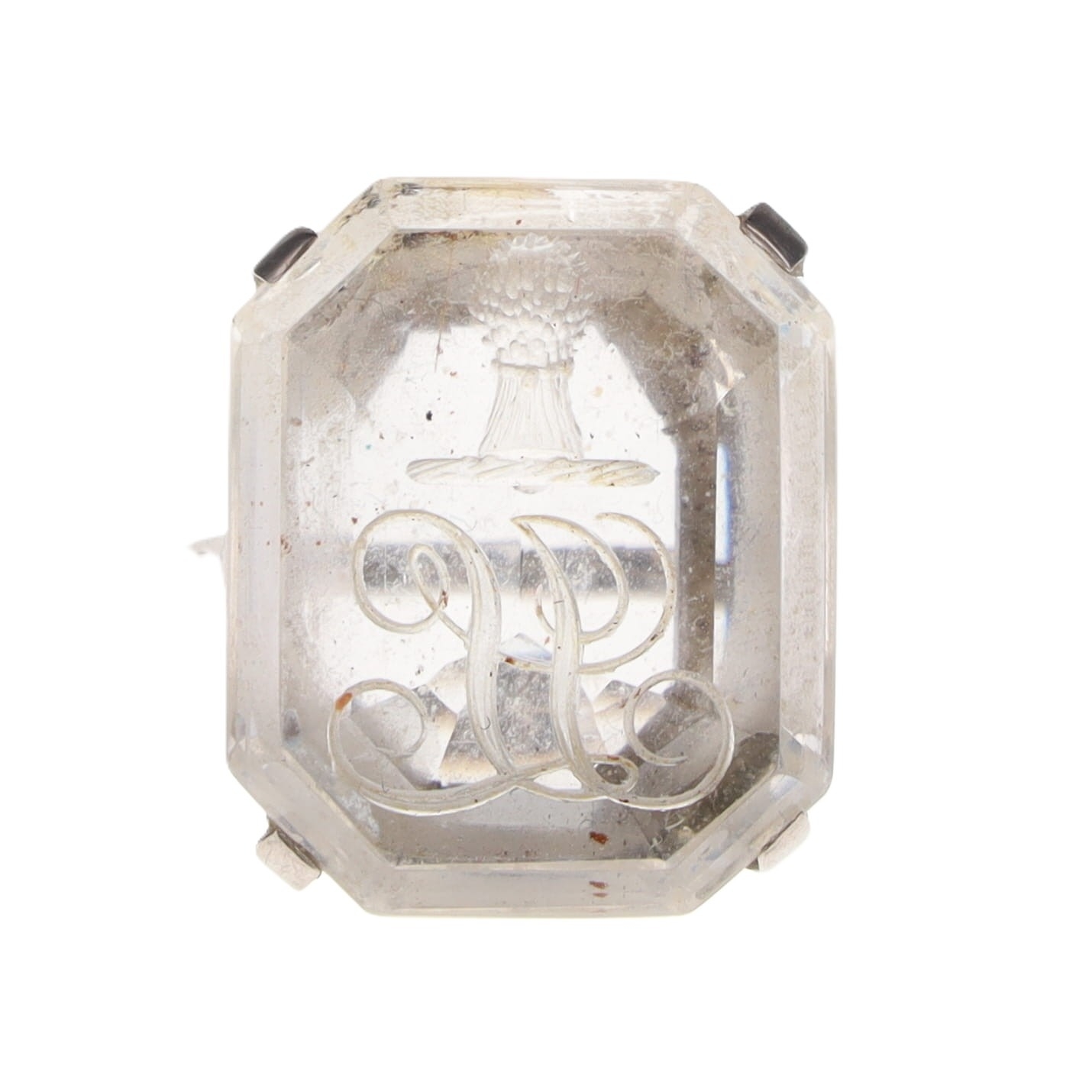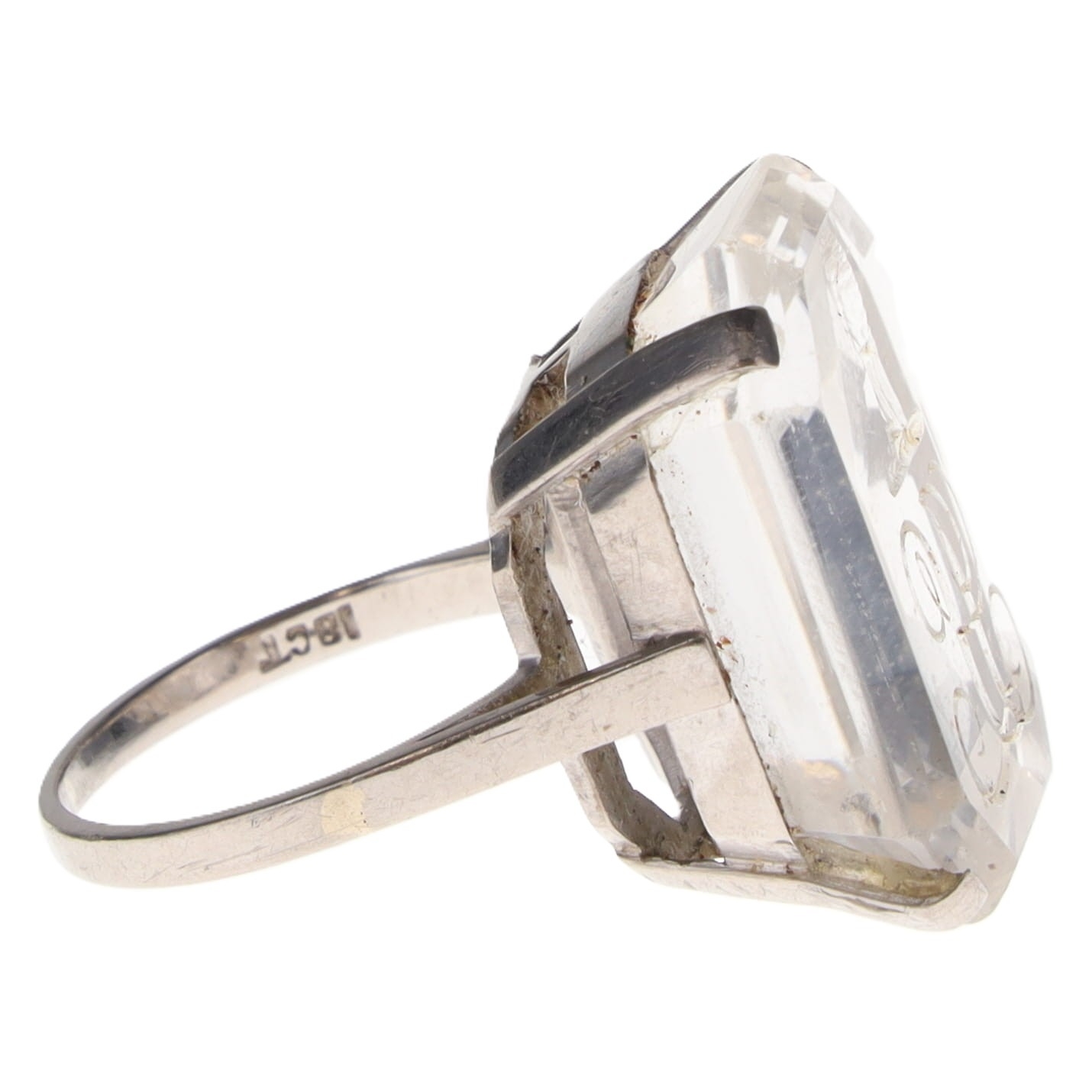 Rock Crystal Intaglio 18ct White Gold Ring. This piece is stamped for 18ct gold on the inner band. There is moderate wear and scratches to metal, light to moderate wear and scratches to stone. The intaglio is in good condition. The stone is secure in setting, would benefit from professional retipping. This is a UK ring size O 1/2, weighs in total 11.3g.