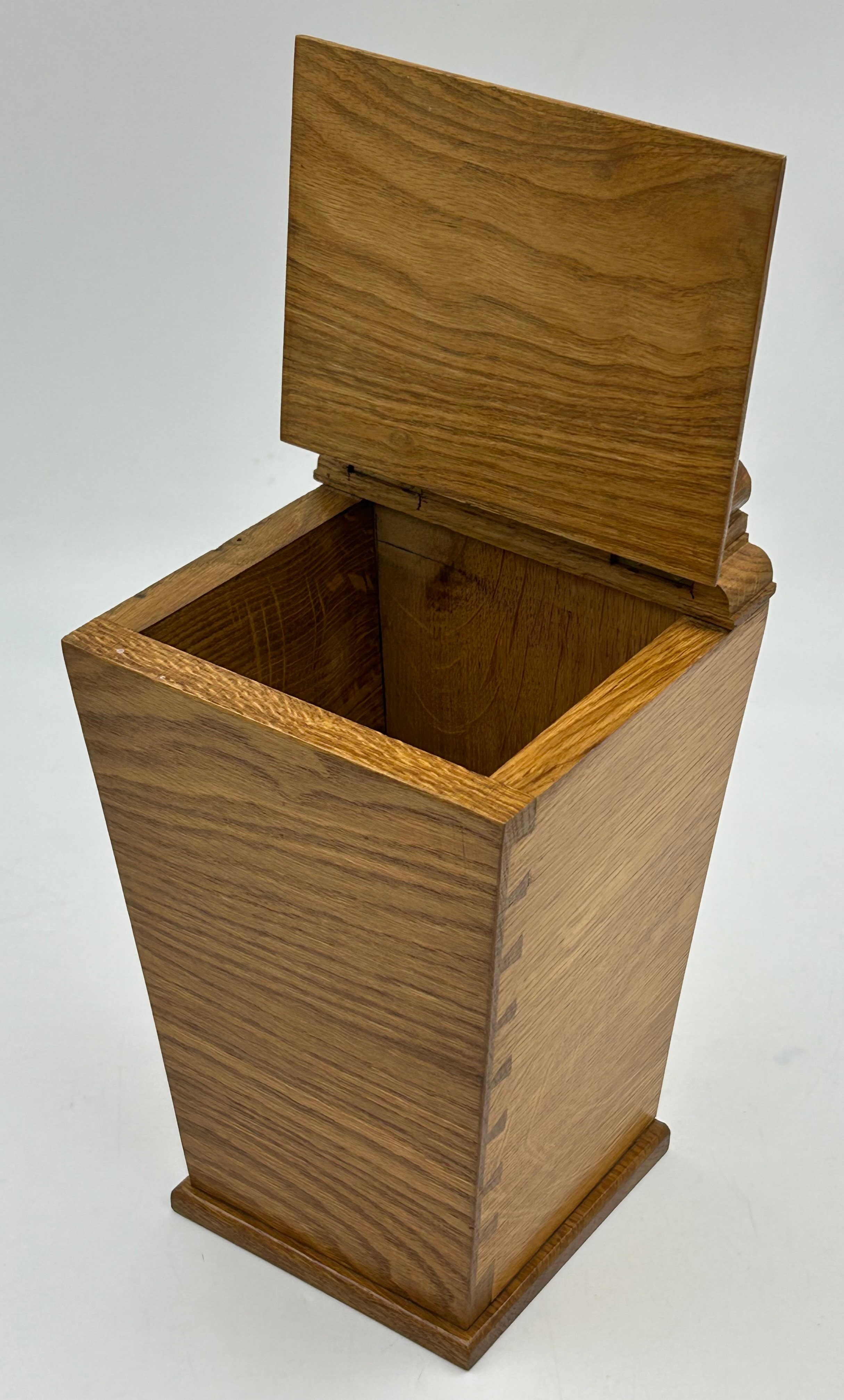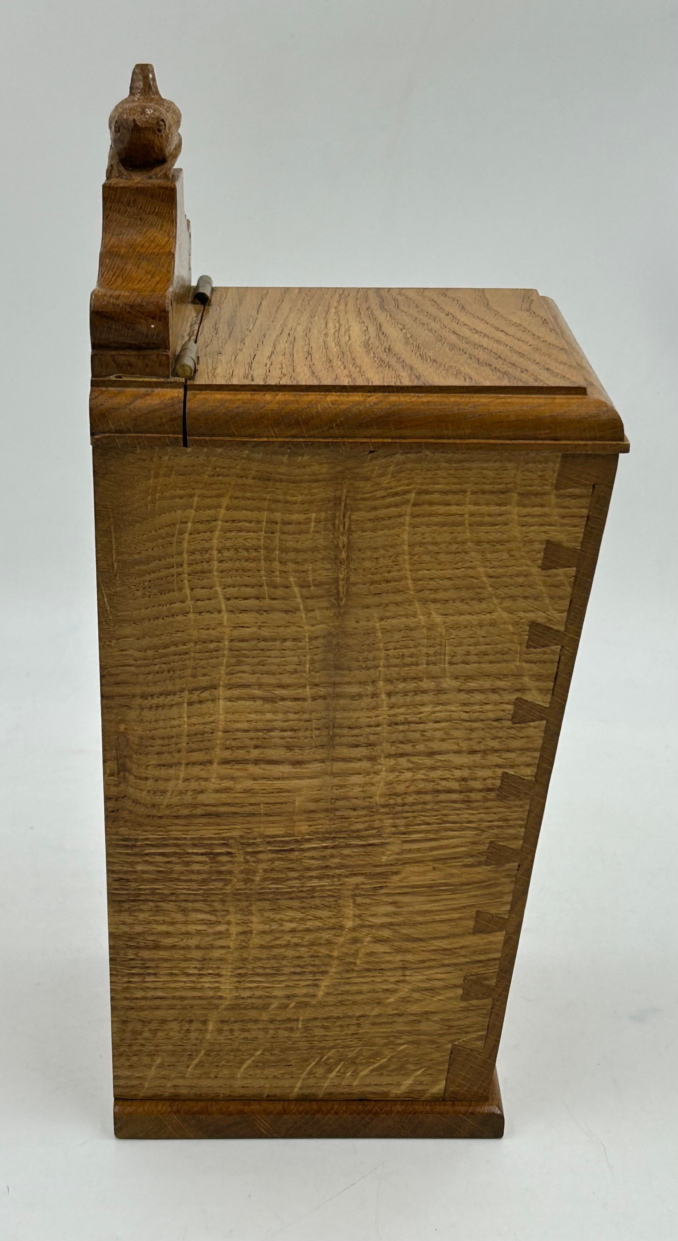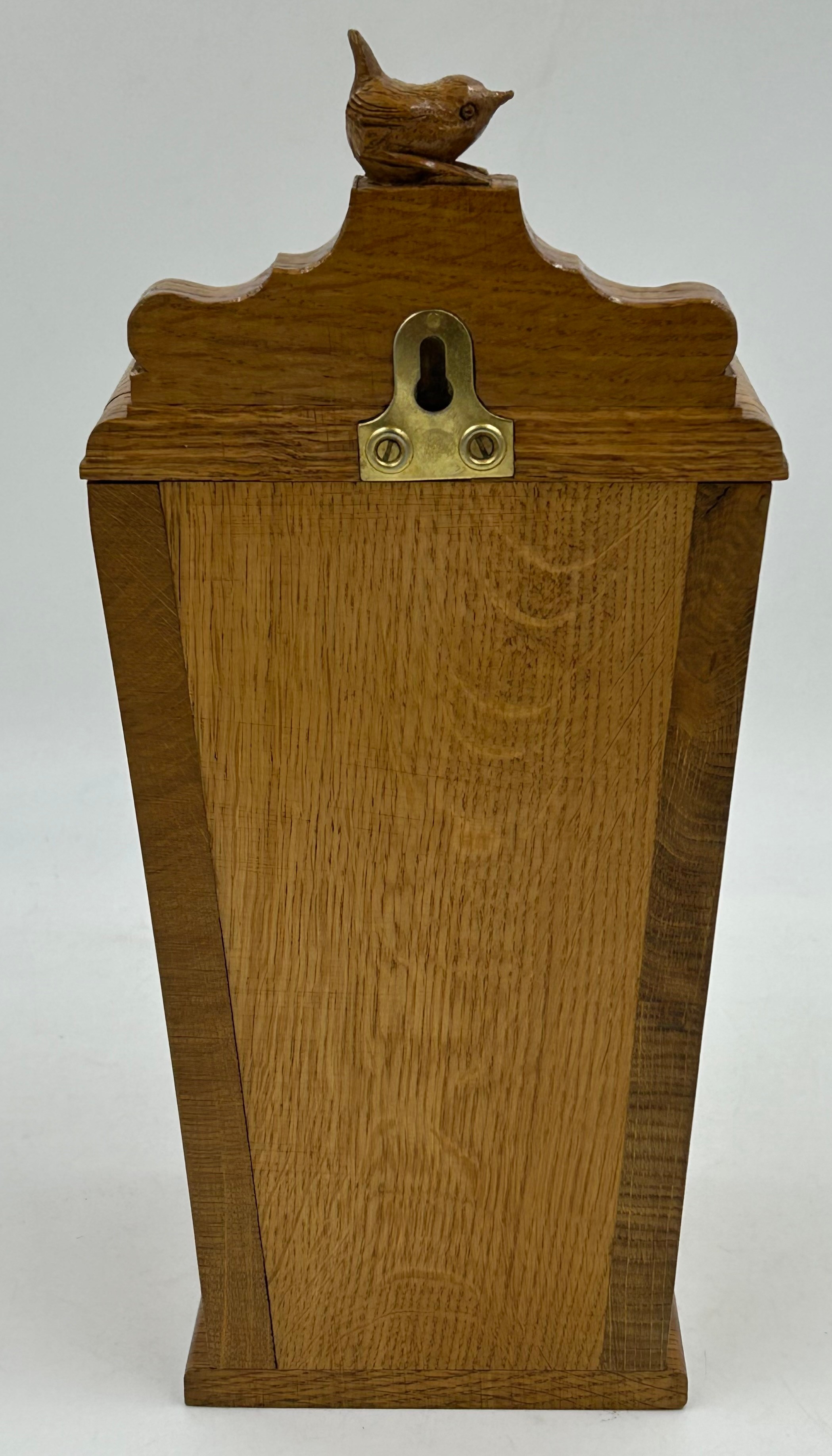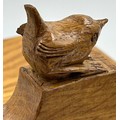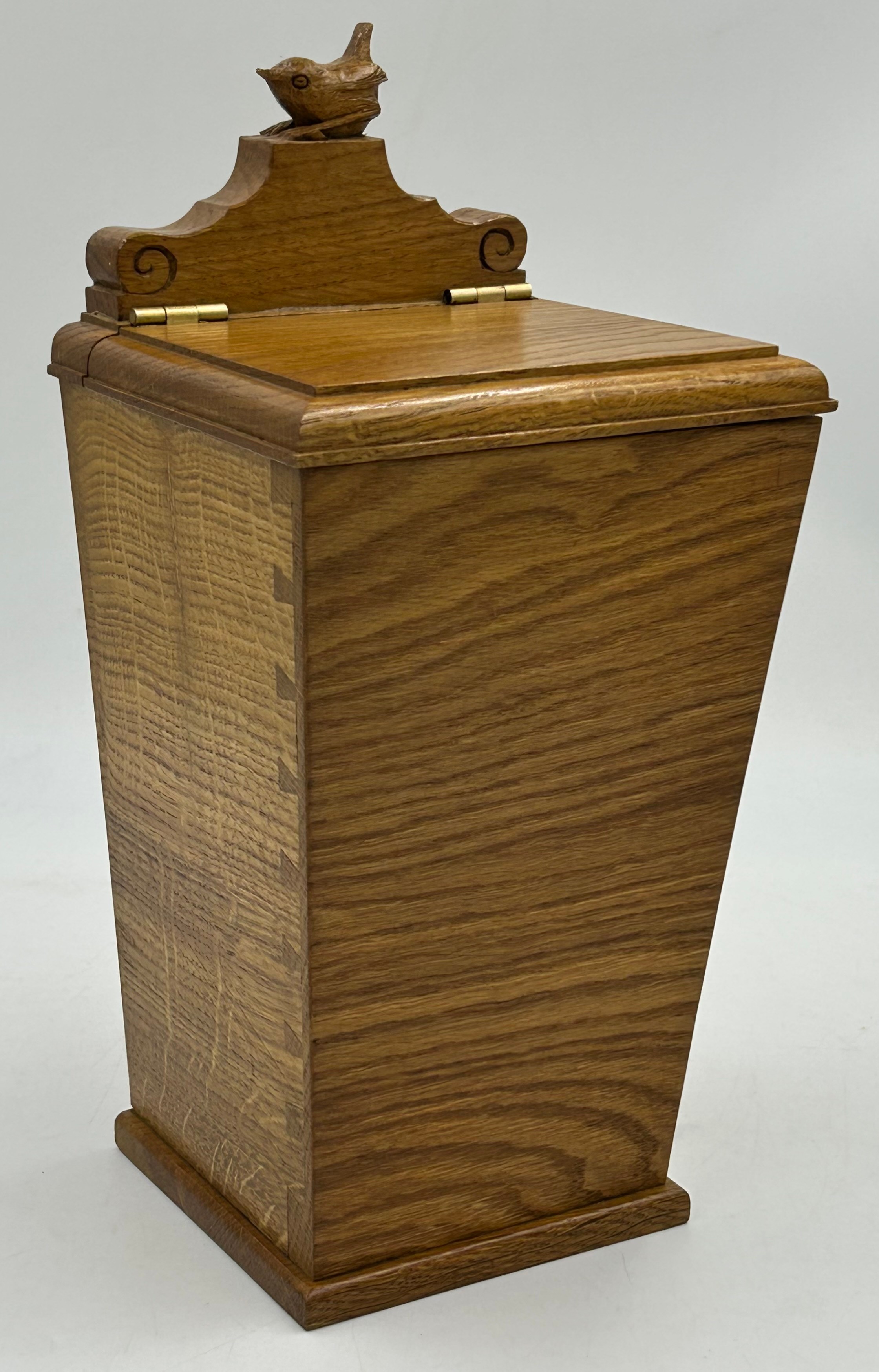 Bob "Wrenman" Hunter: An oak candlebox with signature wren to the top, lid with brass hinges, 24cm to lid, total height 31cm.
