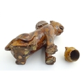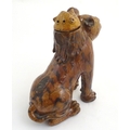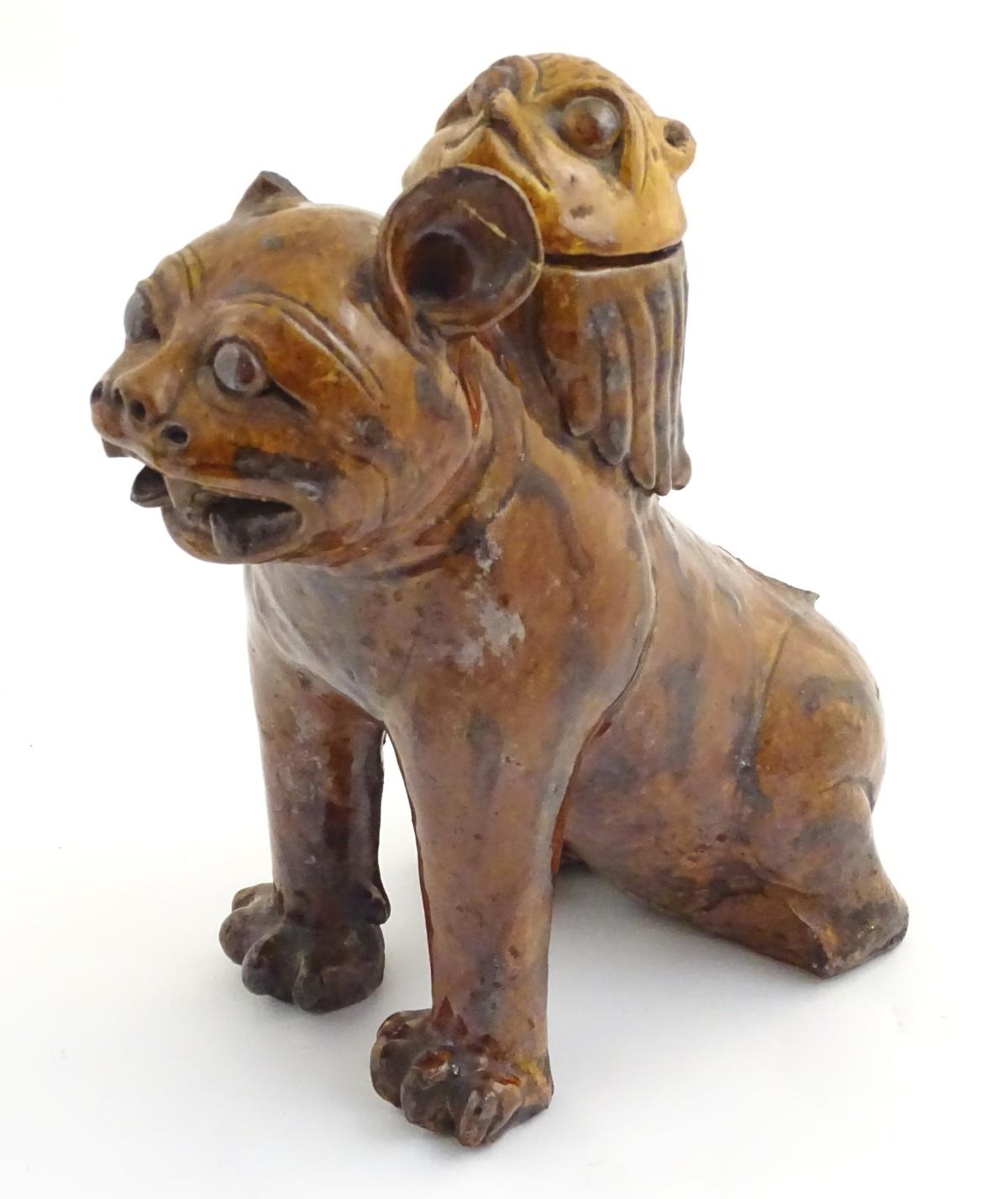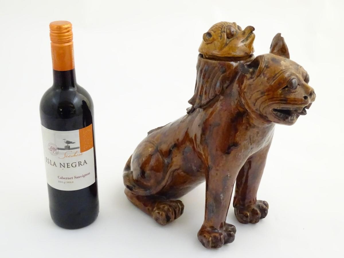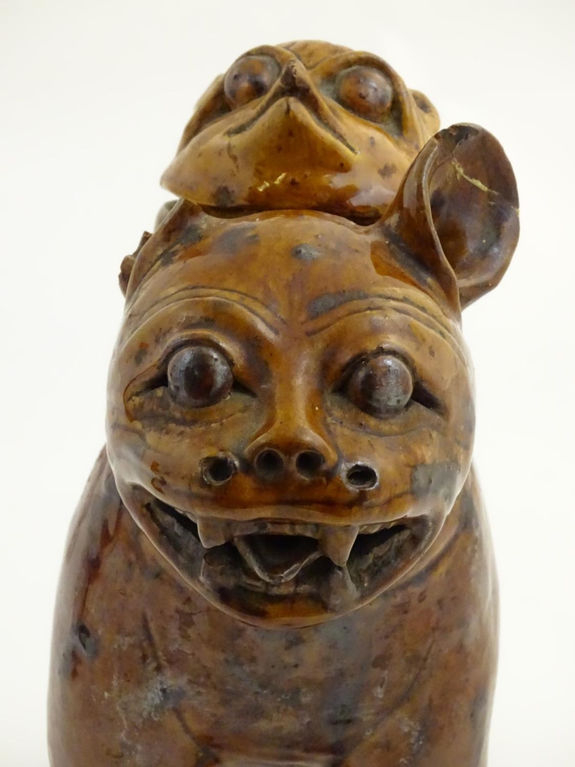 An unusual 19thC Turkish Cannalake Pottery earthenware jug in the form of a cat / lion, the lid formed as a stylised bird, eagle / owl, in a dark red / brown glaze. Approx. 12 1/4'' high.