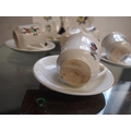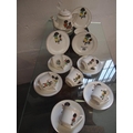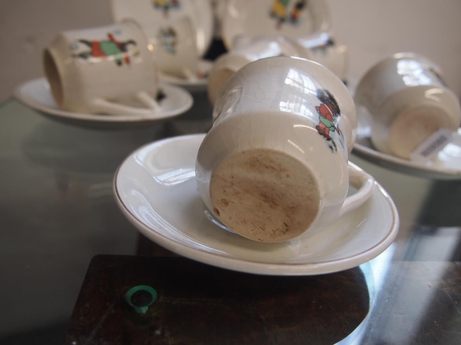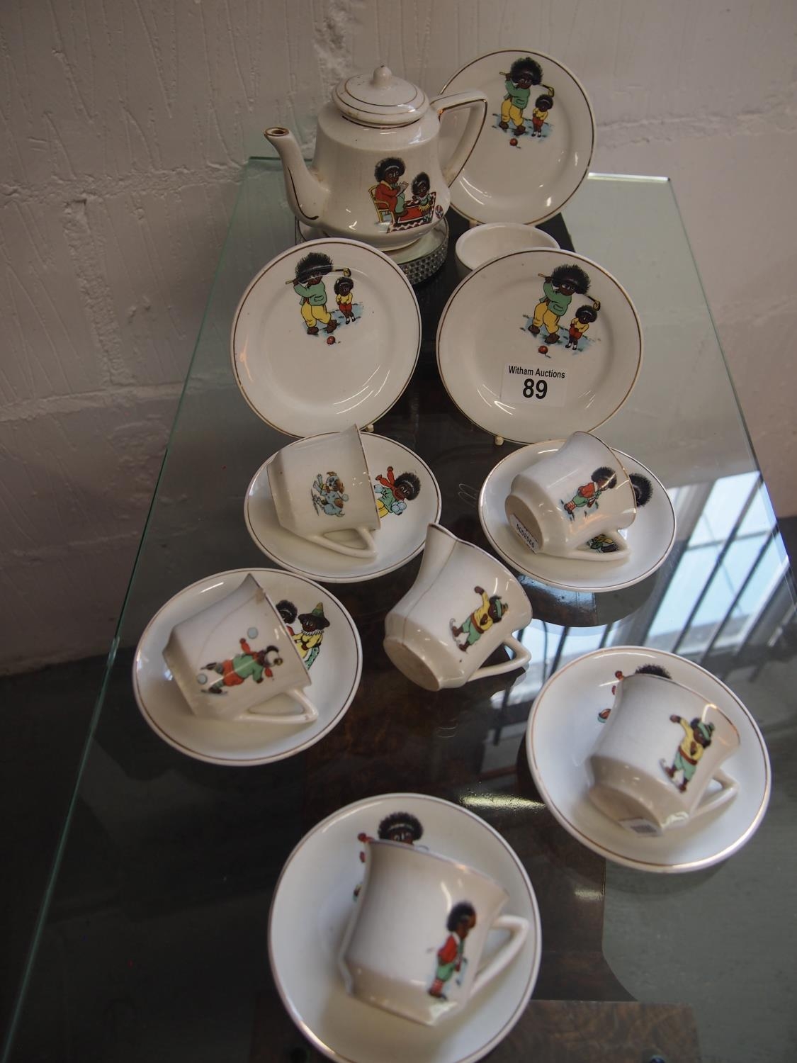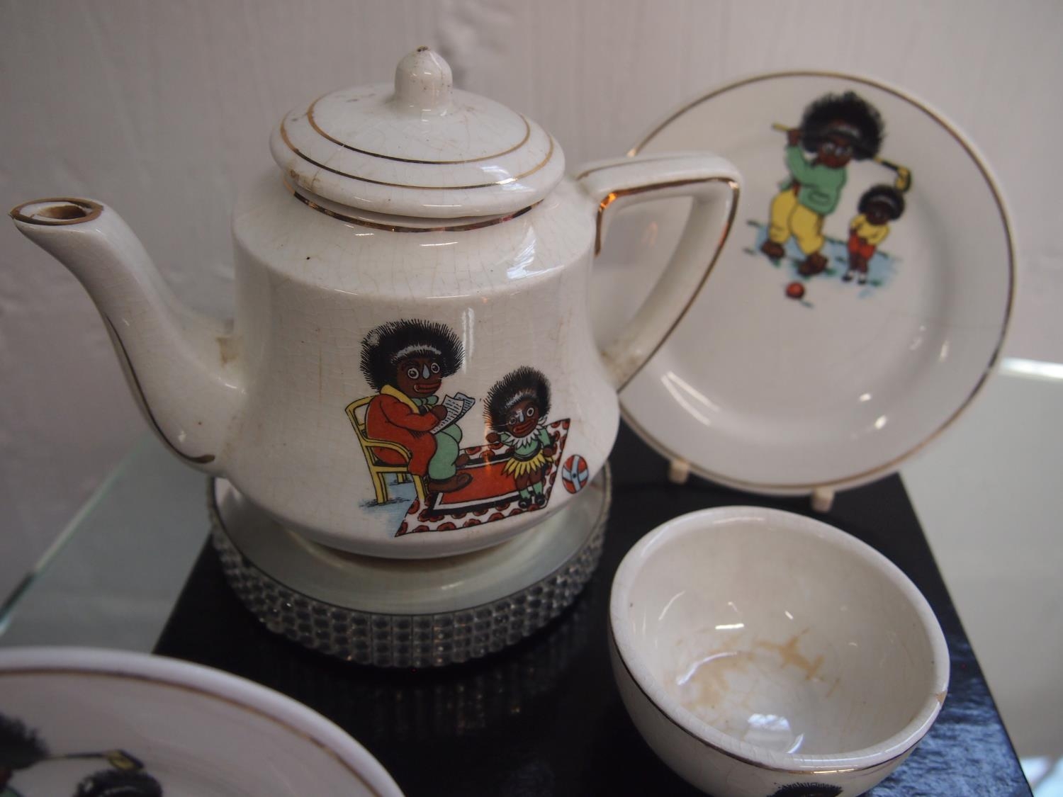 Antique porcelain children's tea set with caricature design of mother and child sporting scenes A/F