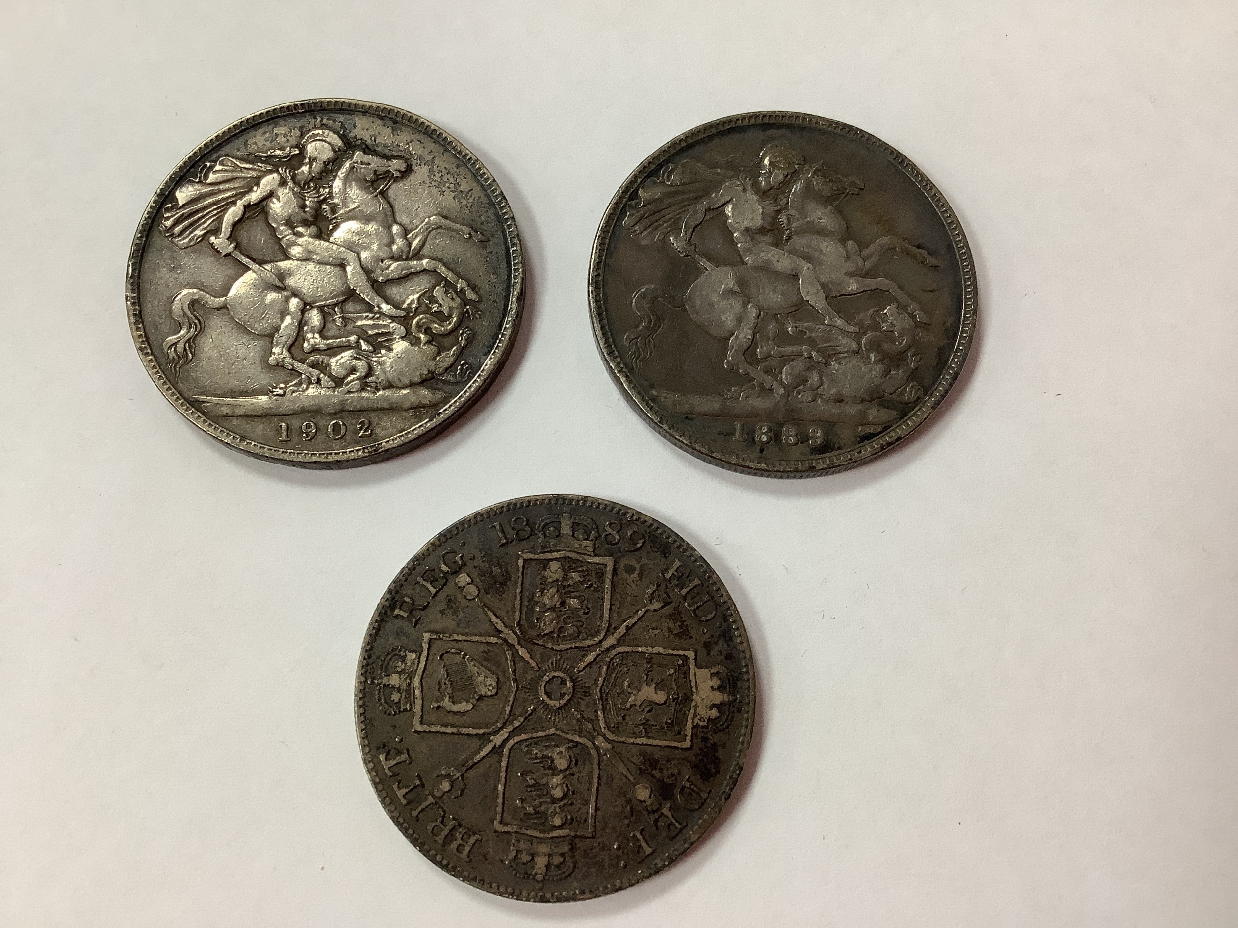 1902 Edward VII Silver Crown, together with a Victoria 1889 Crown and Double Florin.