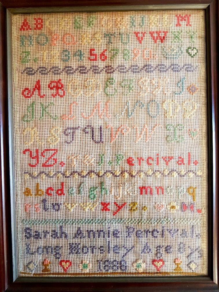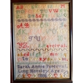 An oak framed and glazed sampler dated 1888 by Sarah Annie Percival of Long Horsley. Measures 14 inches x 19 inches