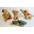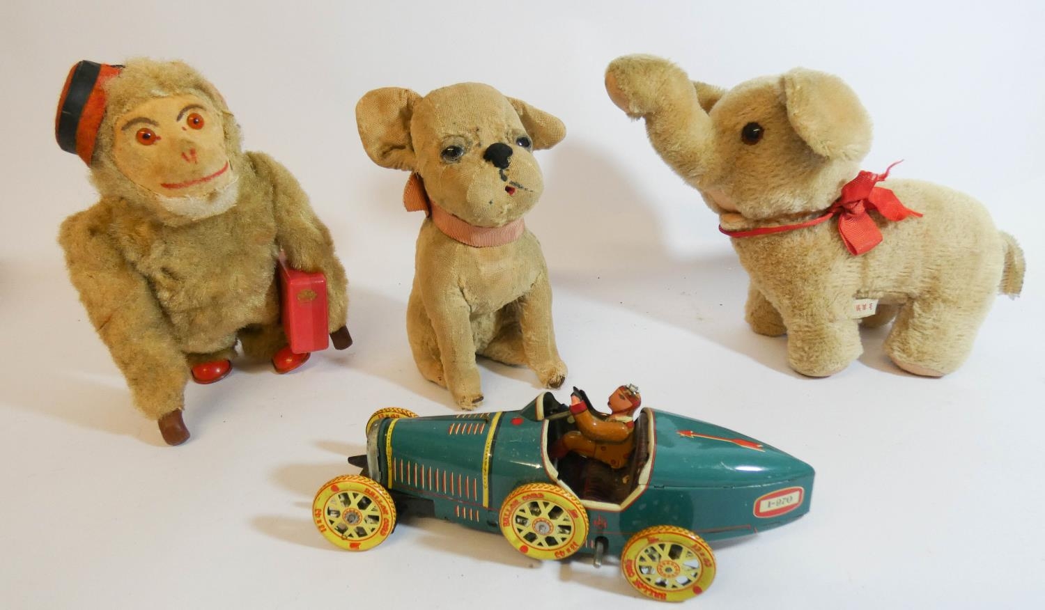 A collection of vintage toys to include, tin plate car and three plush toy animals