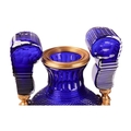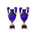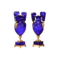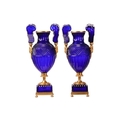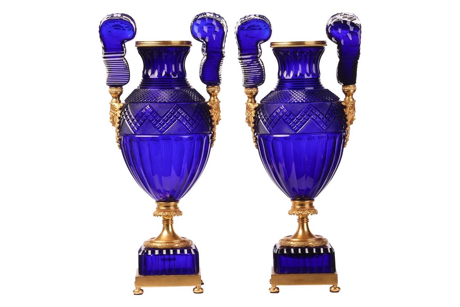 A pair of large cobalt blue faceted and cut glass twin-handled vases, of Neo-classical design with ormolu mounts and masked handles, each on a square base, 63 cm high. Qty: (2)