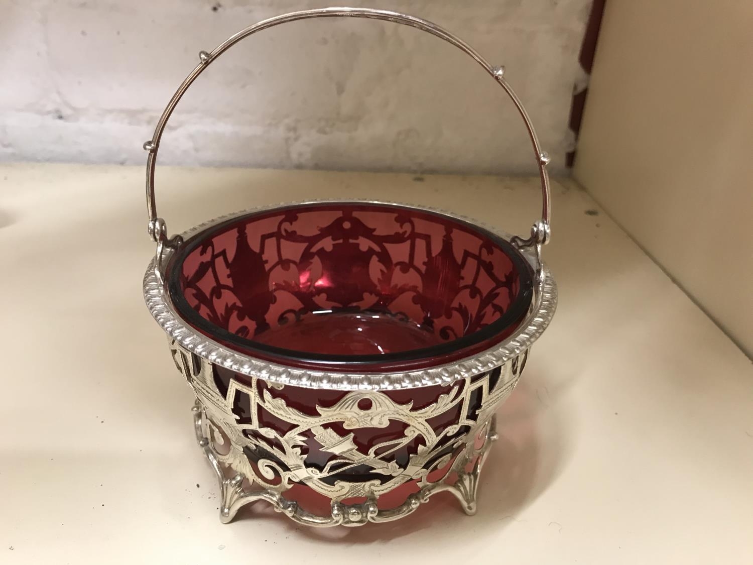 Hall Marked Silver Ornate basket with Cranberry liner by Goldsmiths & Silversmiths, London 1923