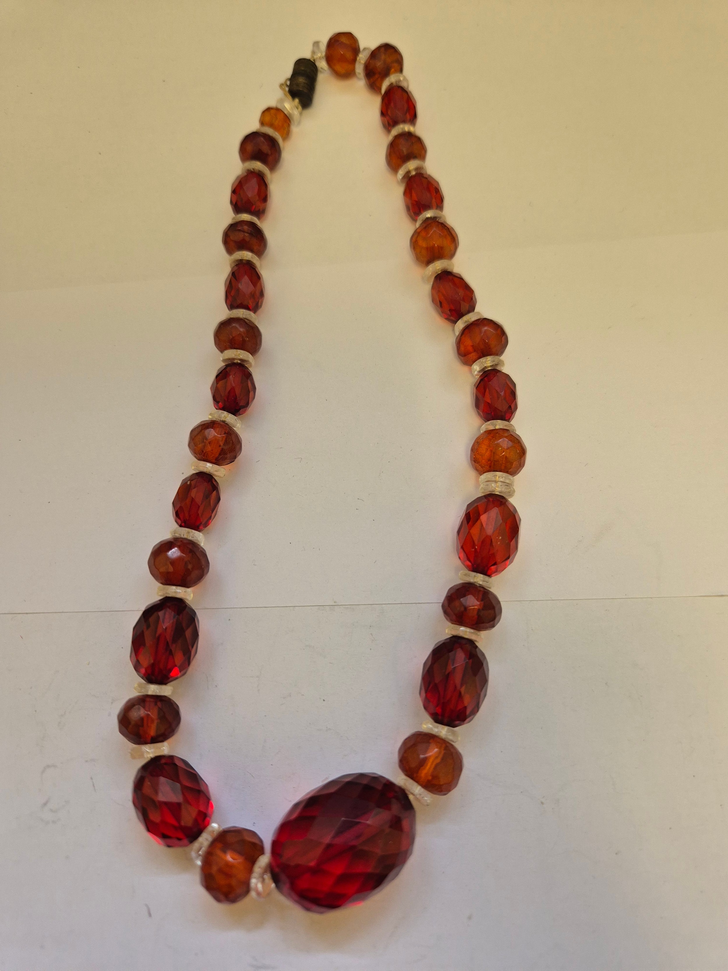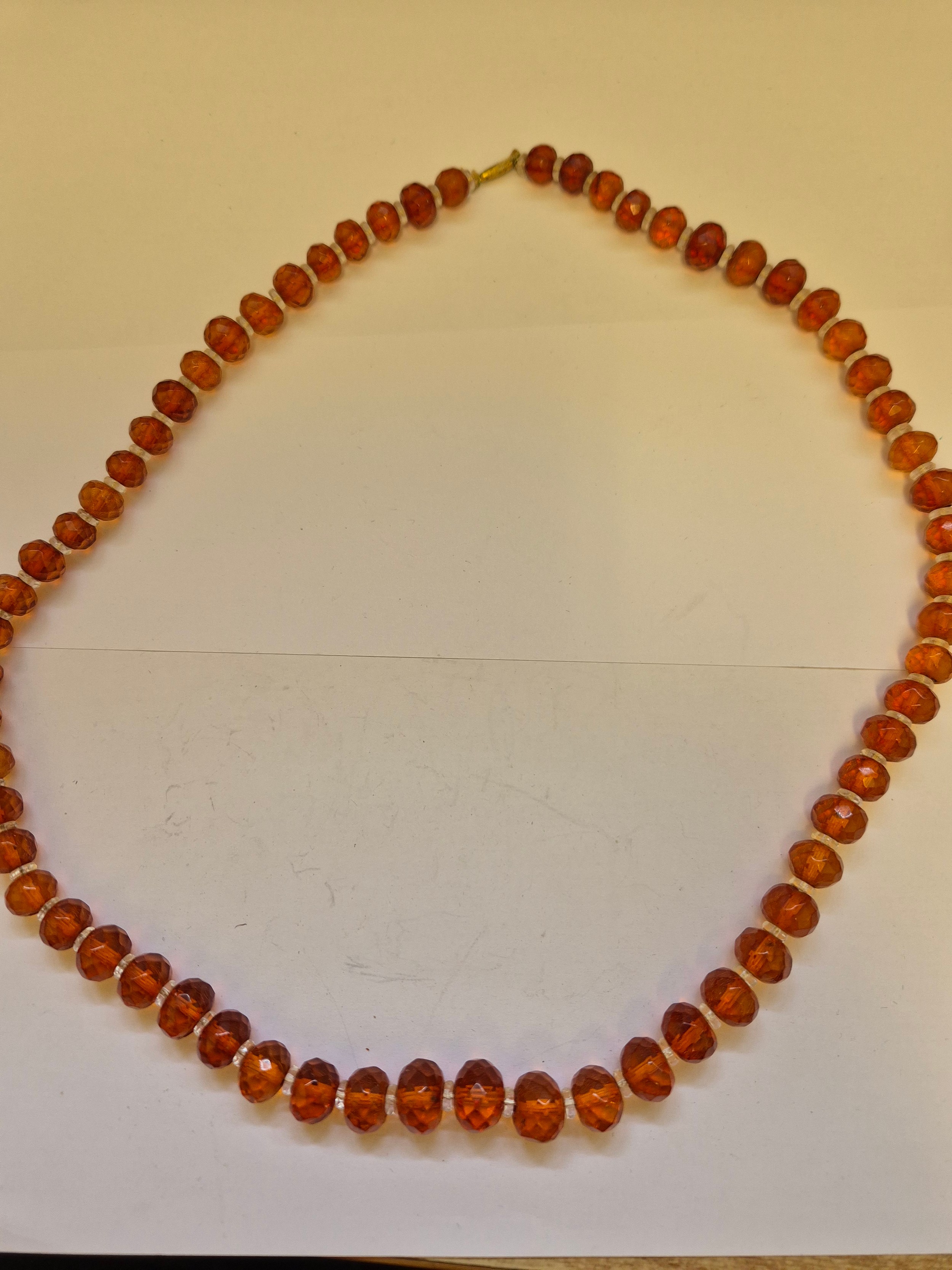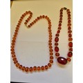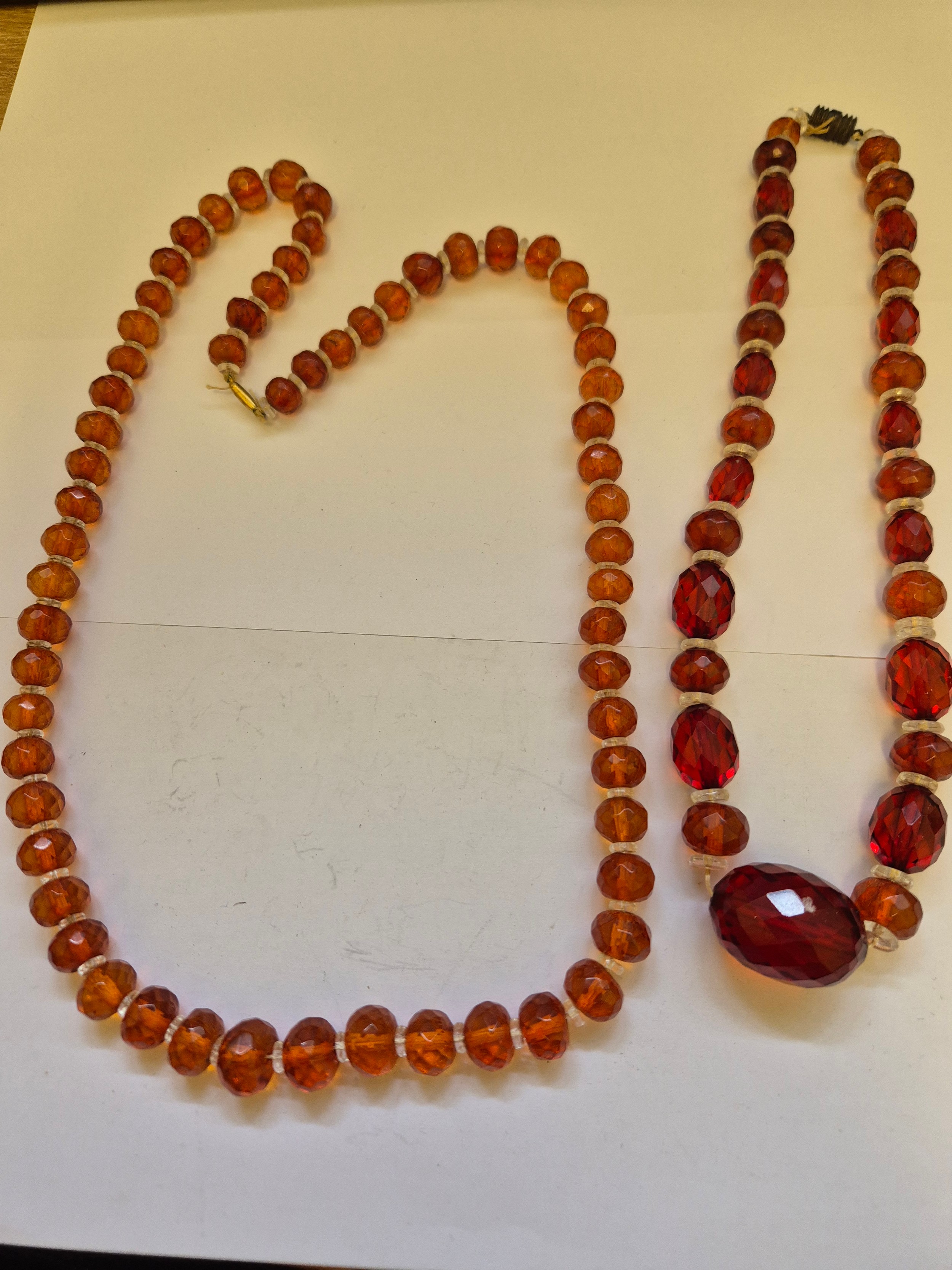 Two circa 1930s faceted amber and glass bead necklaces with barrel clasps. Several of the beads with inclusions. 40cm & 66cm length