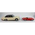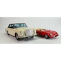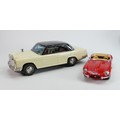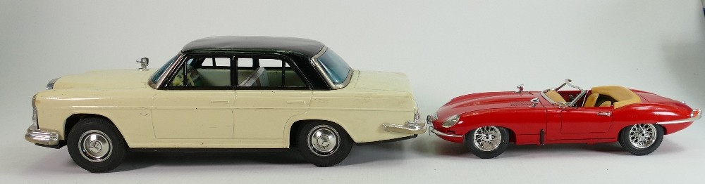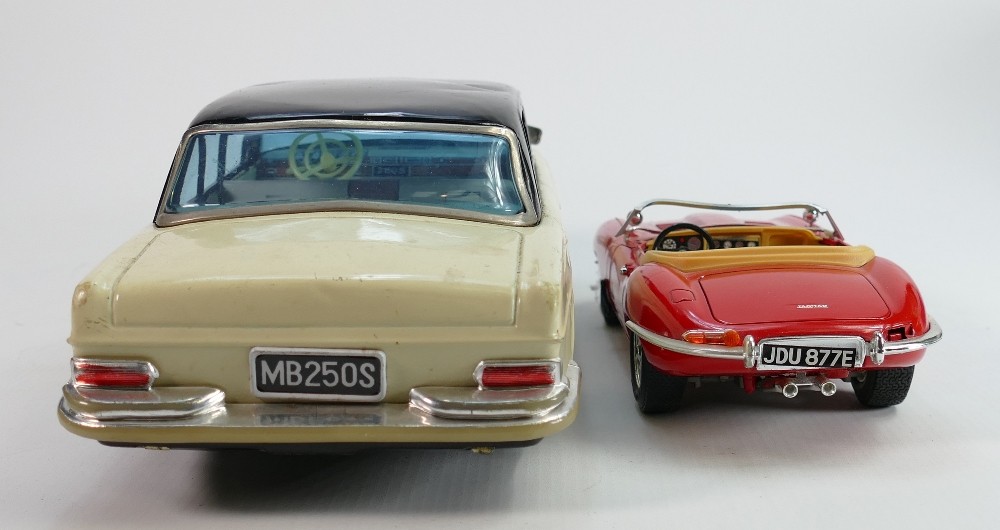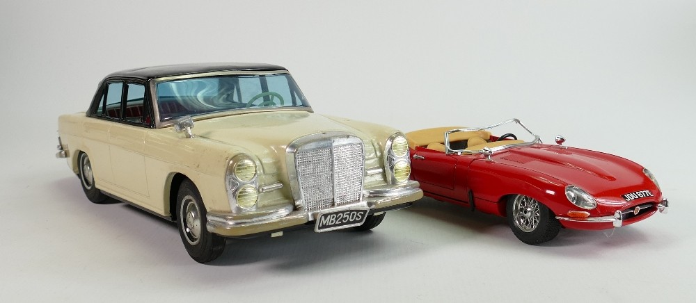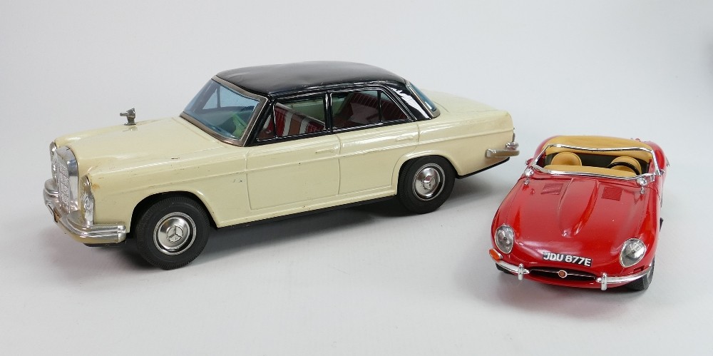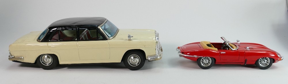 Vintage tin plate models of a Mercedes and Burango model of E type Jaguar (2):