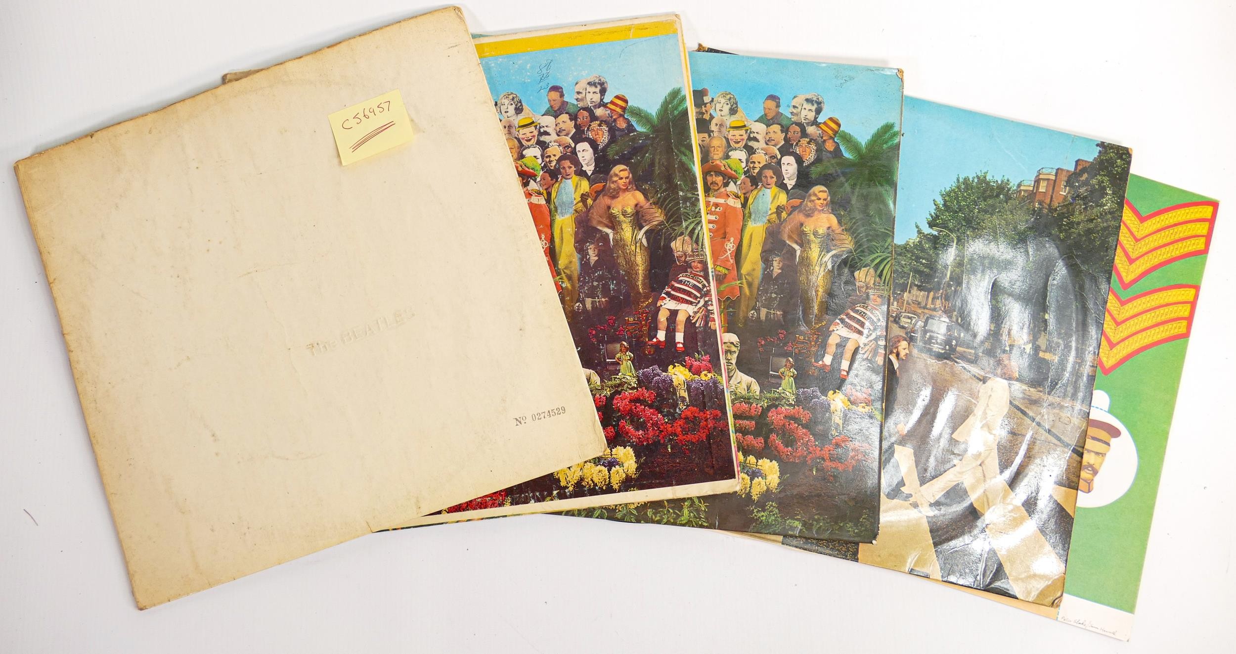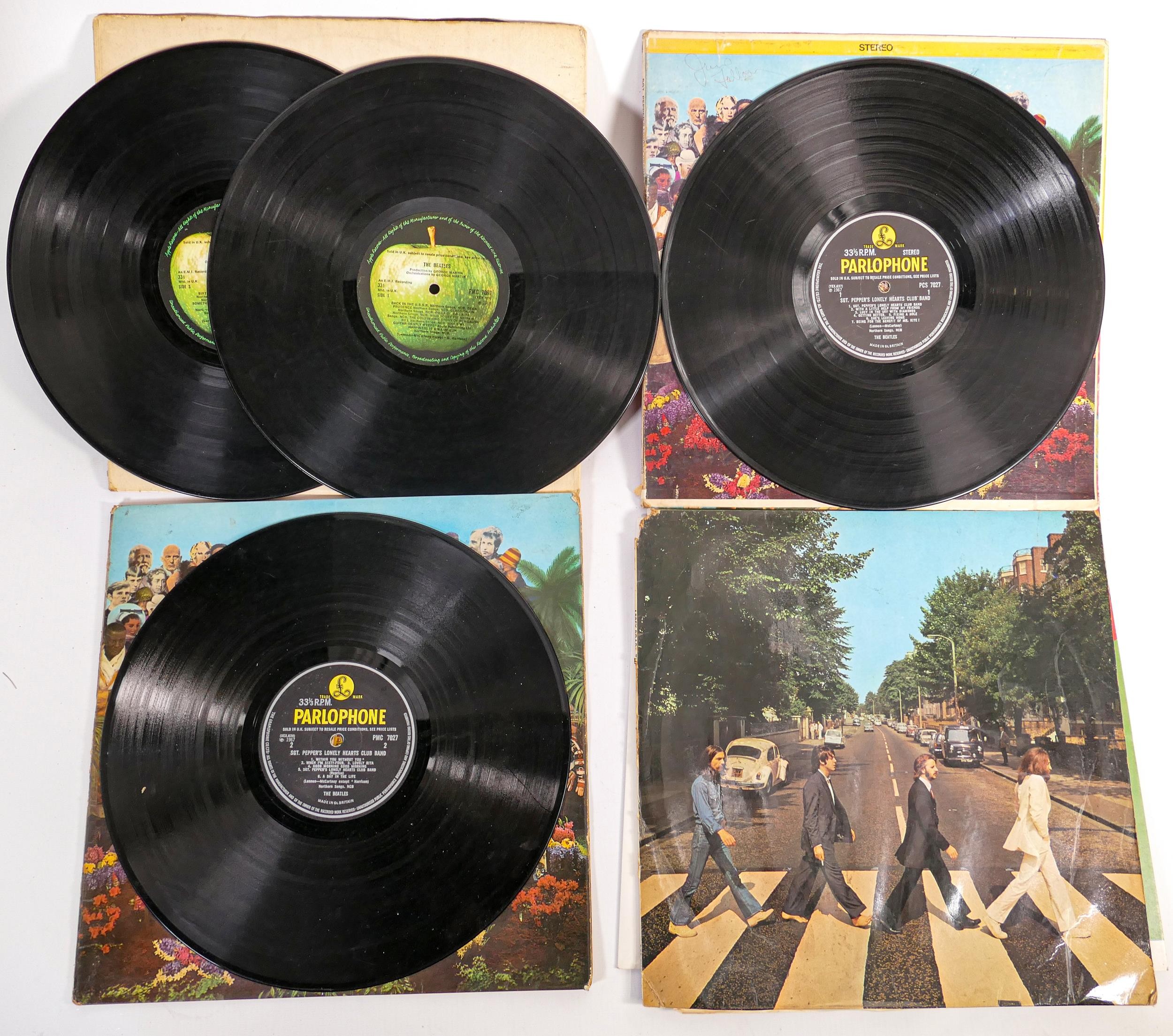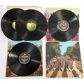 A collection of The Beatles vinyl LPs to include - The White Album No 0274529 PM 7067 & 7068, with 2 posters, Sgt Peppers Stereo (American Sleeve but UK Record) PCS7027, Sgt Peppers Stereo (no inner sleeve) PCS7027 & Abbey Road Stereo PCS7088 (4)