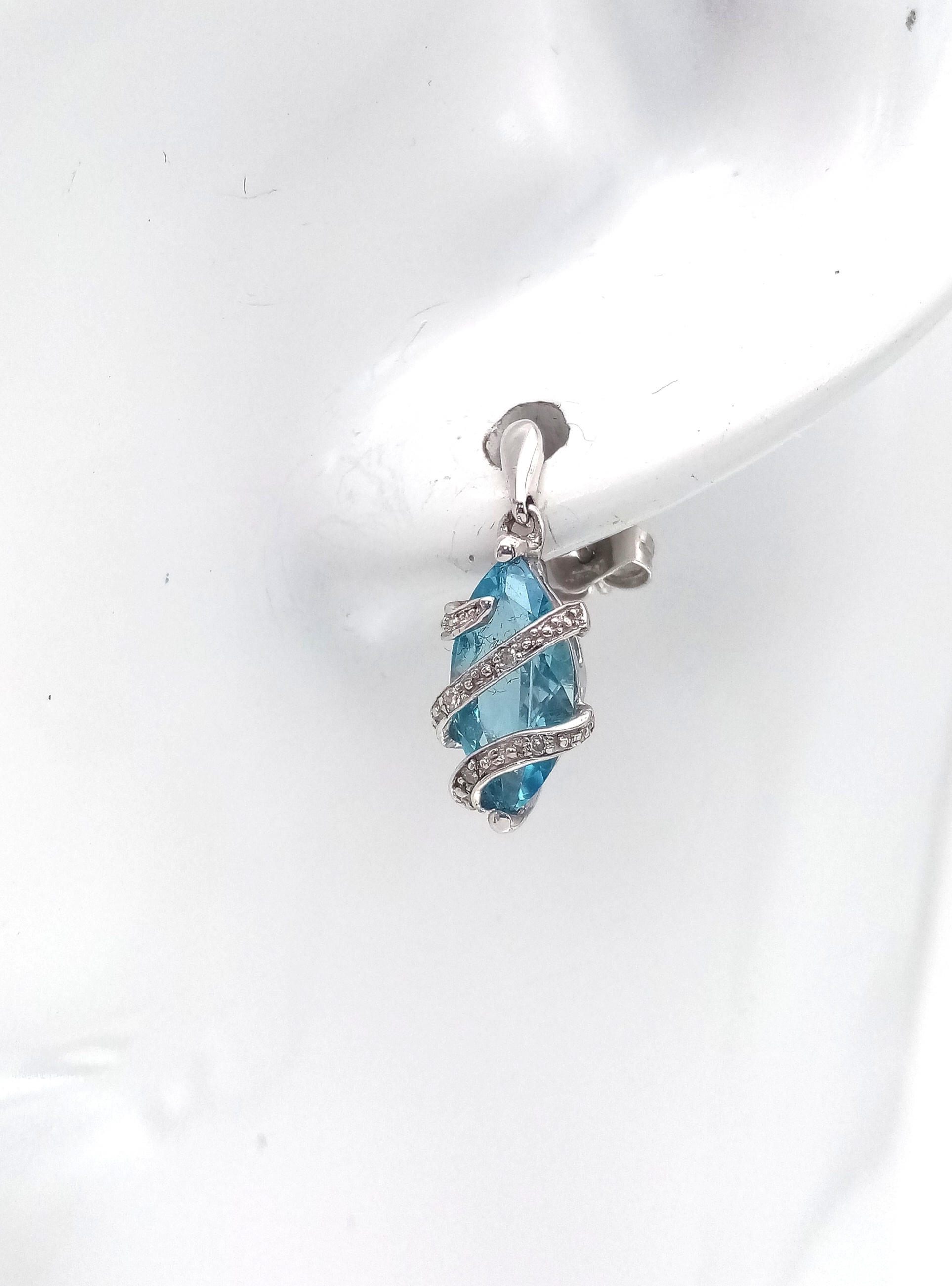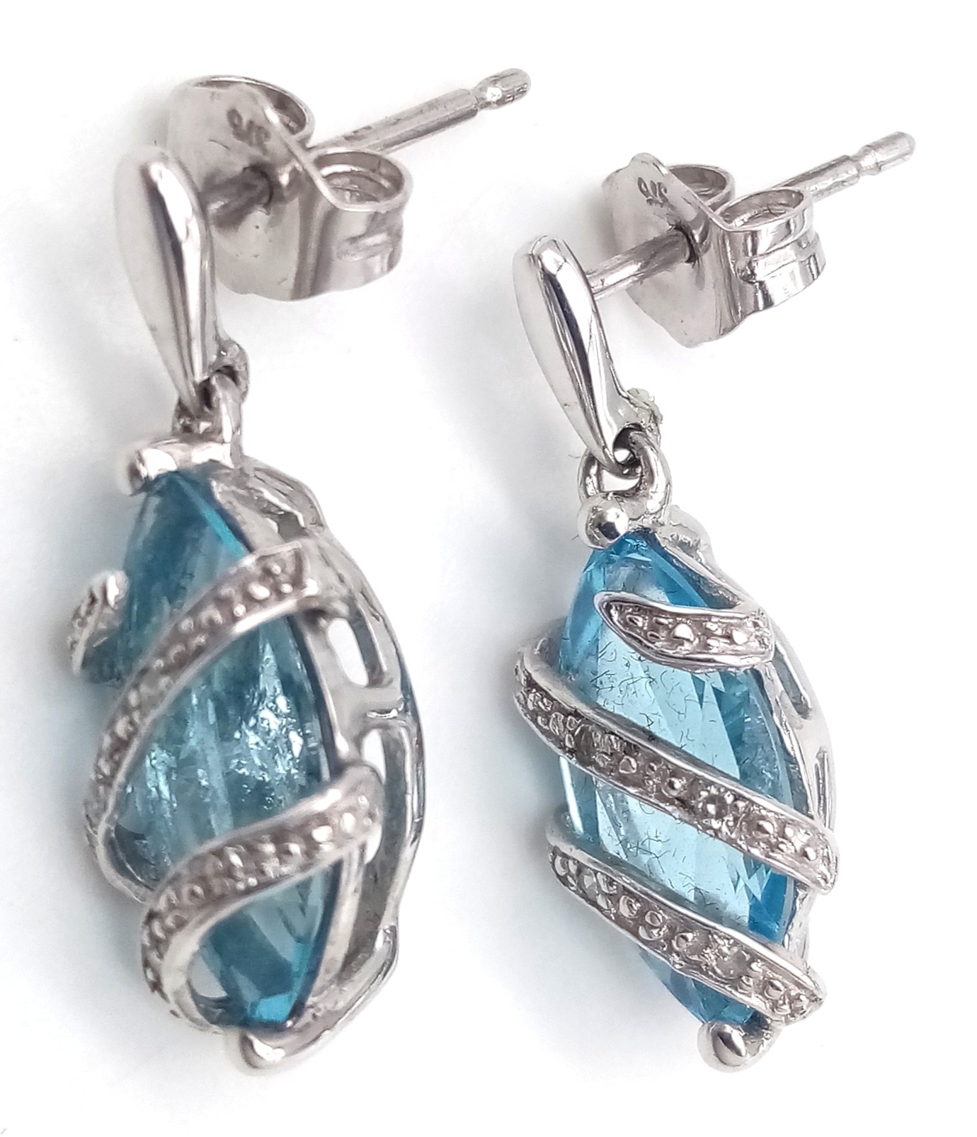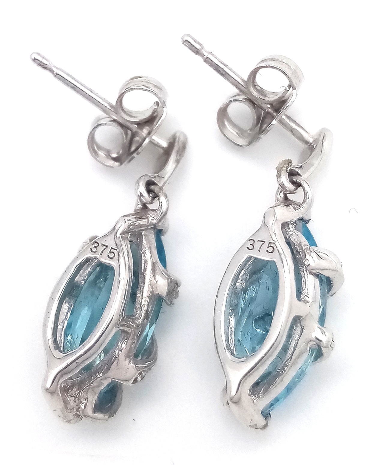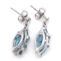 A PAIR OF 9K WHITE GOLD, BLUE TOPAZ AND DIAMOND SET, DROP EARRINGS. 3G. MS RED 1005