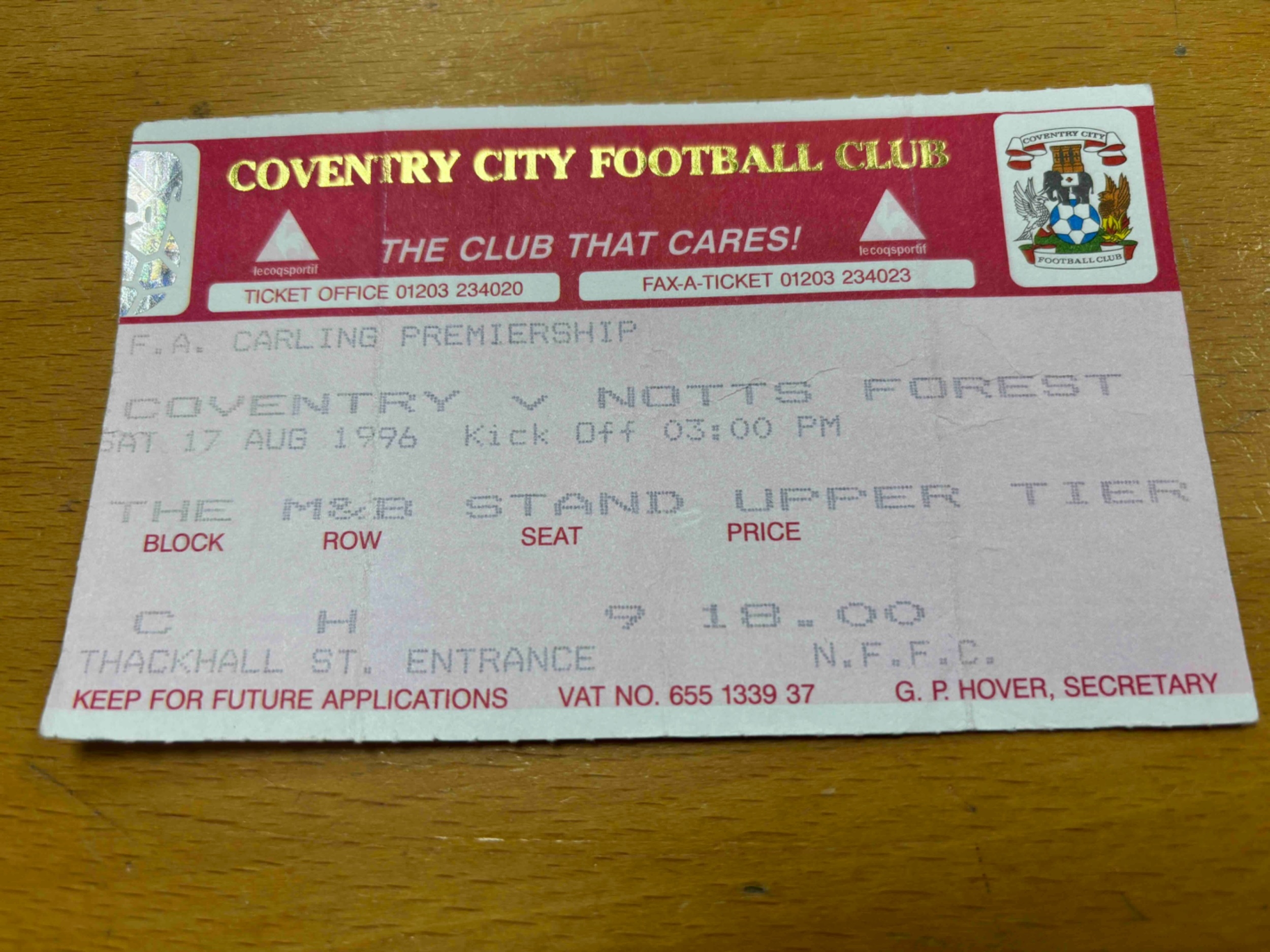 Coventry City Ticket - Home v Nottingham Forest 96/97