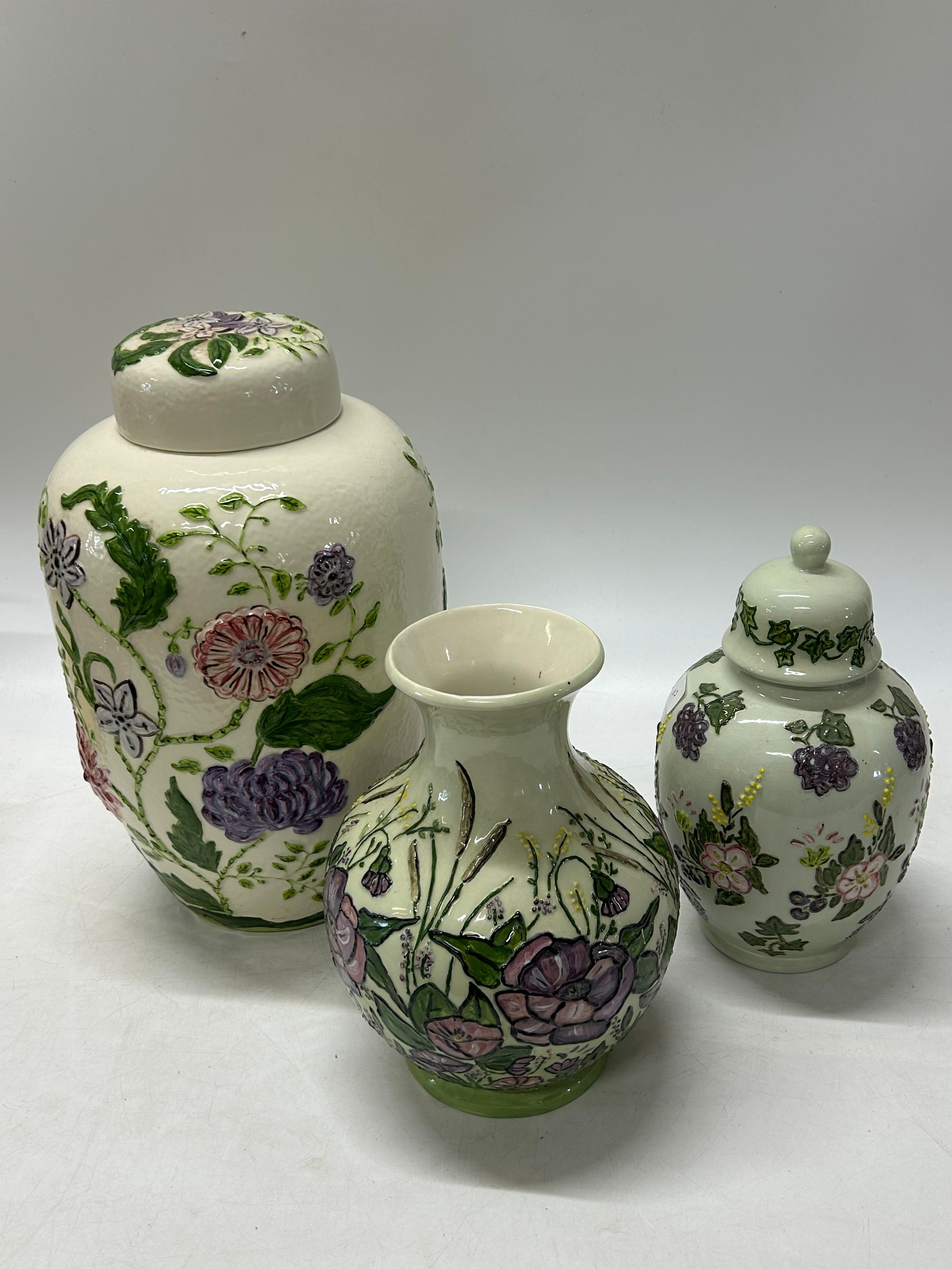 Three Tupton style items comprising:- large covered vase, green ground decorated flowers - 13 1/2in. high, a smaller covered vase decorated blackberries - 10in. high and a vase decorated lilac flowers - 10in. high