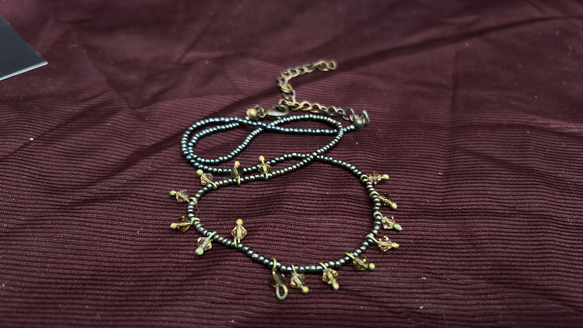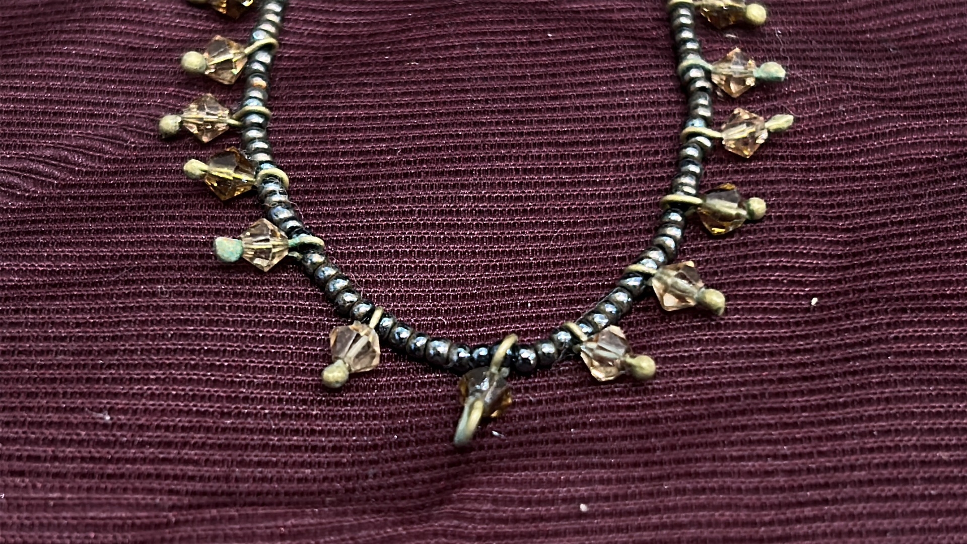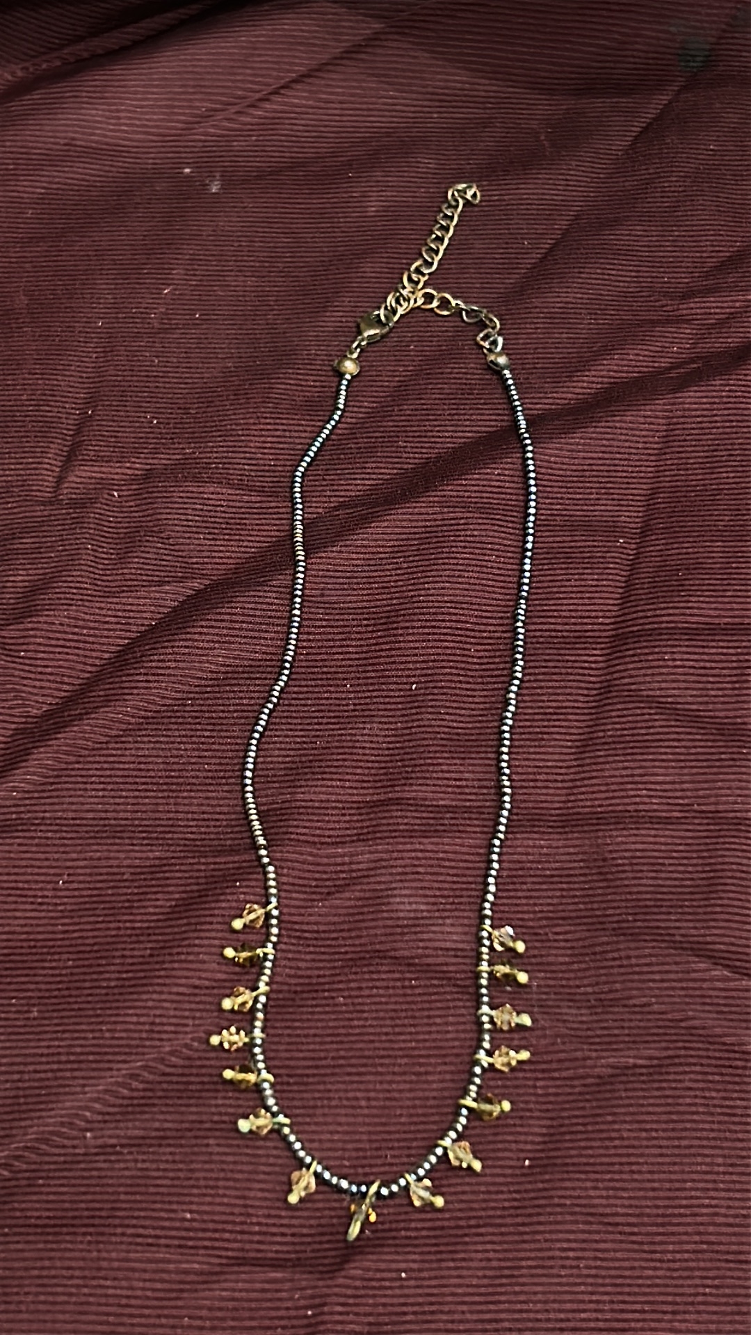 Beaded necklace of black metallic seed beads, accented with amber-coloured faceted glass drop charms and brass-tone findings, fitted with lobster clasp and extender chain.