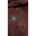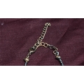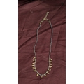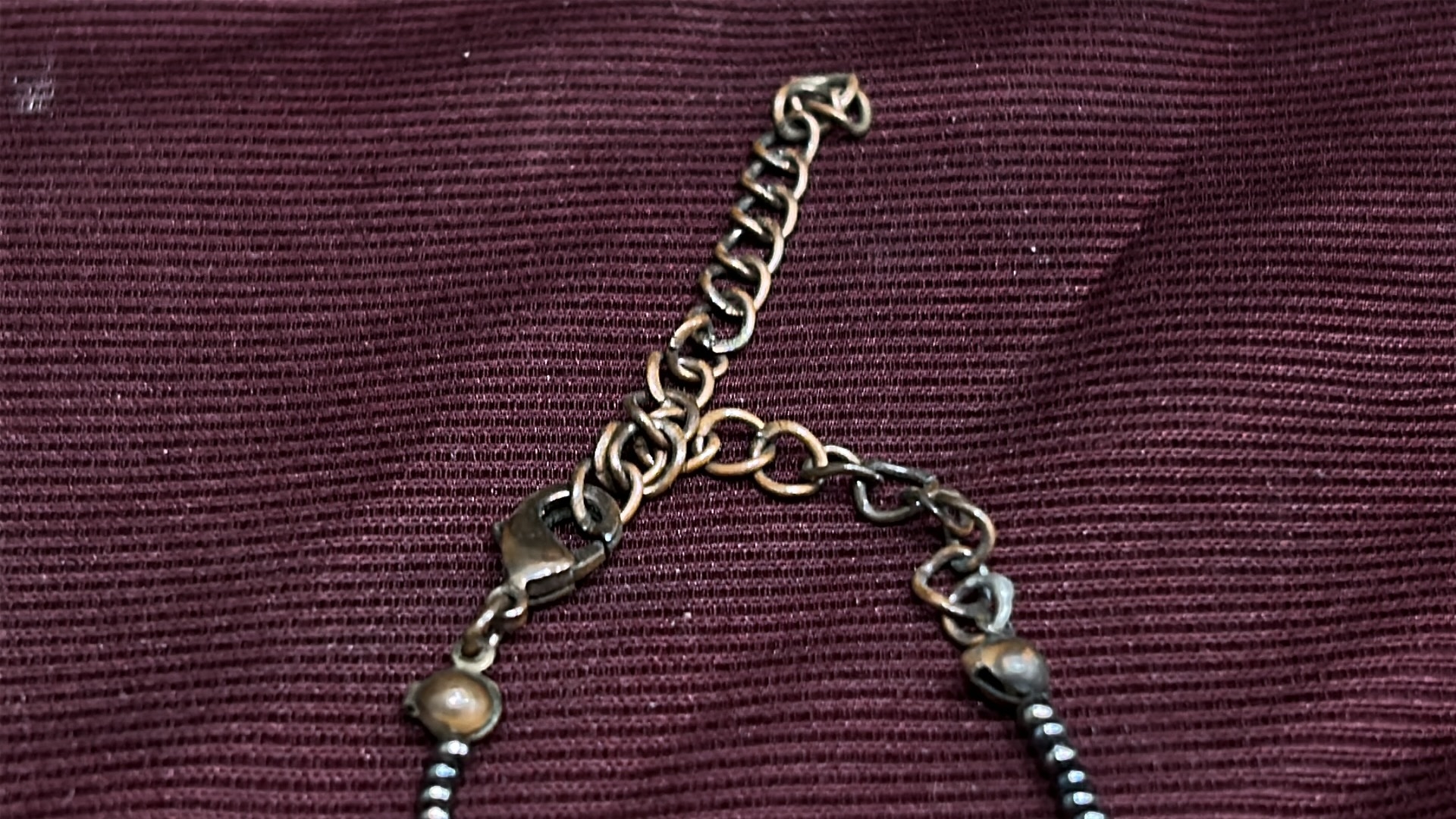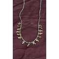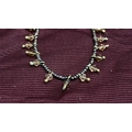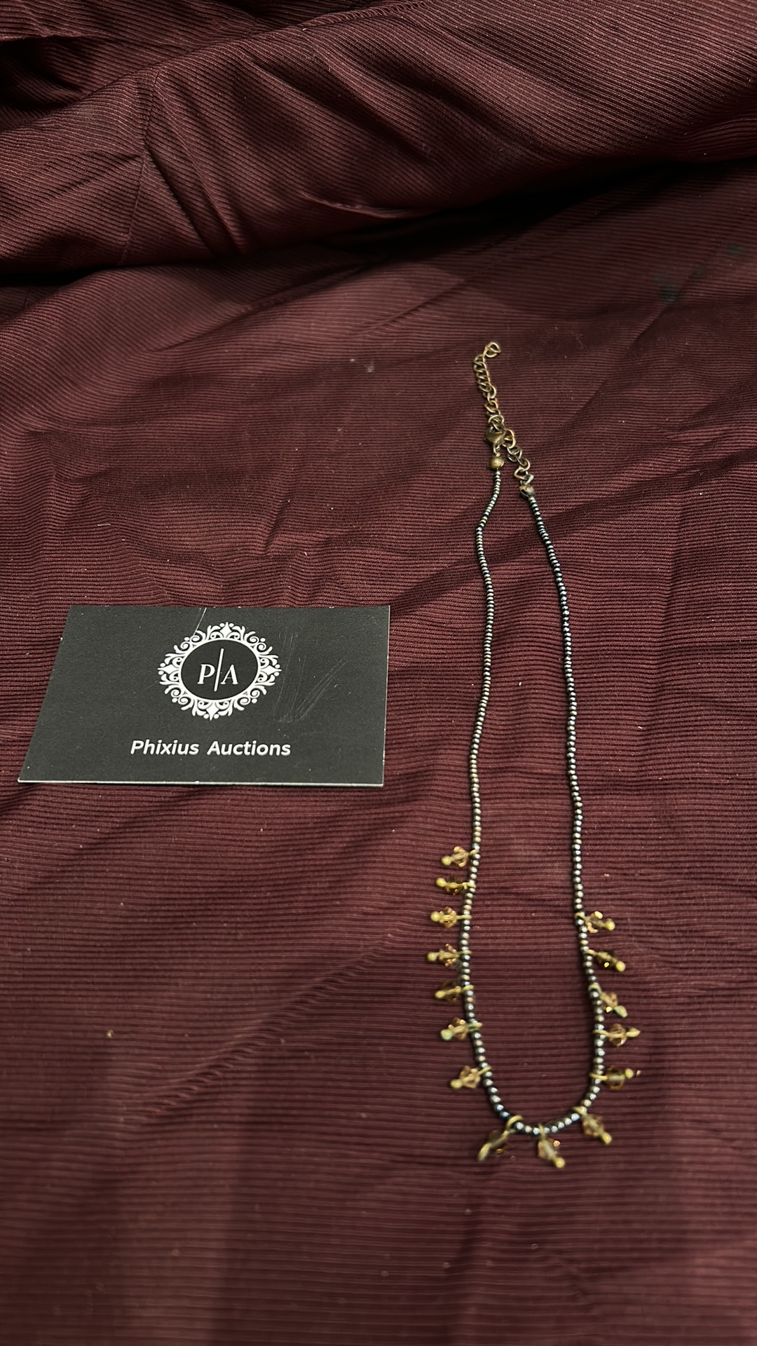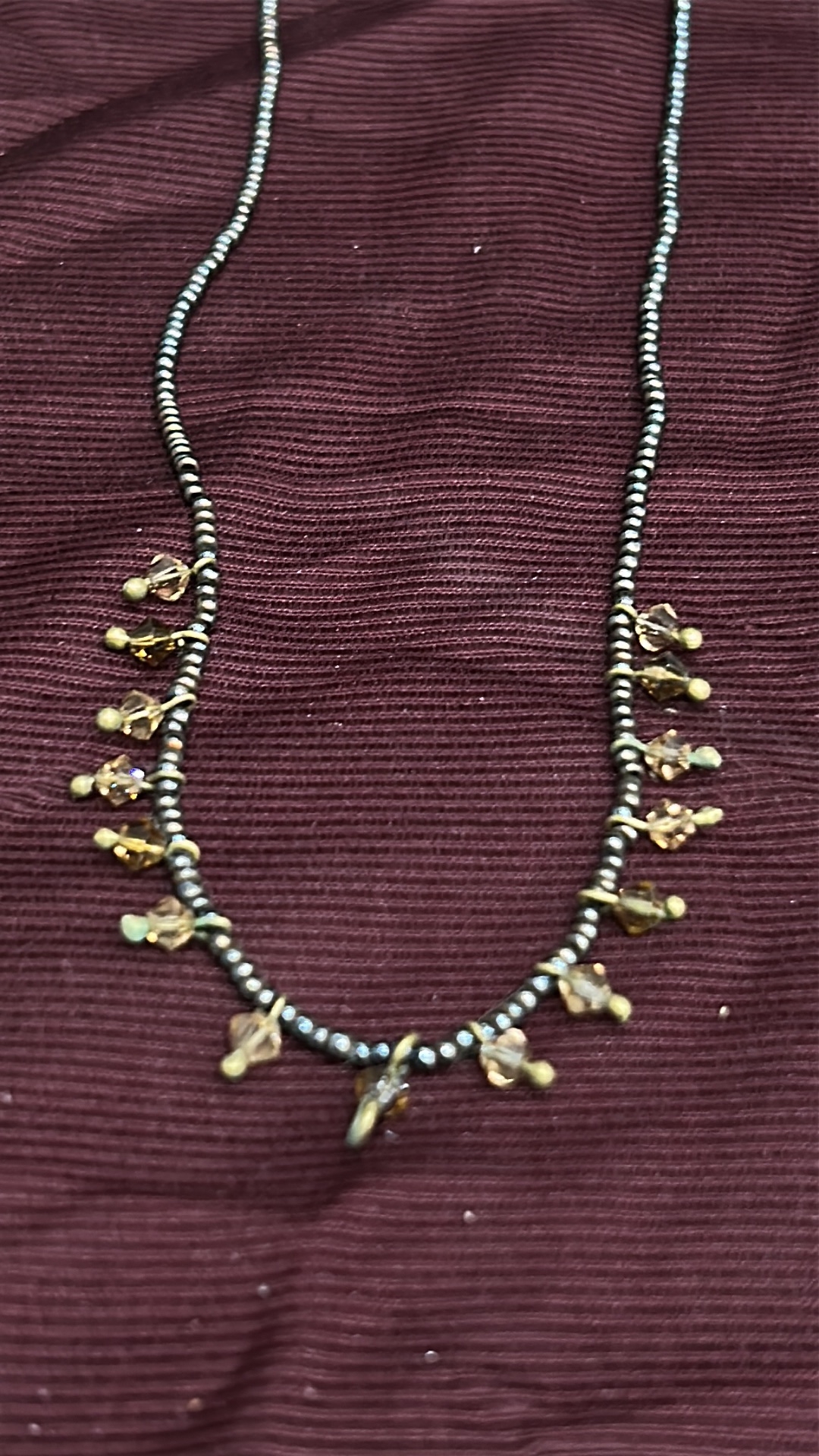 Beaded necklace of black metallic seed beads, accented with amber-coloured faceted glass drop charms and brass-tone findings, fitted with lobster clasp and extender chain.