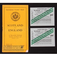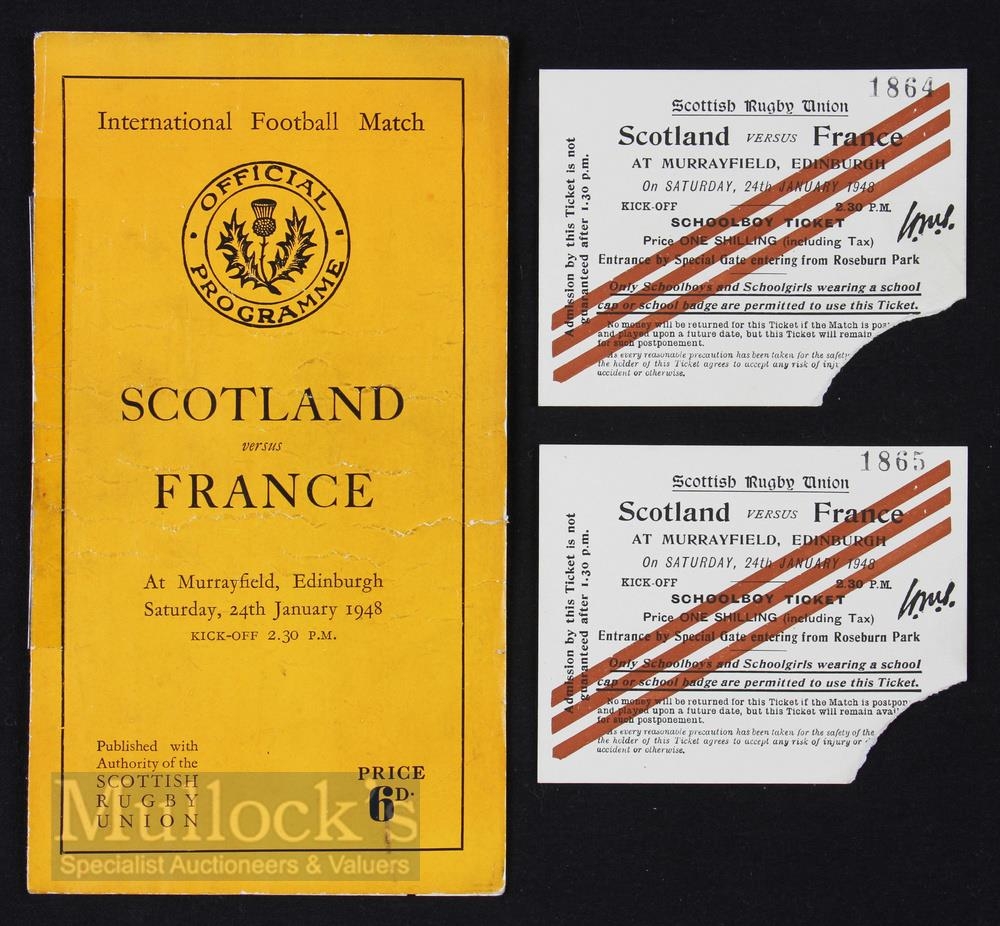 1948 Scotland v France Rugby Programme/Tickets (3): The game v France and in their first official Murrayfield post-war test. Lovely choice of both old and new team pics. Some creasing & spine tape, but two lovely corner-ripped for entry schoolchild tickets included. Good or better