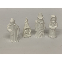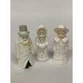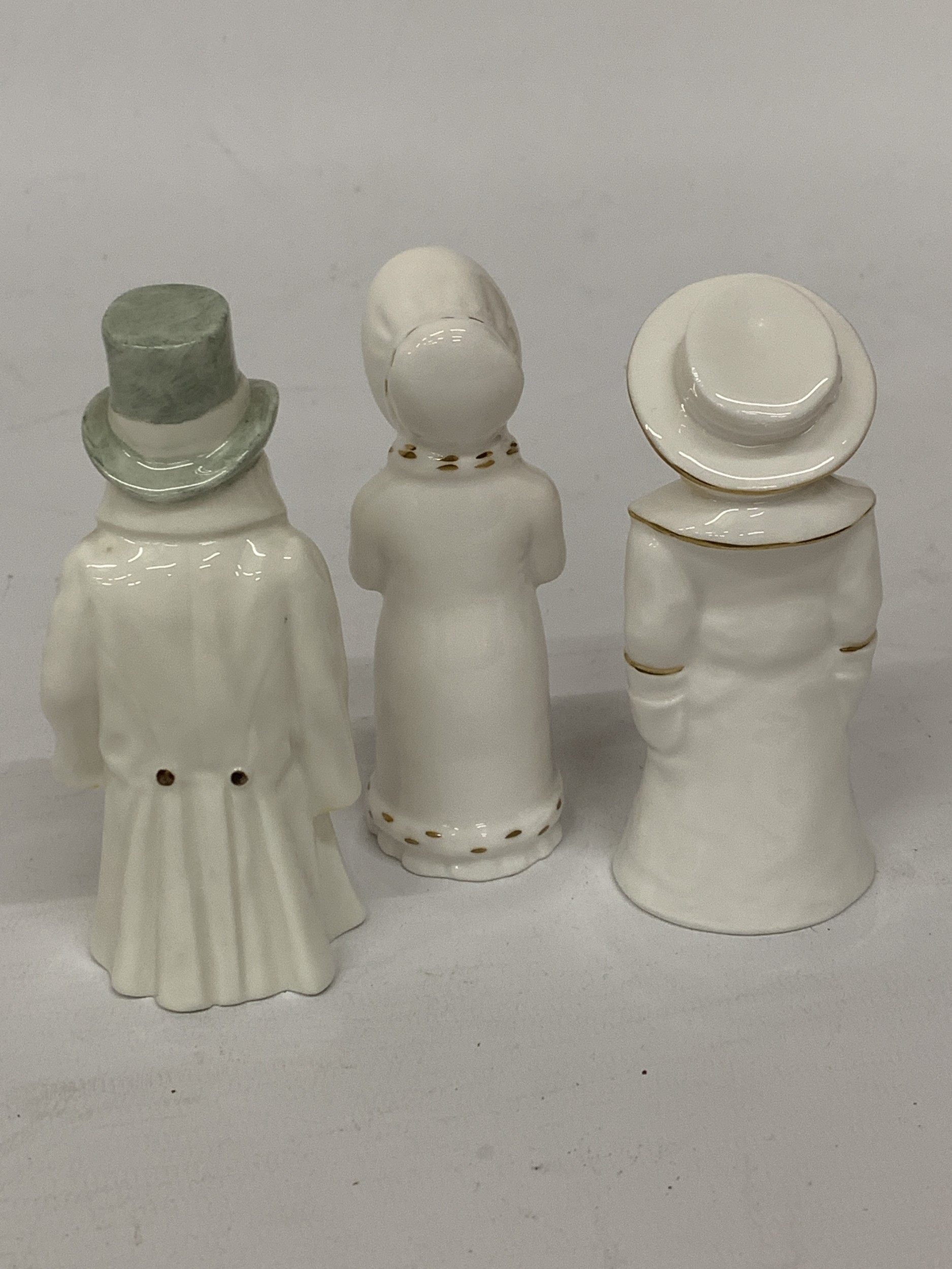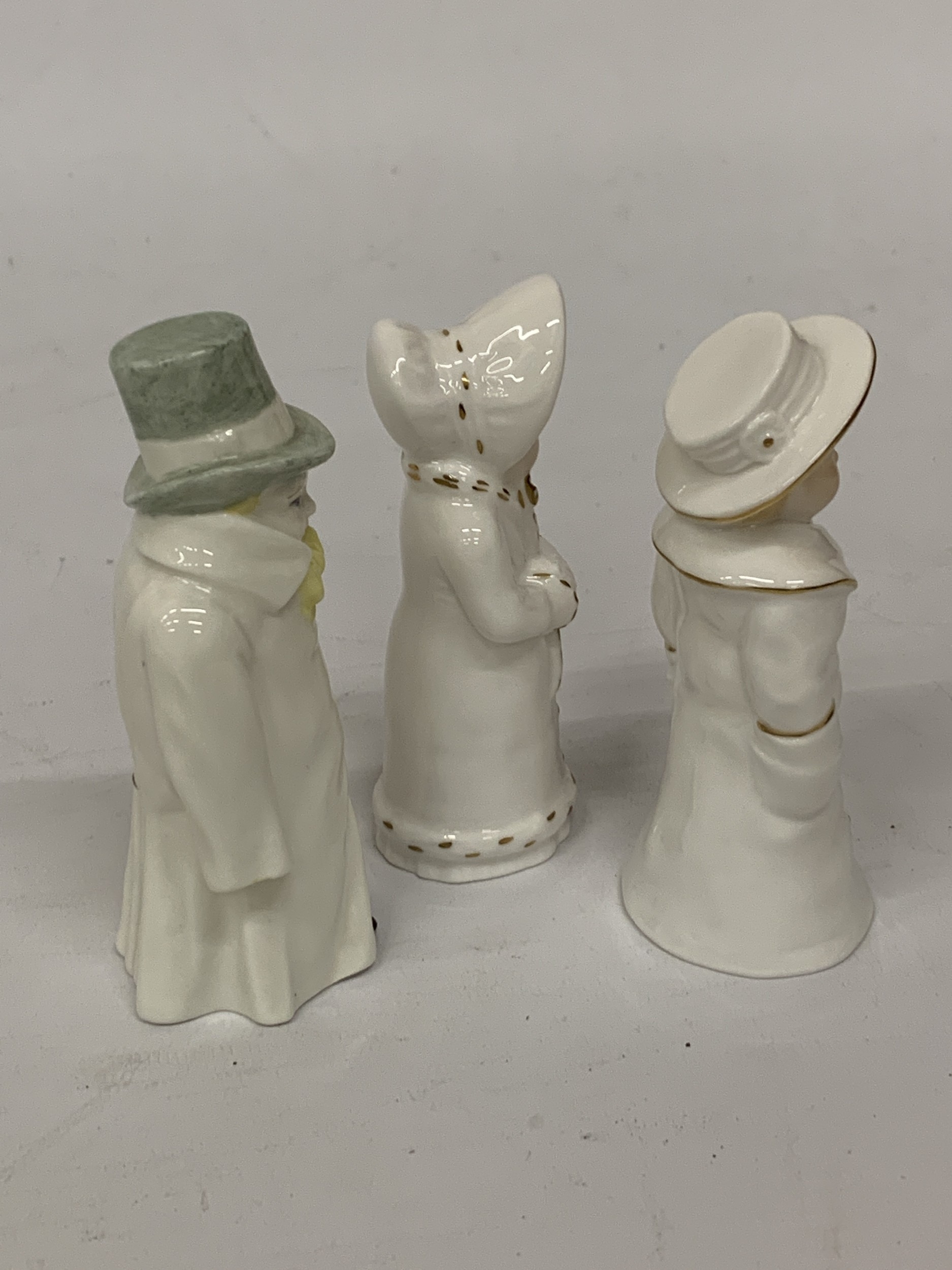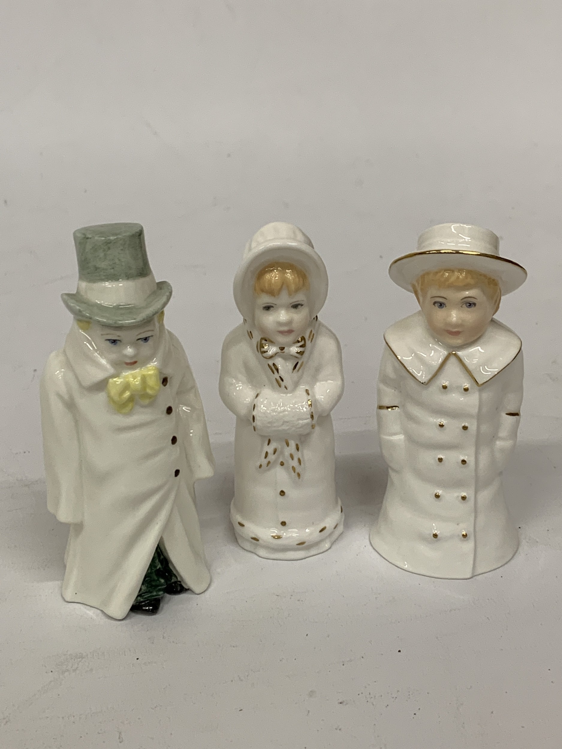 THREE ROYAL WORCESTER CANDLE SNUFFERS, BOY WITH BOATER, BUDGE AND GIRL WITH MUFF