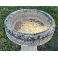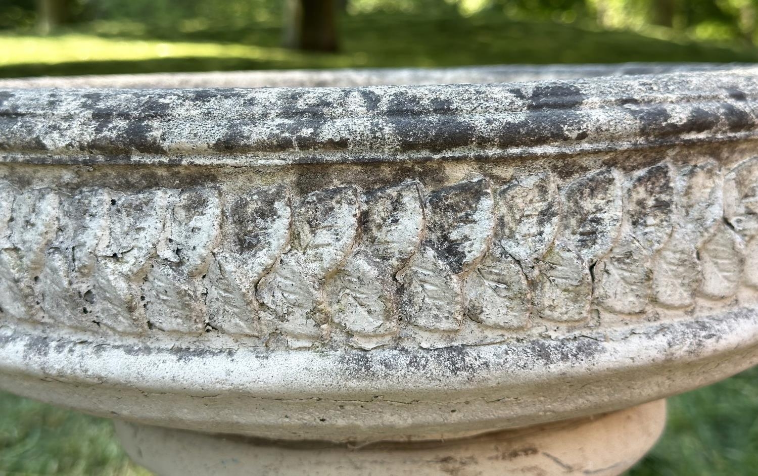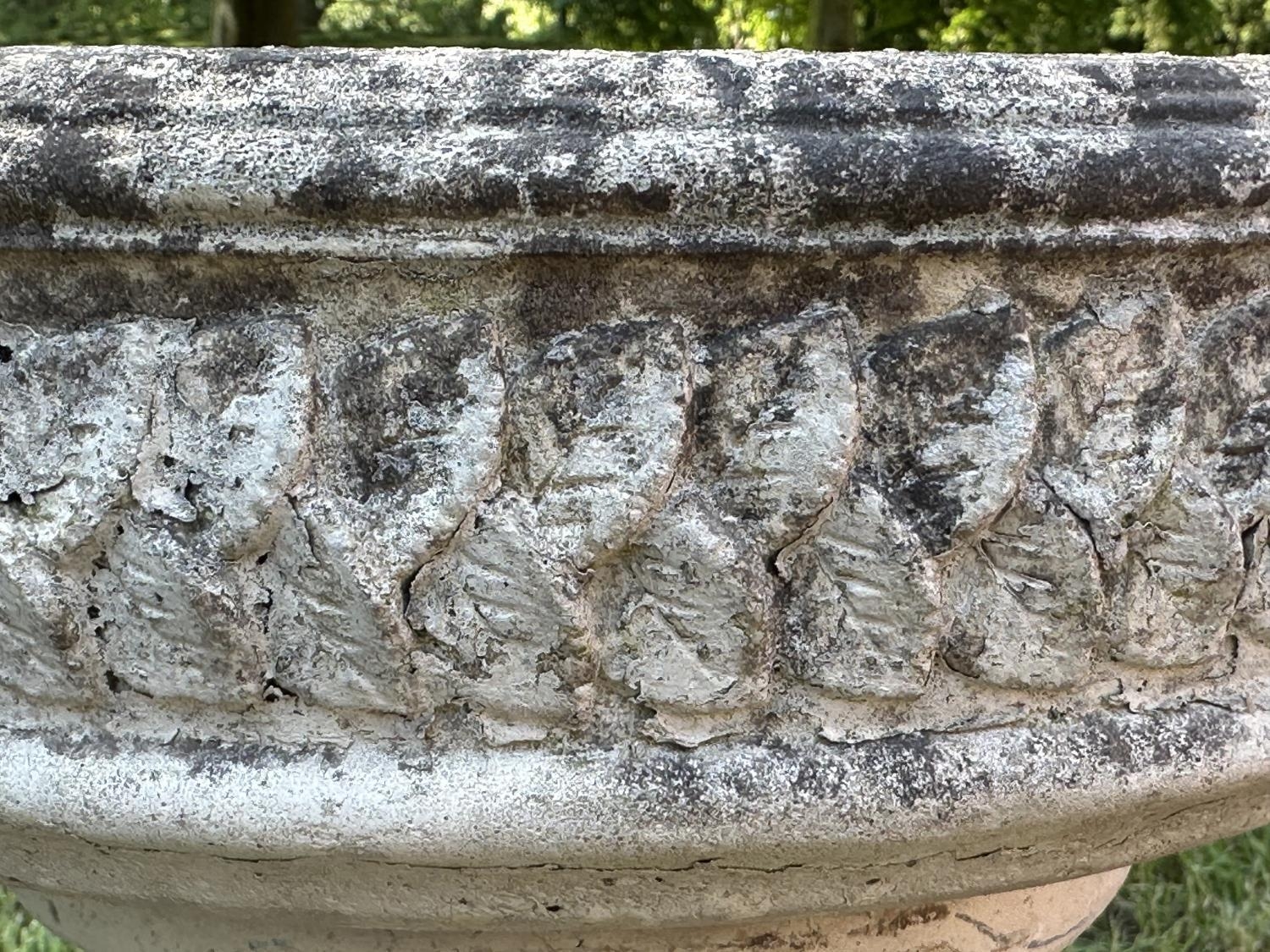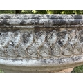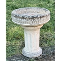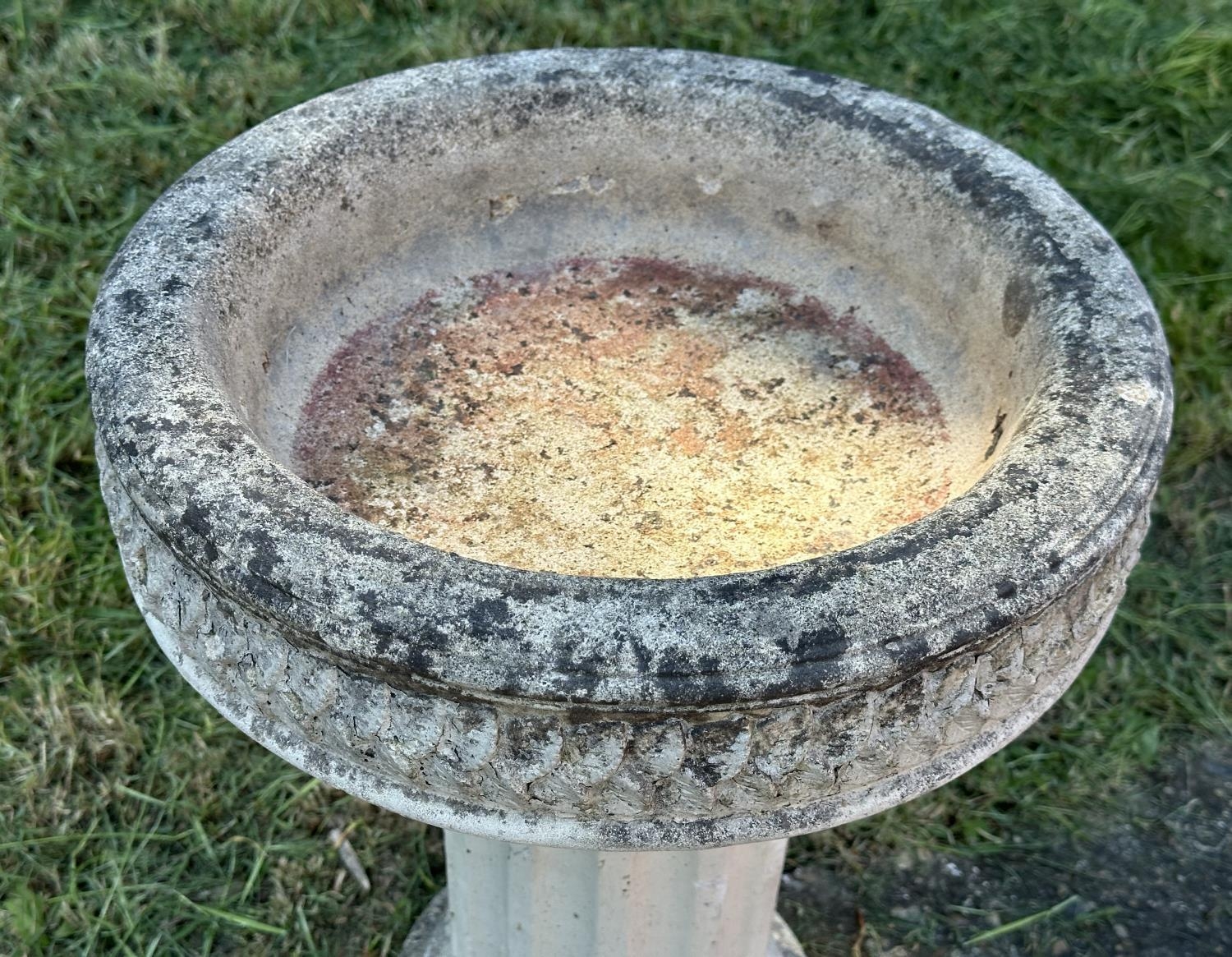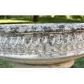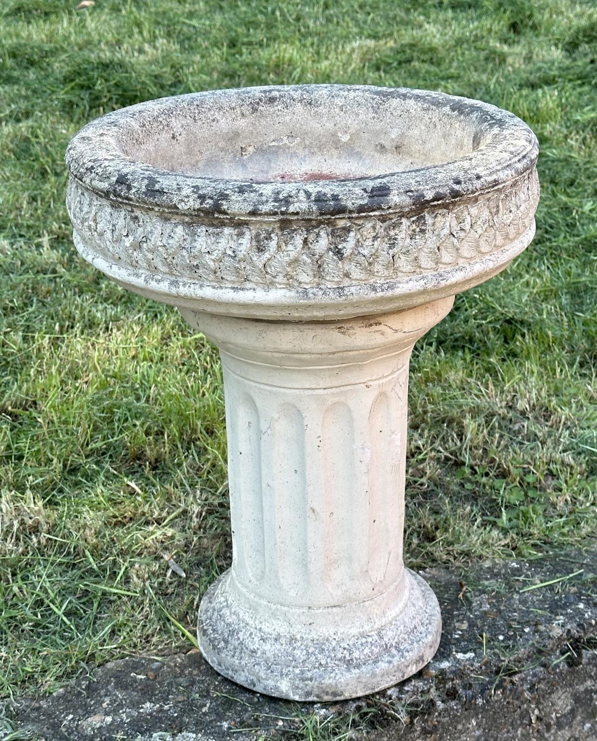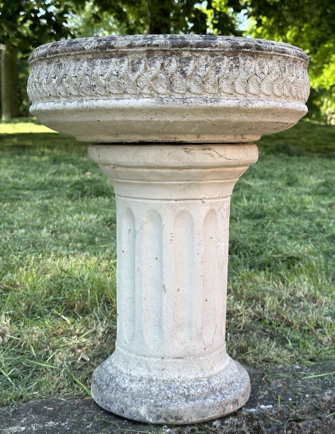GARDEN STAND, weathered reconstituted stone circular with carved edge on fluted column support, 49cm H x 39cm D.