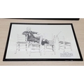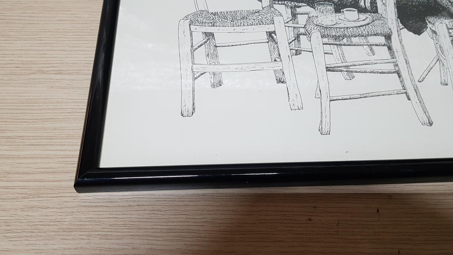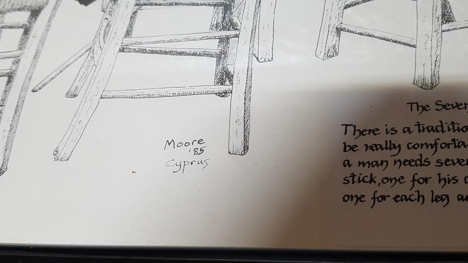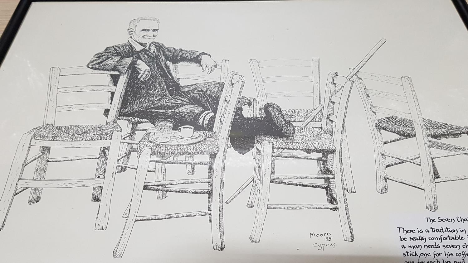 "The Seven Chairs" Sketch with Ink by Moore '85 Cyprus "Traditional Comfortable in Cyprus Coffee Shop" in Black Frame (52cm x 37cm)
