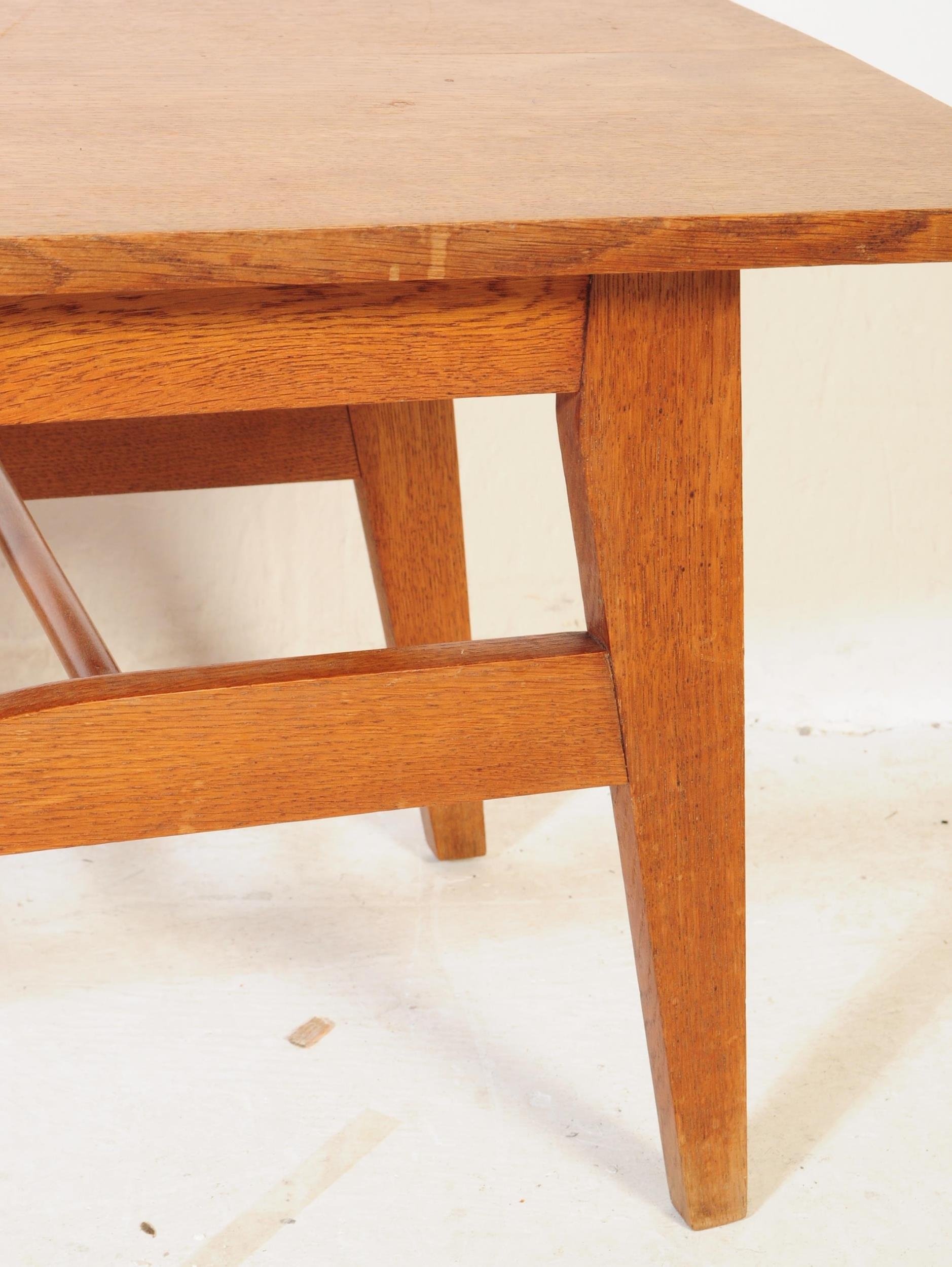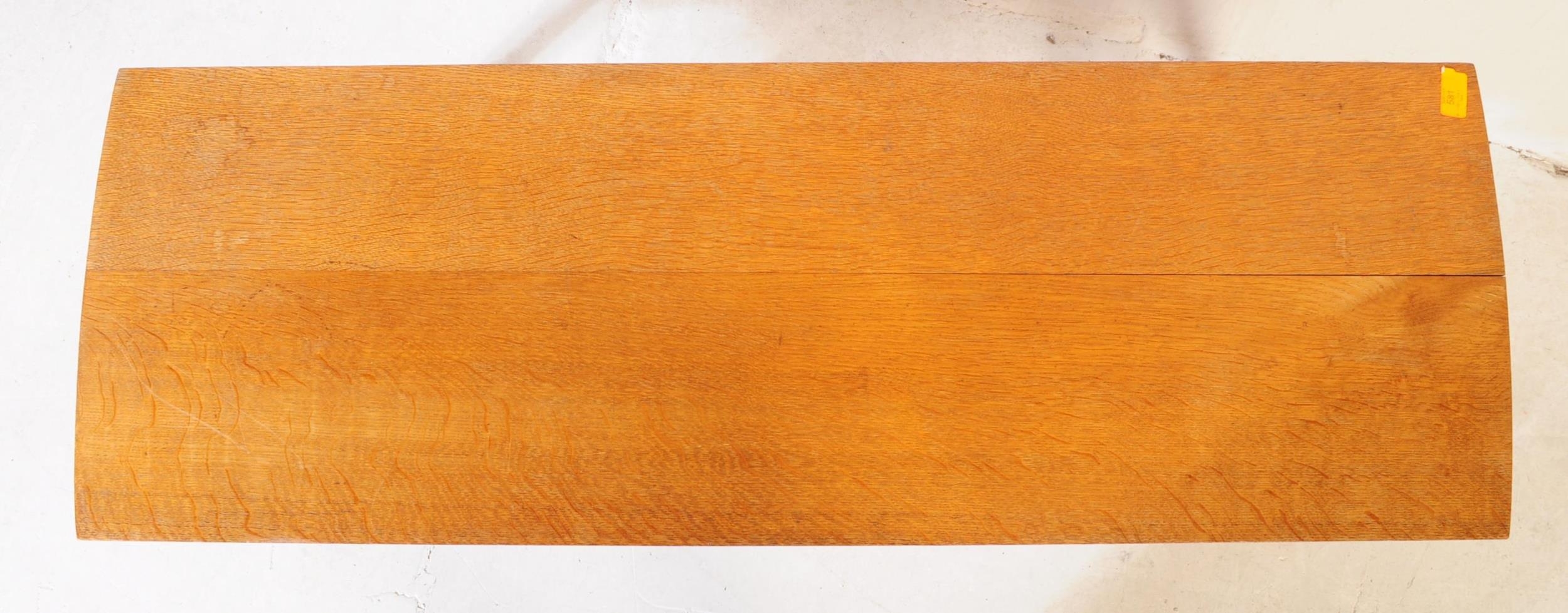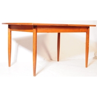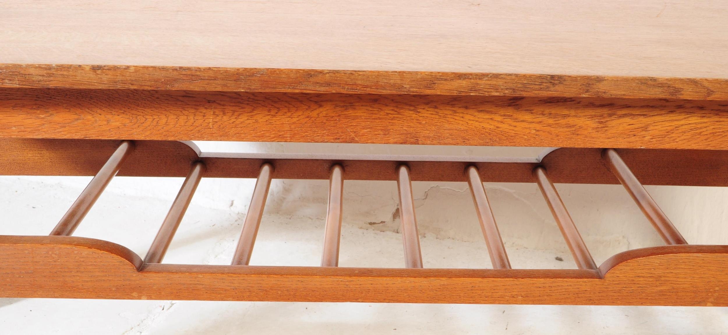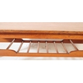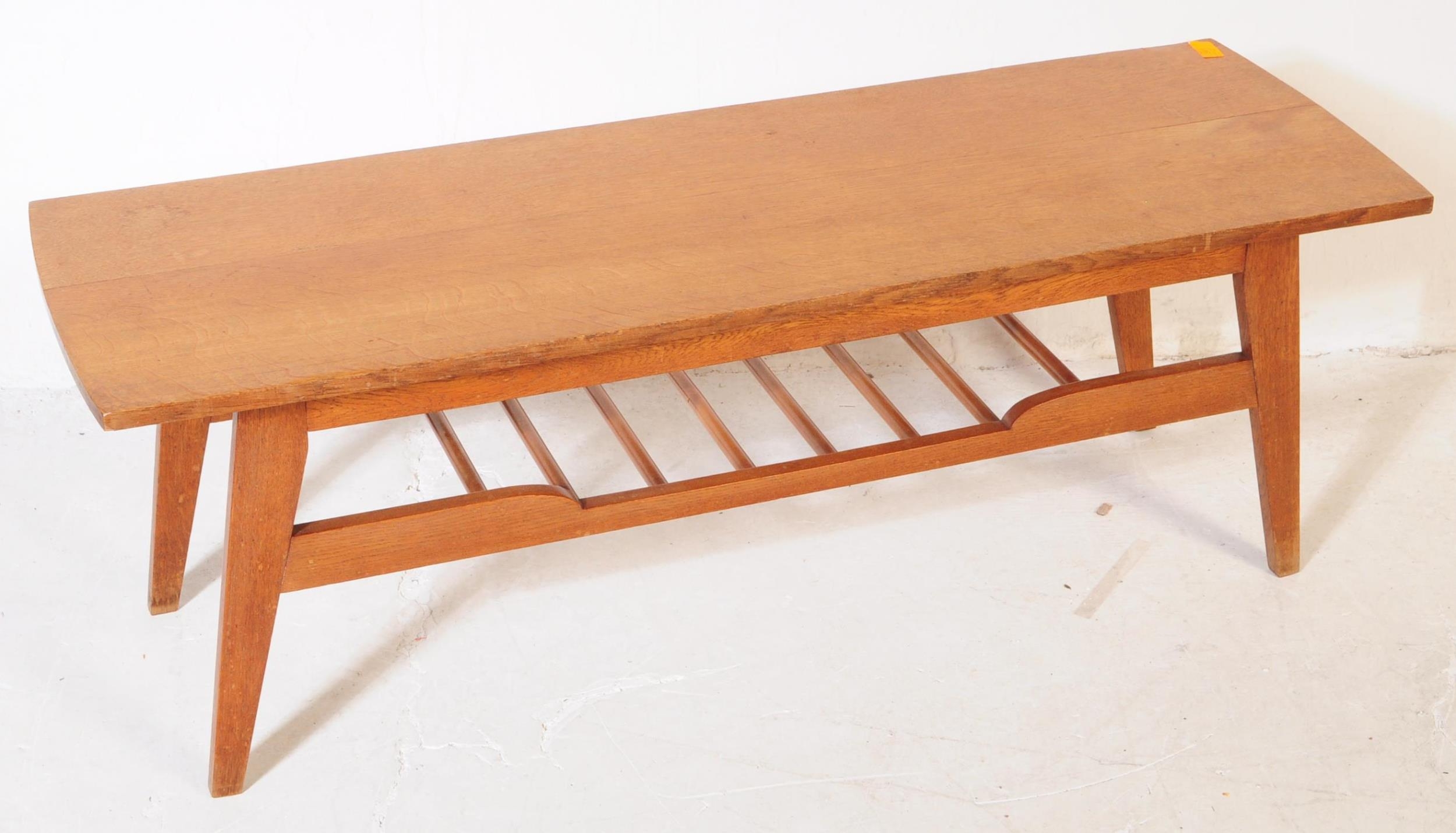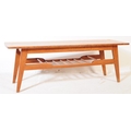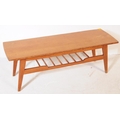 British Modern Design - A mid 20th century circa 1960s teak Long John coffee table having shaped top over rail under tier, raised over squared tapering supports. Measures approx. 40cm x 115cm x 39cm.