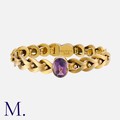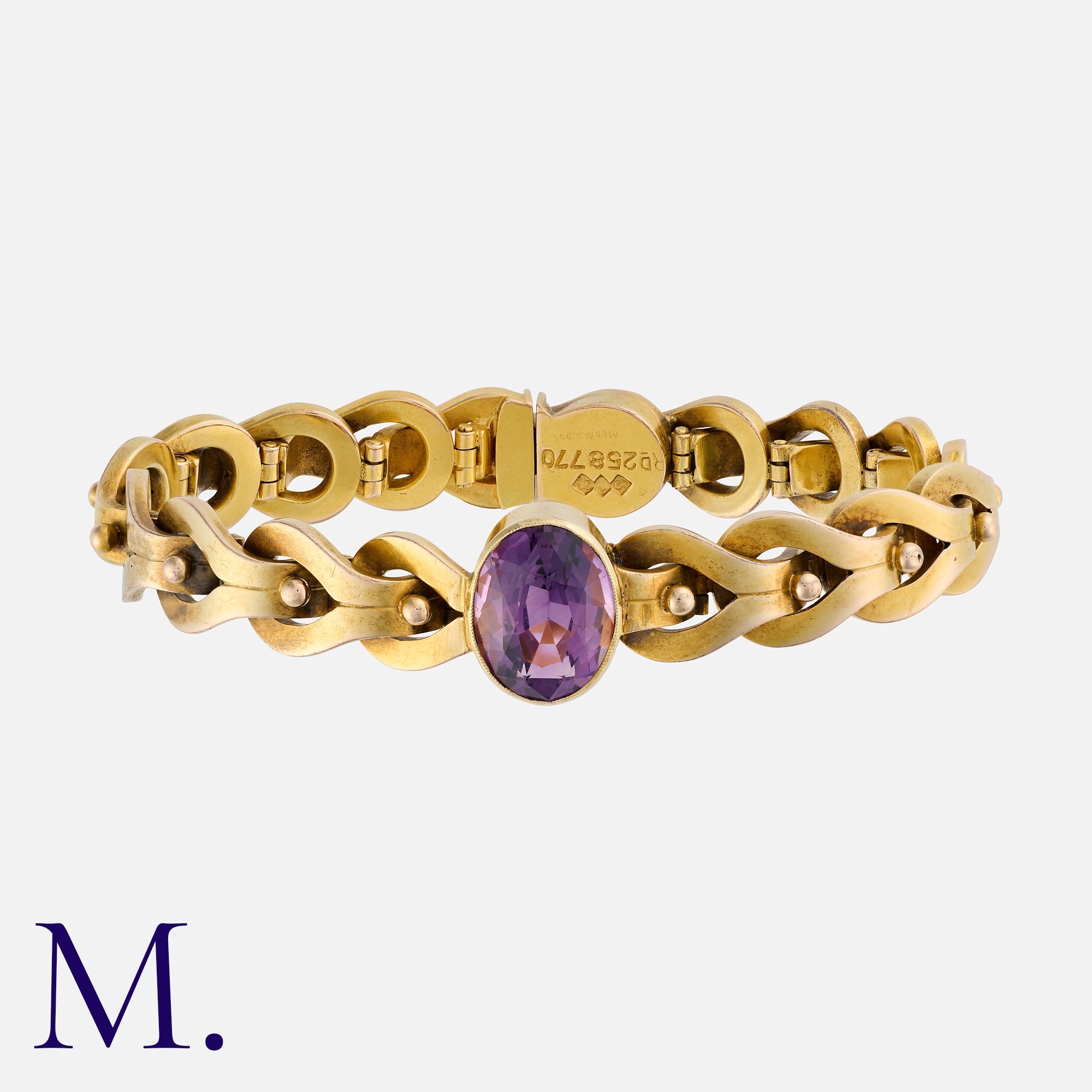 An Antique Amethyst Bracelet in 15K gold, set with an oval cut amethyst to the centre (approx. 13.0x10.5mm) with fancy links. Stamped 15ct and tests indicate 15ct gold.