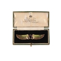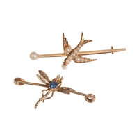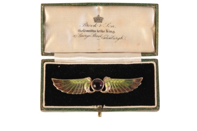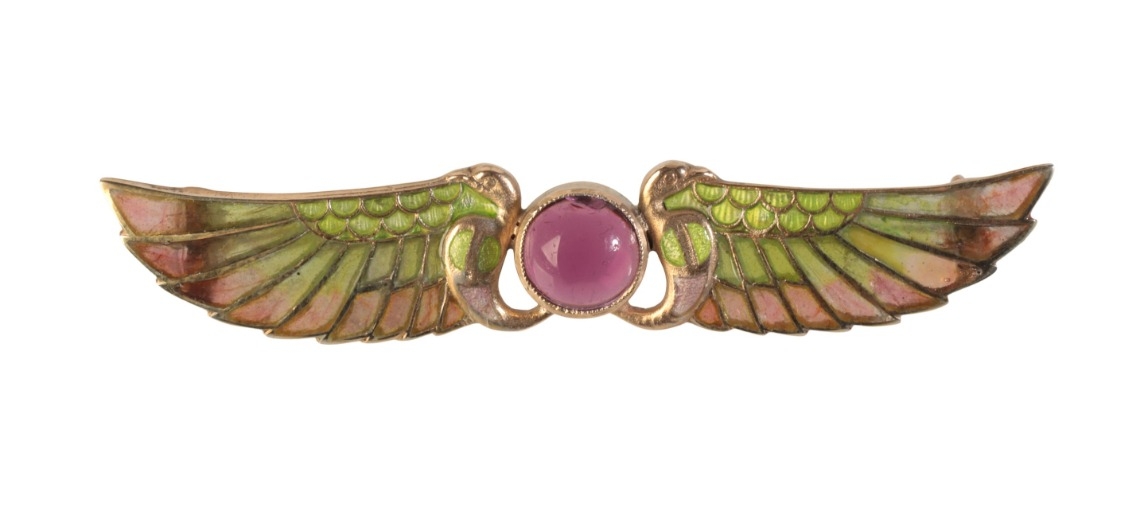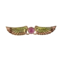 in 9ct yellow gold, set to the centre with a tourmaline cabochon, to wings set with plique-à-jour enamel of pink to green, secured with a hinged pin clasp, stamped '9CT' (obscured), 6.6cm, (gross weight - c.6.1g)