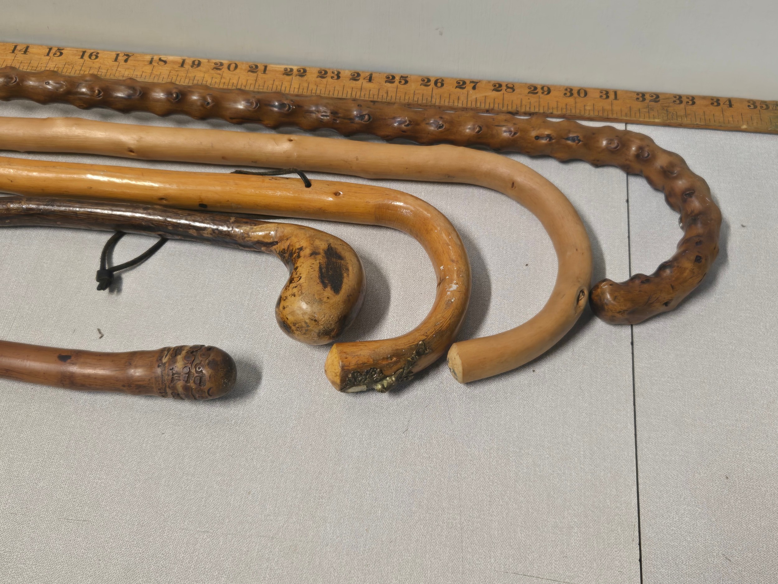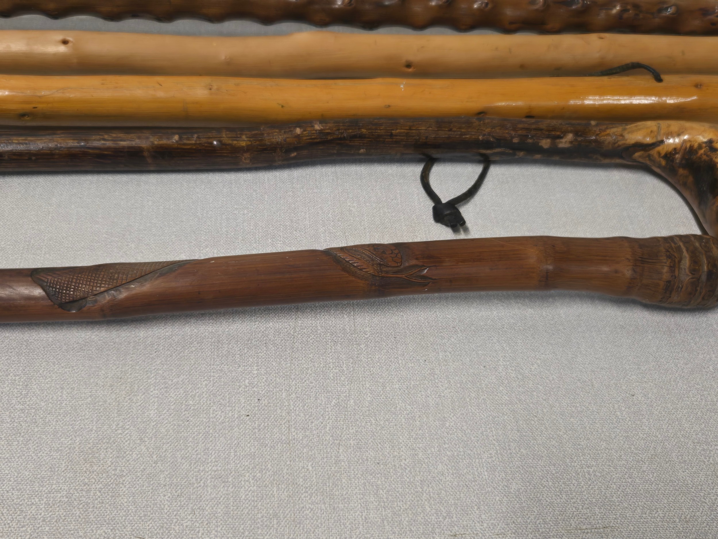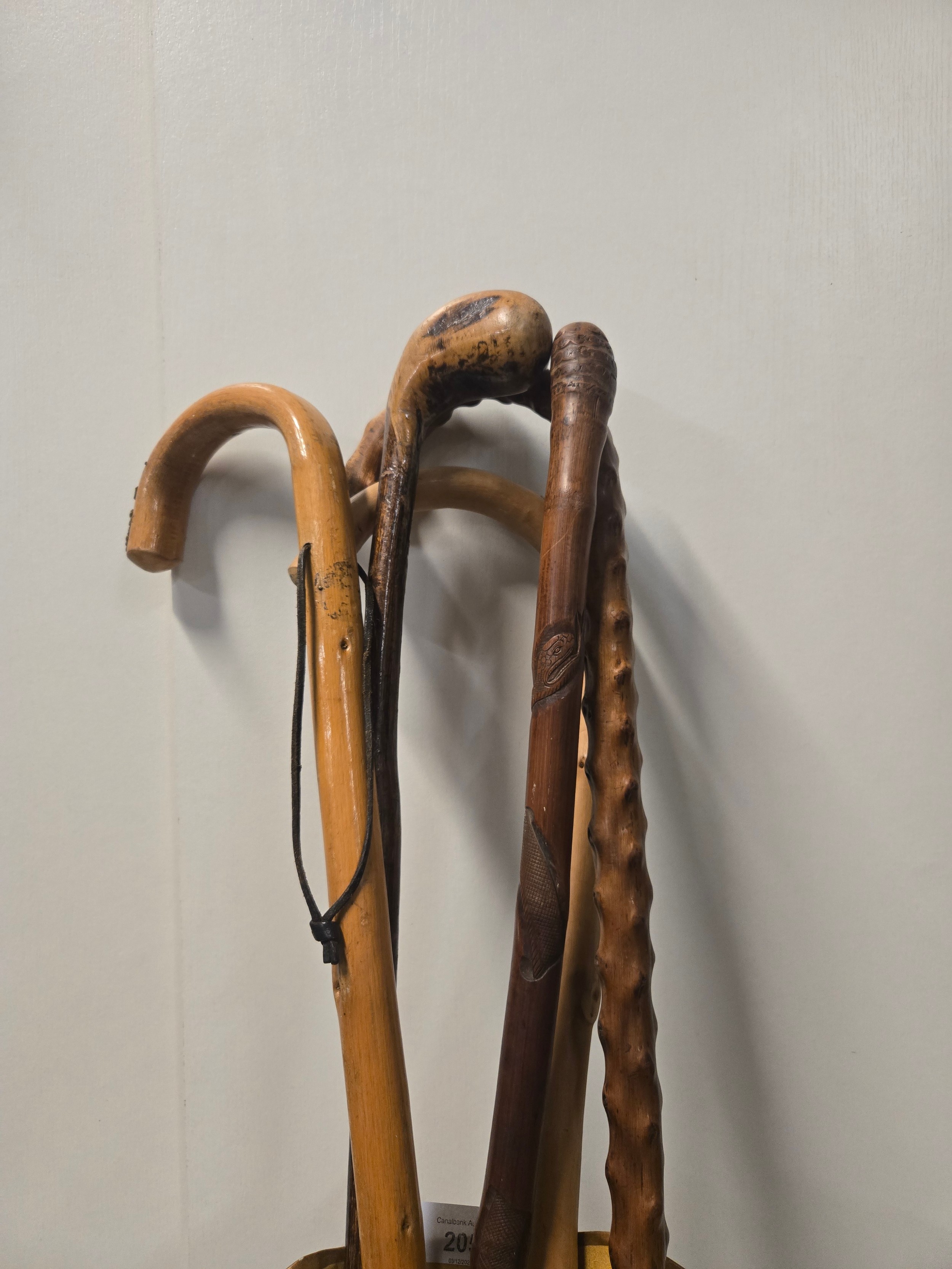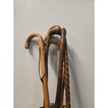 Selection of wooden walking sticks to include carved rattle snake etc.