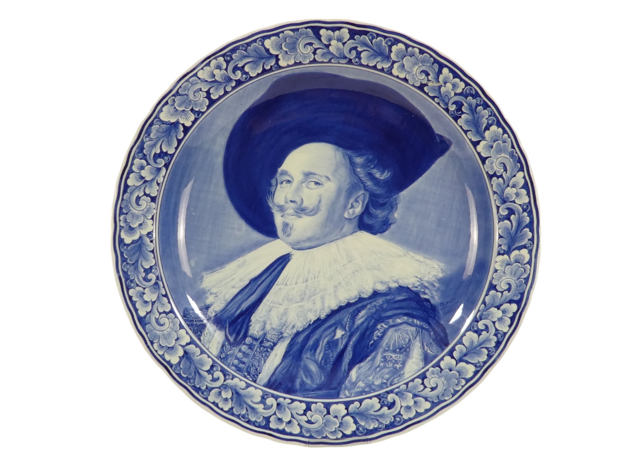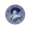 A 20th century Delft charger - decorated with an image of a cavalier within a foliate border, 41cm diameter.