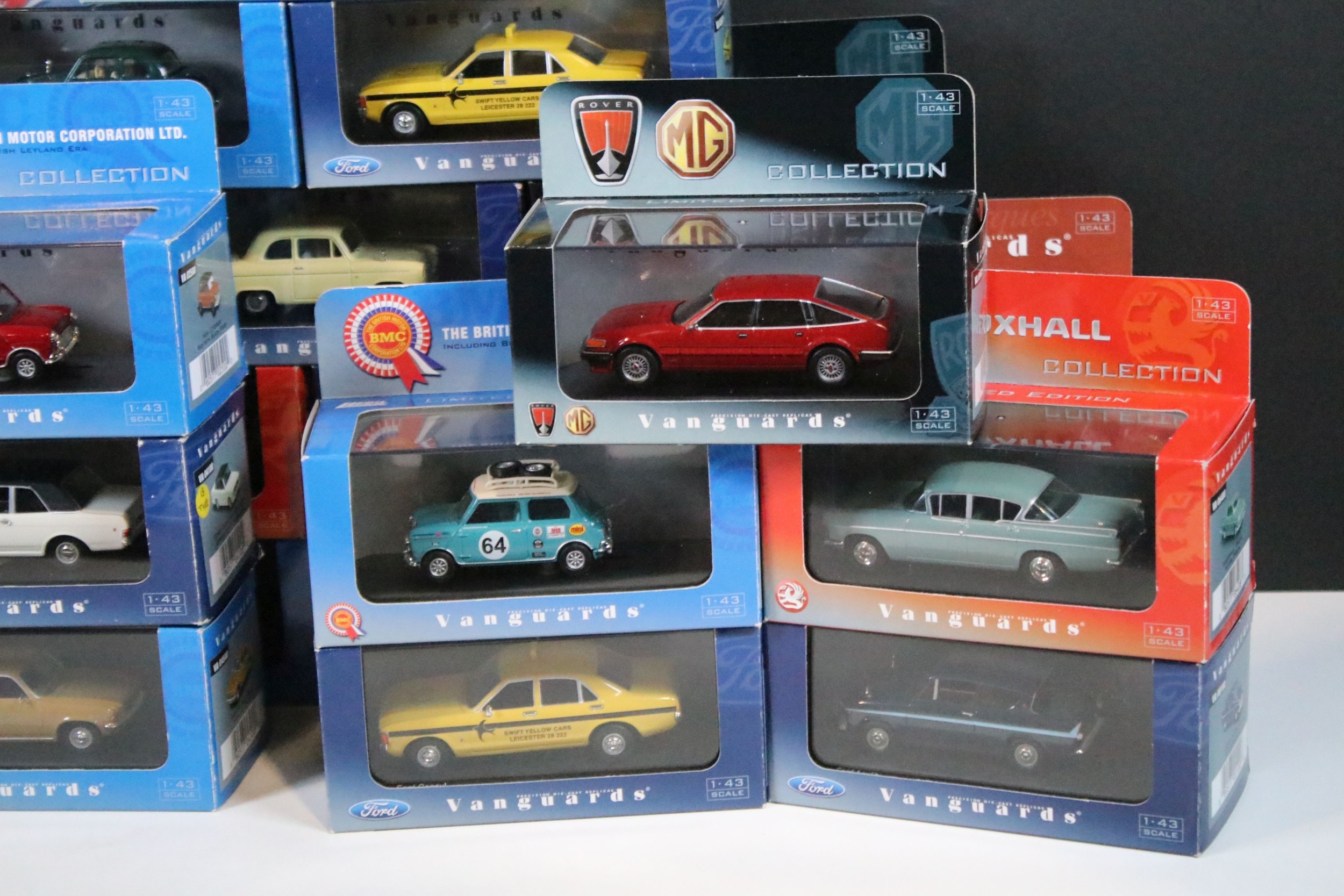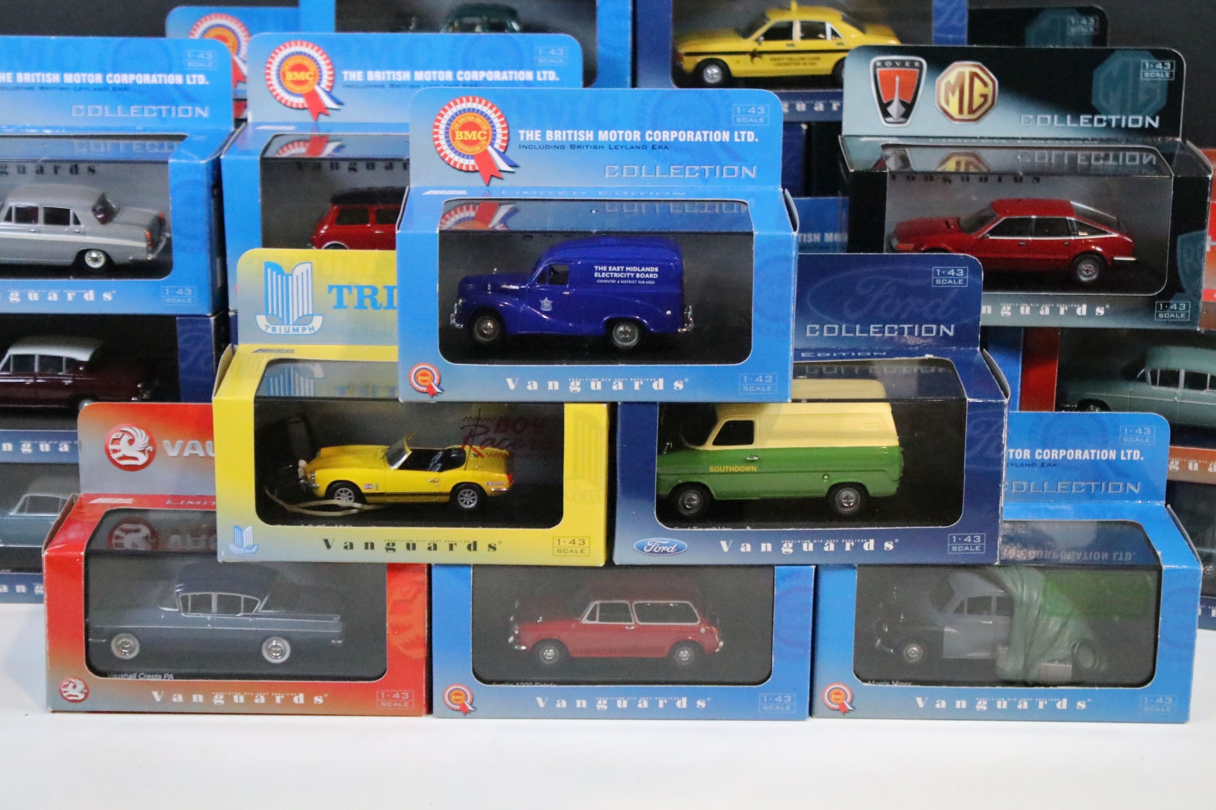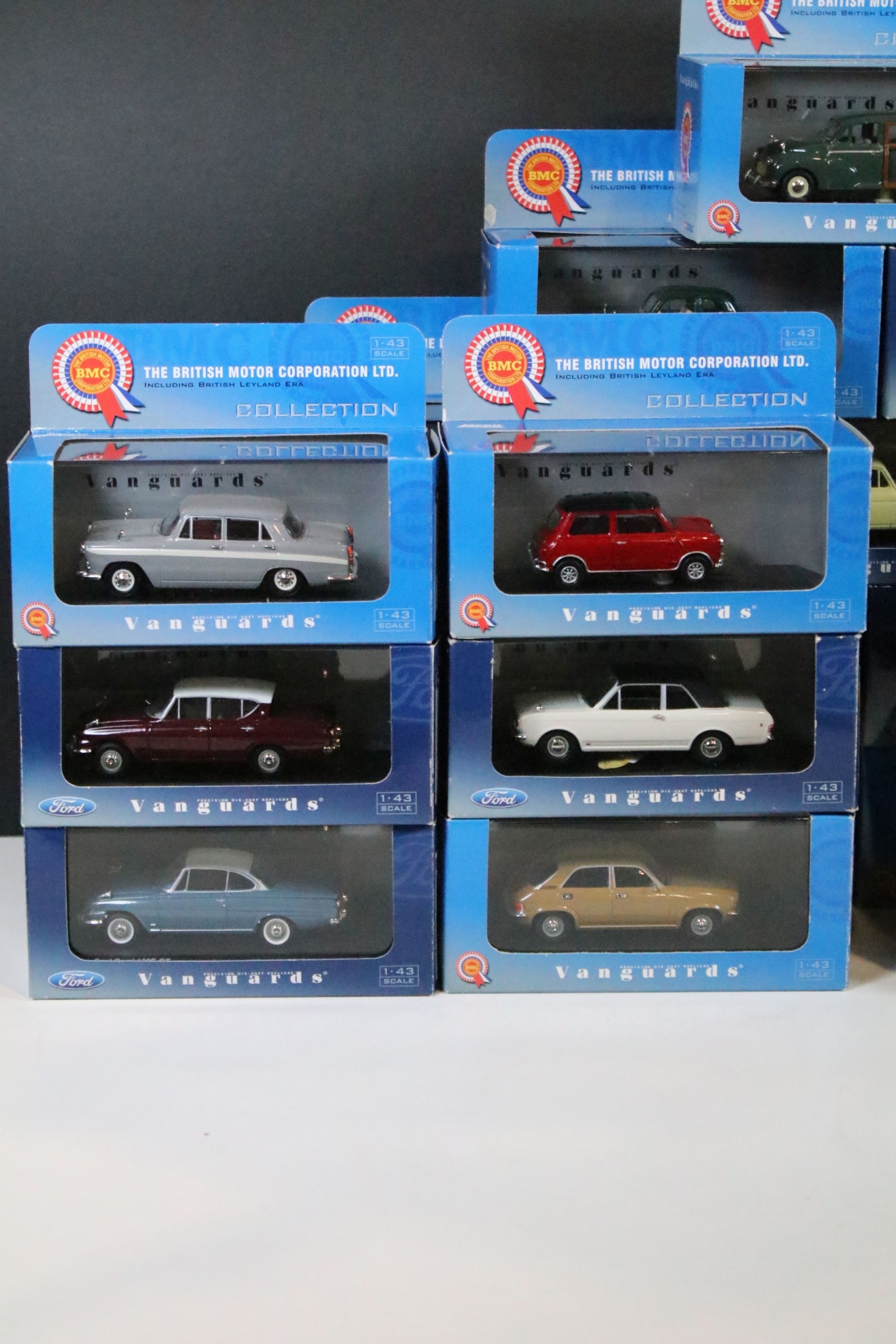 35 Boxed / cased ltd edn Corgi / Lledo Vanguards diecast models to include VA05509 Ford Consul Swift Yellow Cars, VA04100 Ford Cortina MkII GT Ermine White & Black, VA03800 Vauxhall Victor F Series Gypsy Red, VA01300 Austin Mini Spruce Green, VA06709 Triumph Spitfire MkIII Metallic Cornish Sunset, etc, all ex