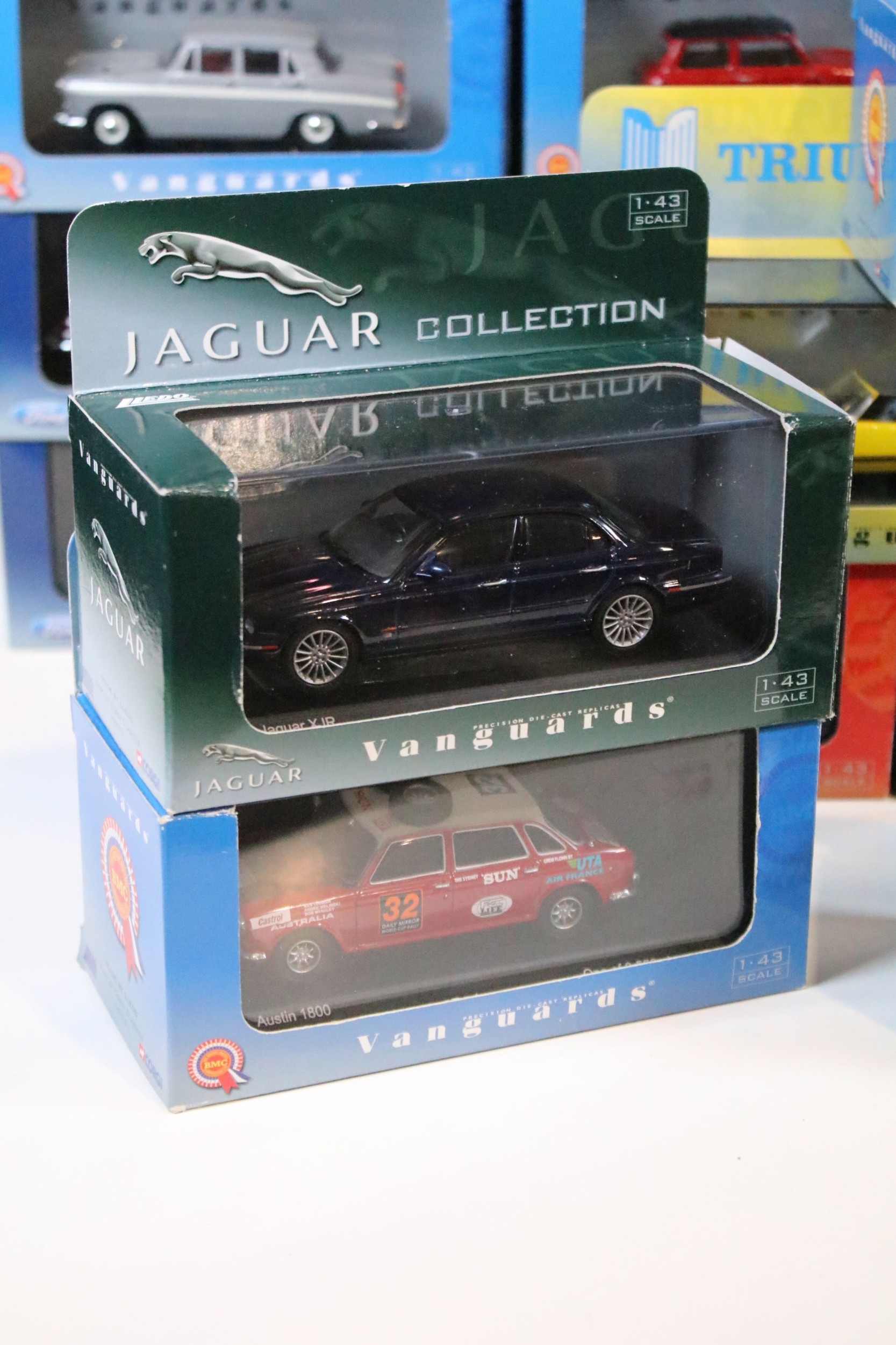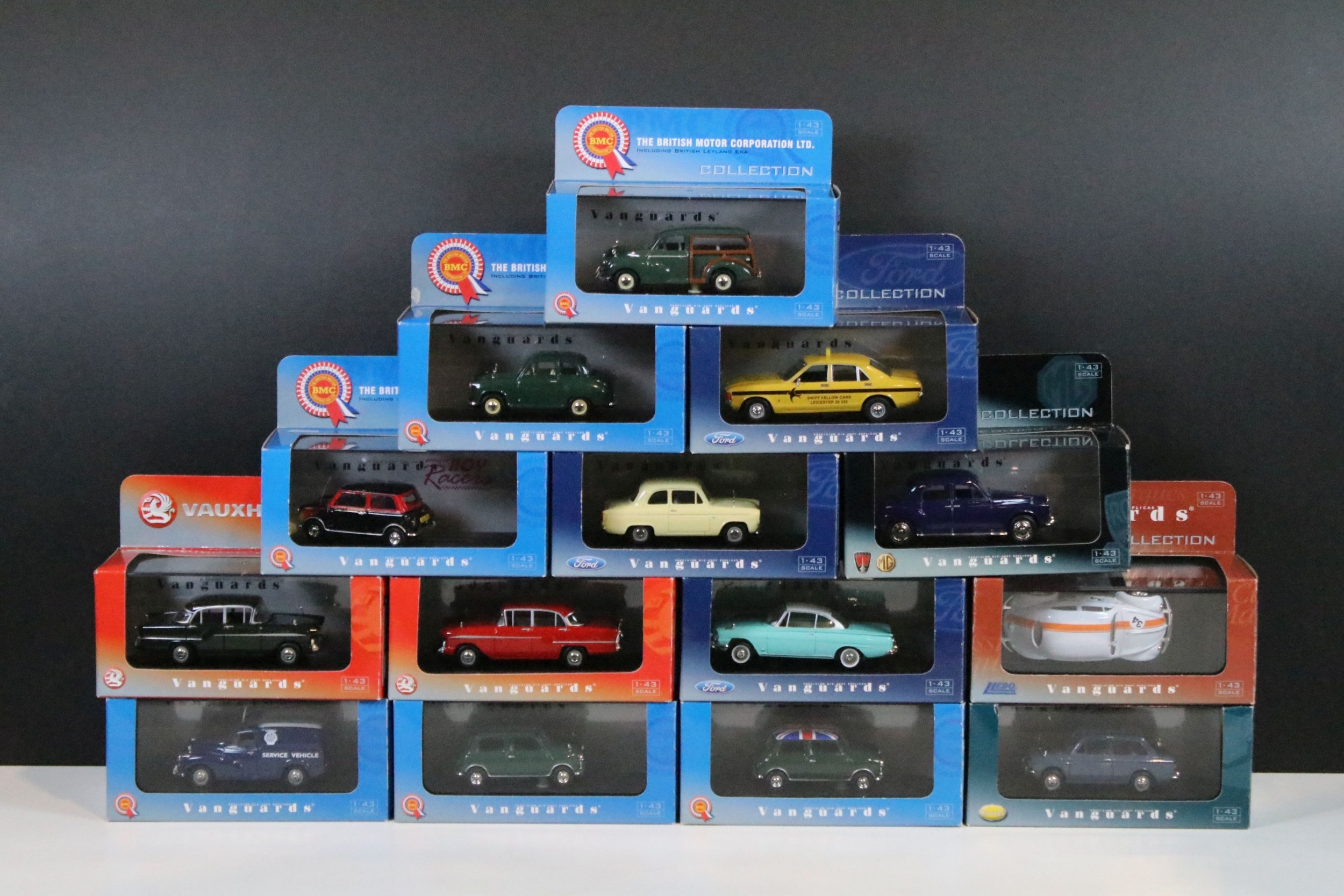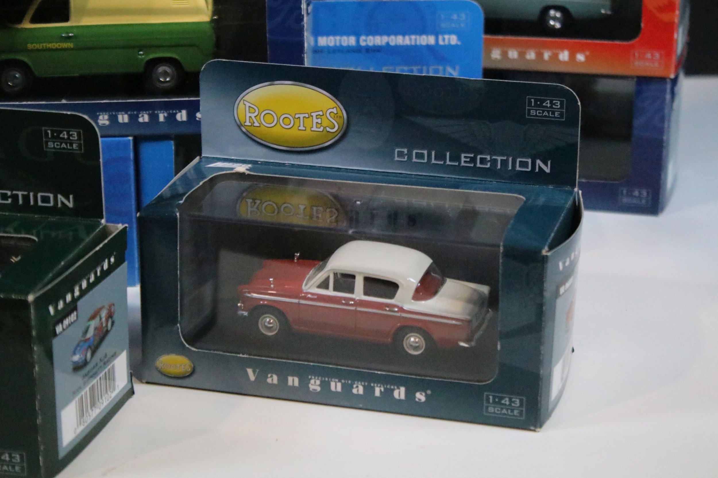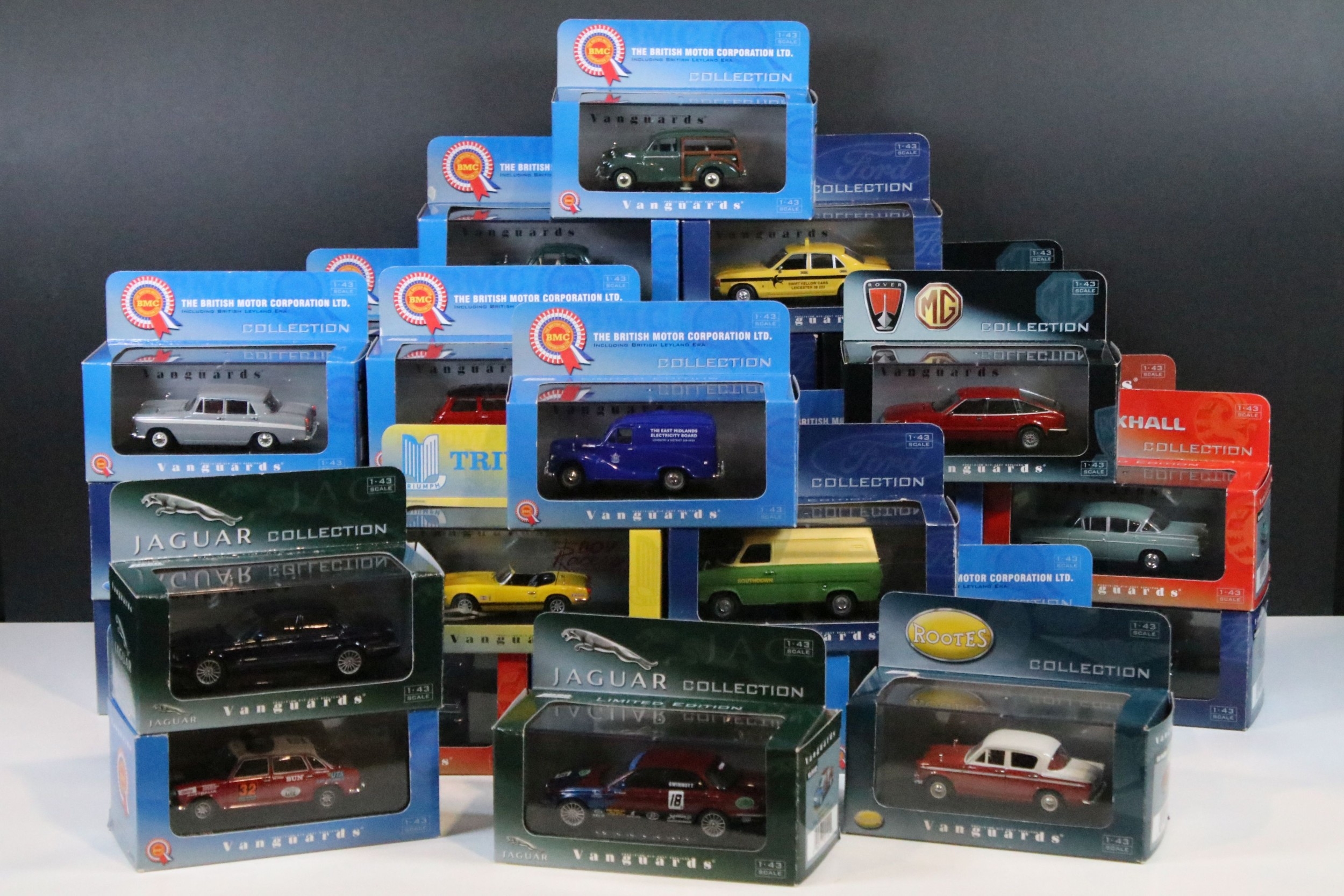 35 Boxed / cased ltd edn Corgi / Lledo Vanguards diecast models to include VA05509 Ford Consul Swift Yellow Cars, VA04100 Ford Cortina MkII GT Ermine White & Black, VA03800 Vauxhall Victor F Series Gypsy Red, VA01300 Austin Mini Spruce Green, VA06709 Triumph Spitfire MkIII Metallic Cornish Sunset, etc, all ex