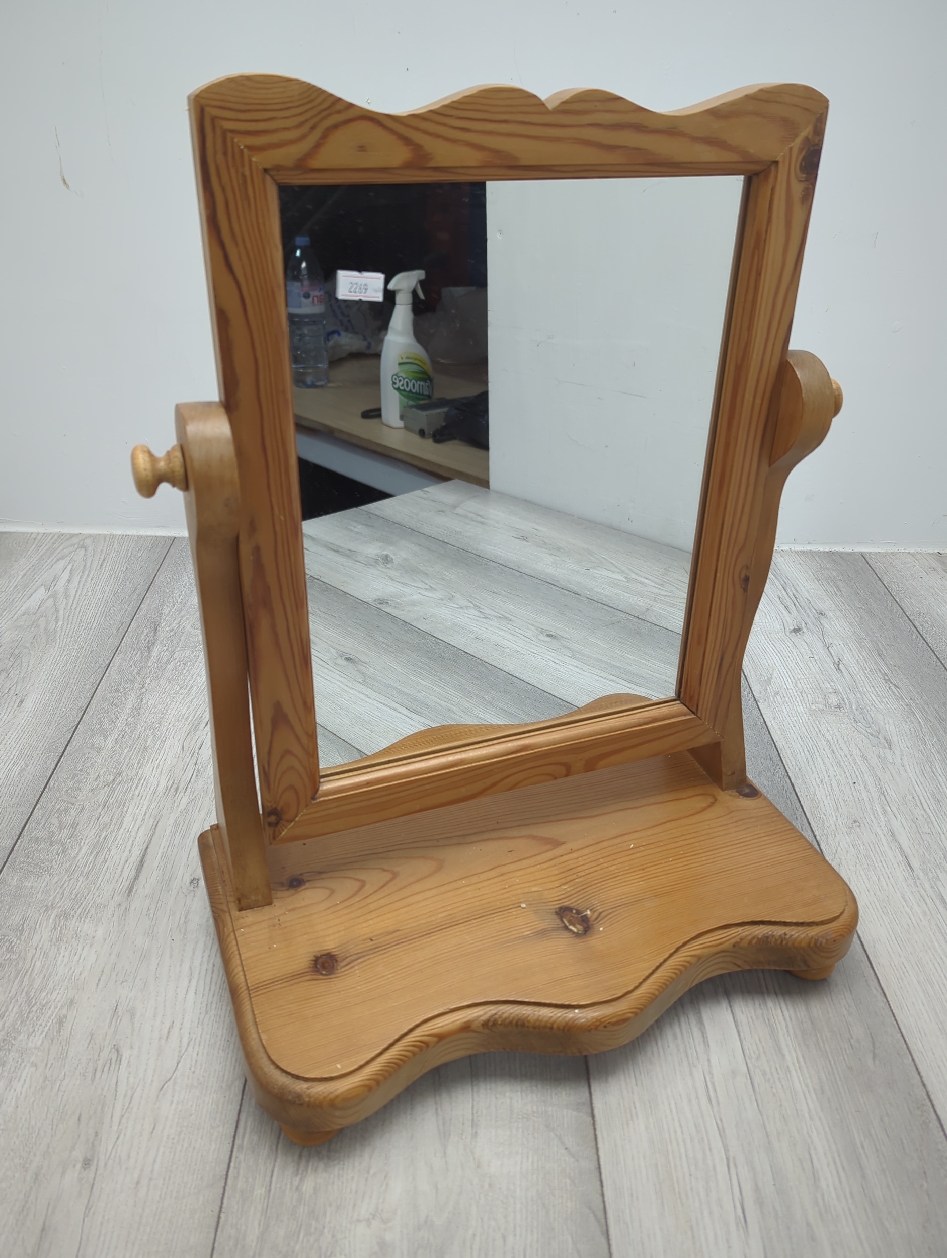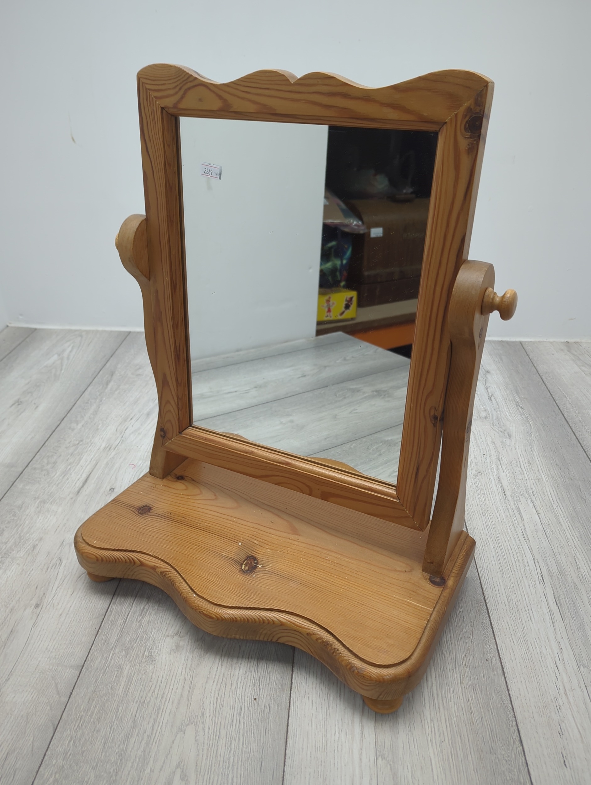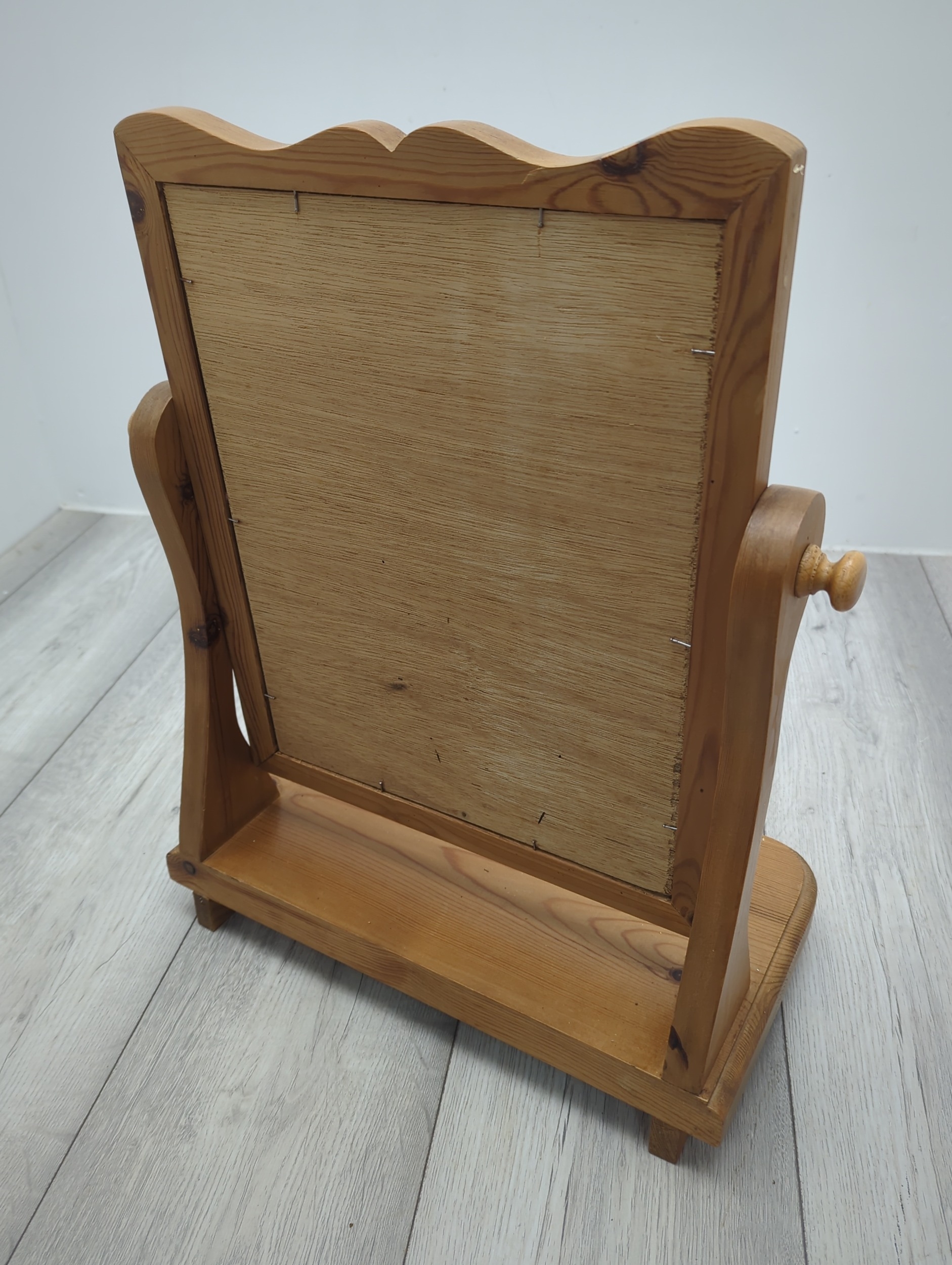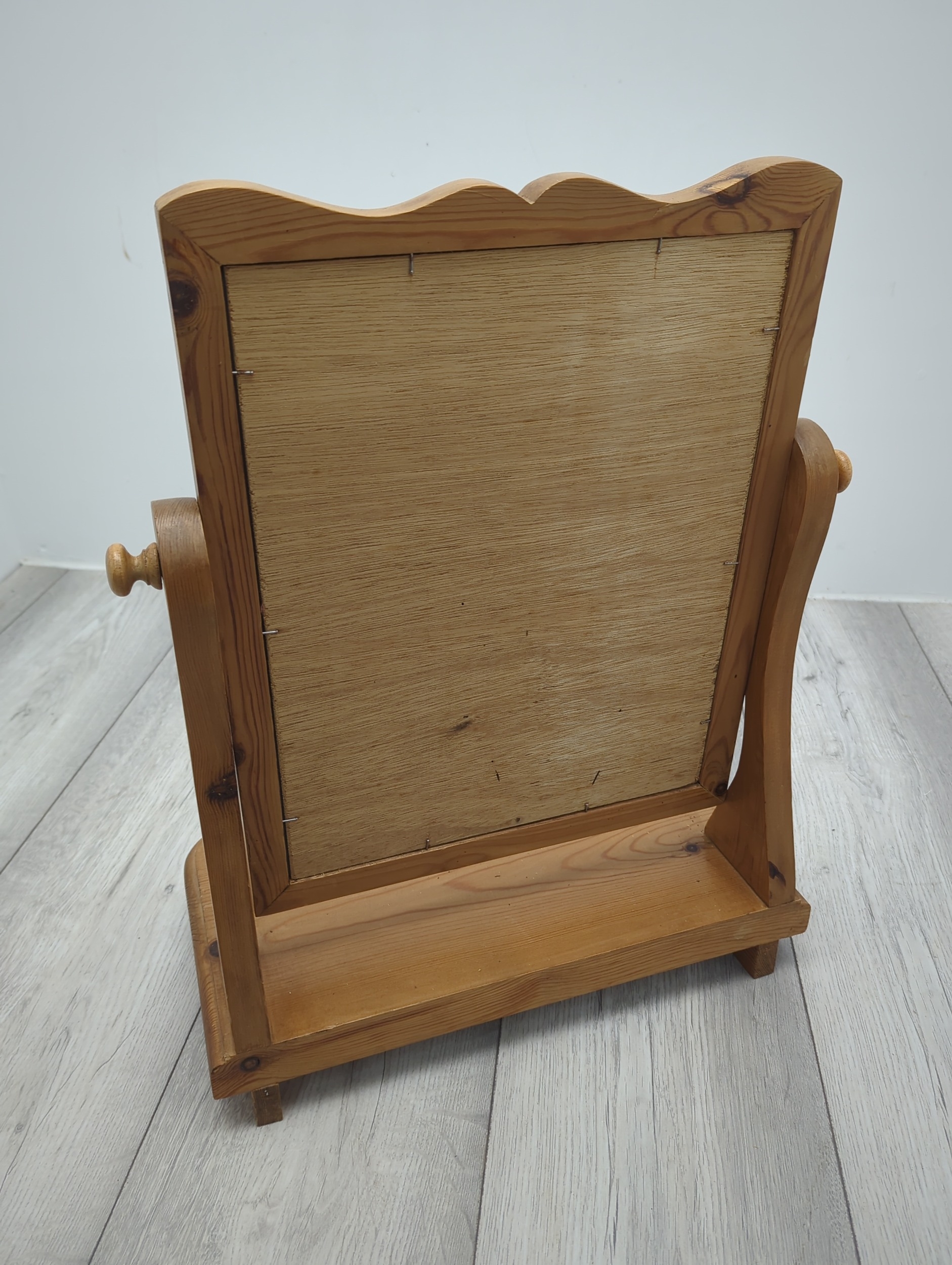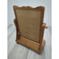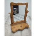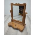 This is a compact table mirror with a pine frame, featuring a classic swivel design that allows for adjustable angles. The mirror is elegantly framed with a scalloped edge for added style, set atop a sturdy pine base providing stability. This piece is suitable for use on dressers or countertops, combining functionality with a natural wood aesthetic.