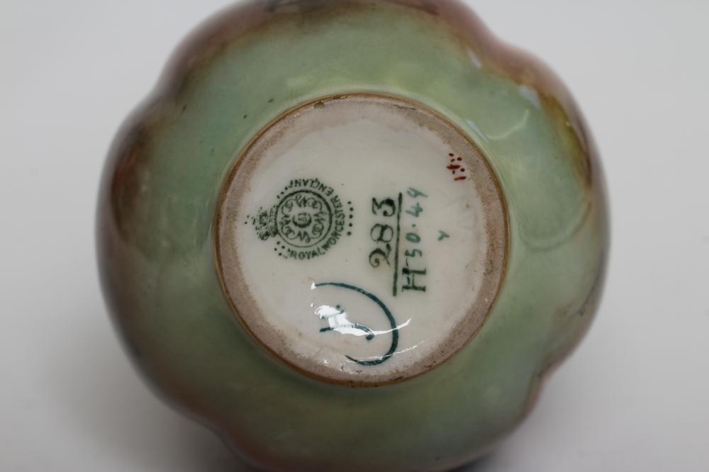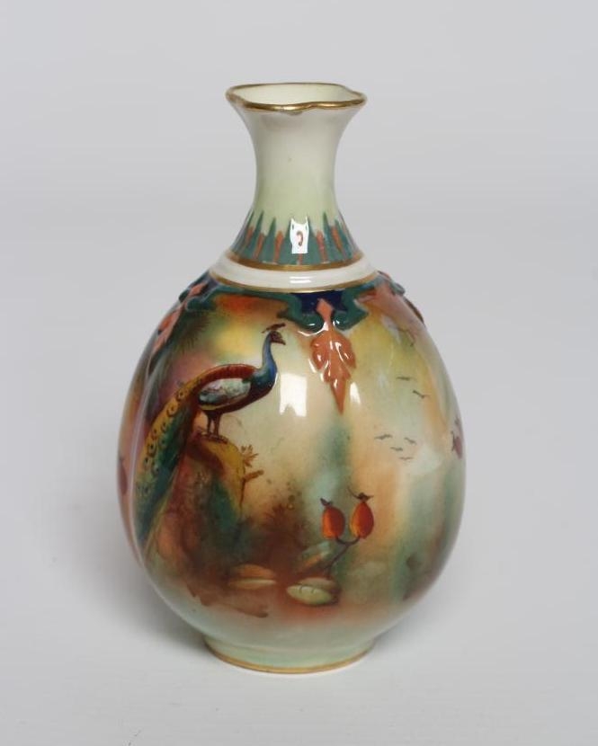 A SMALL ROYAL WORCESTER CHINA VASE, c.1908, of lobed ovoid form with waisted neck, painted in colours by H. Austin with a peacock perched on a rocky outcrop within green borders, signed, green mark, shape 283/H, 4" high (Est. plus 21% premium inc. VAT)