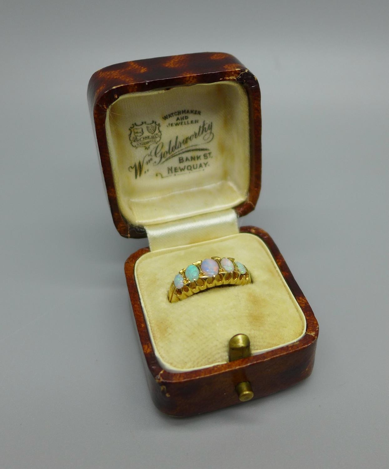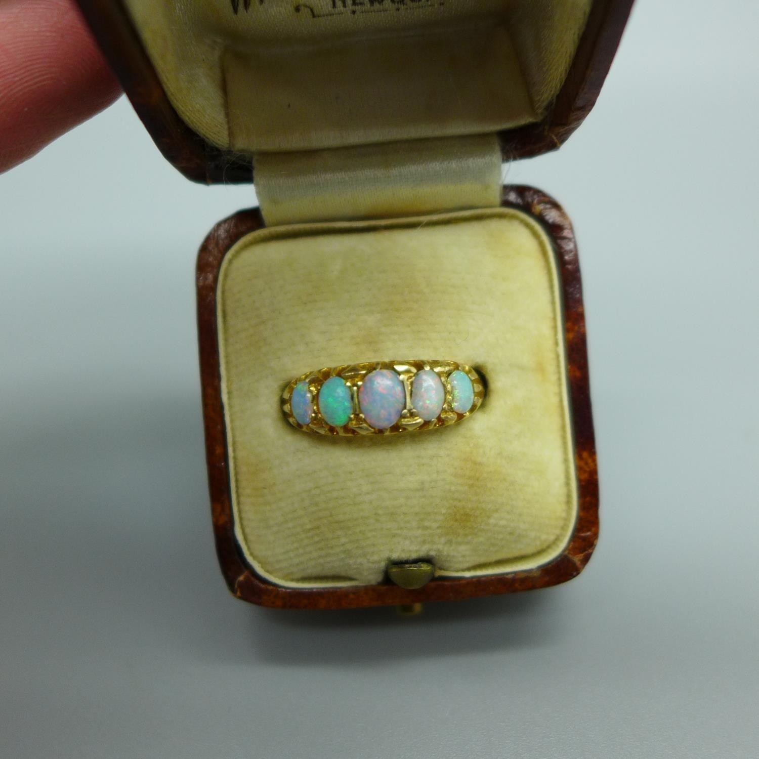 A Victorian 18ct gold and opal ring, Birmingham 1864, two opals chipped, 2.6g, K