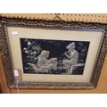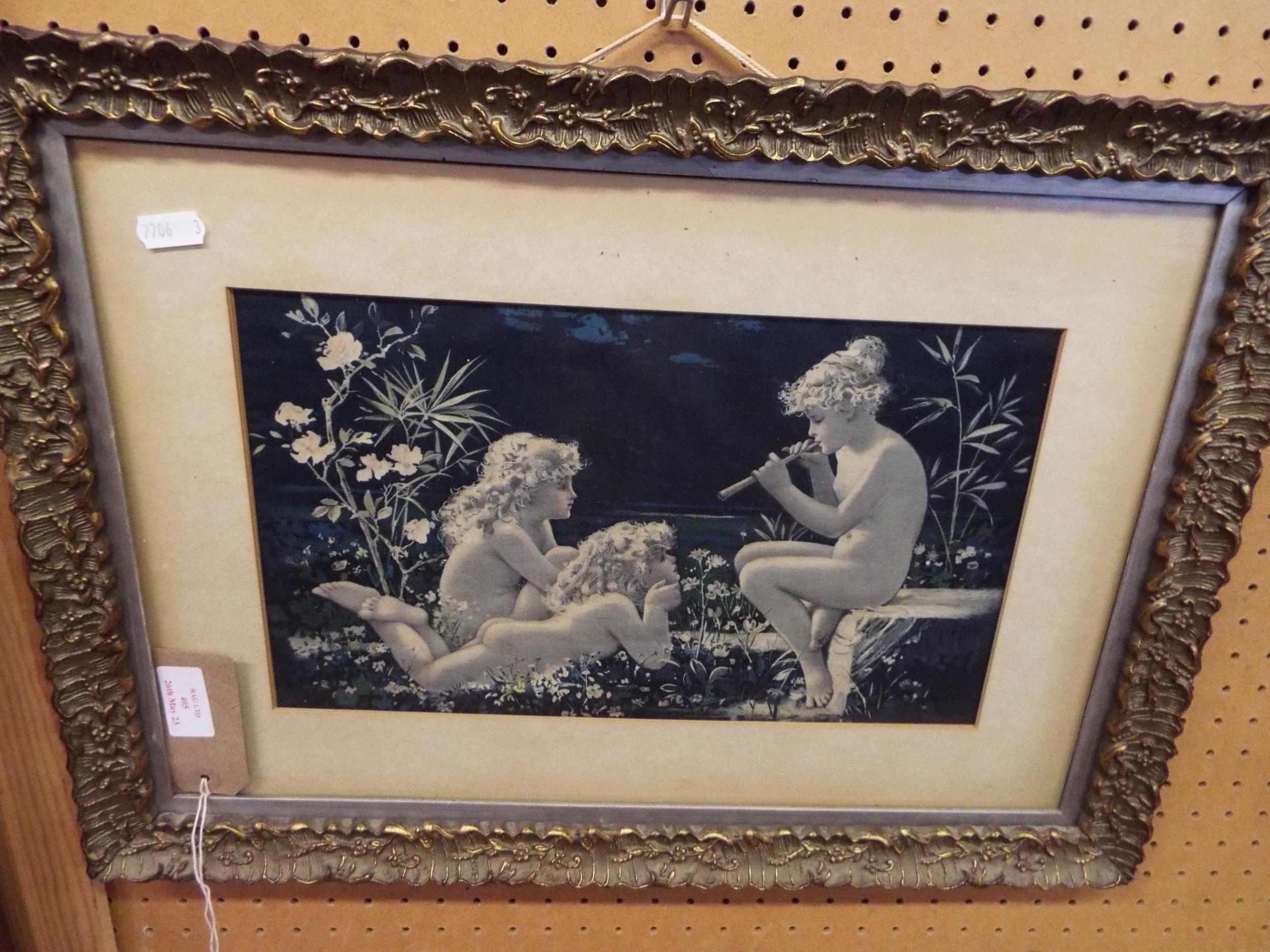 A vintage print on silk 'Three Children in Gardens'