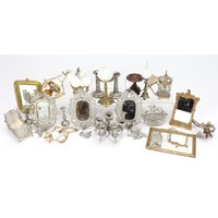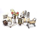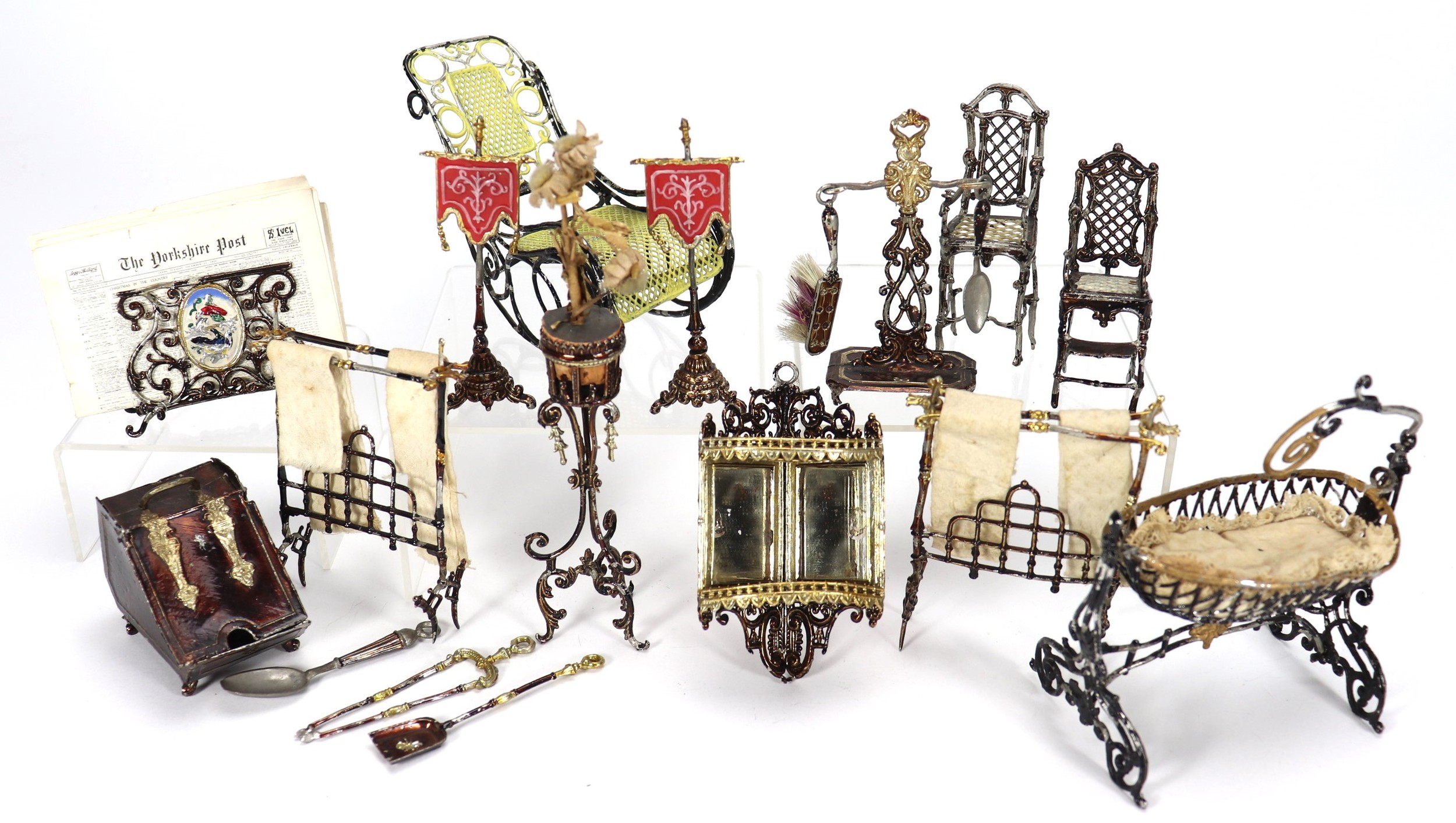 A collection of miniature soft metal dolls house furniture, German 1880s-90s, painted brown metal pieces include babies swinging cot, 3 1/2" (9cm) tall, two high chairs, (one lacks foot rest), rocking chair, newspaper stand, jardinière, umbrella stand, pair of flags on poles, two towel rails, corner shelf and coal scuttle, (condition: generally good), (14 items).