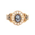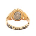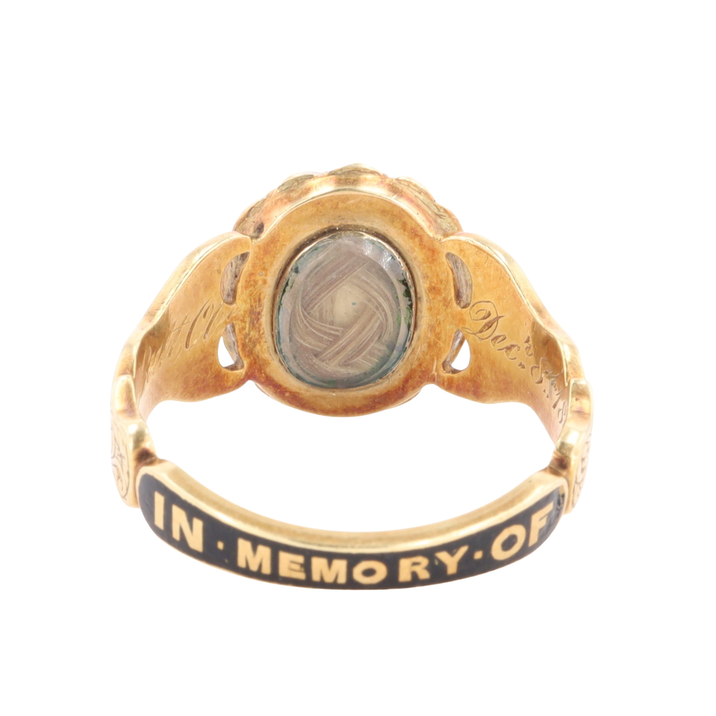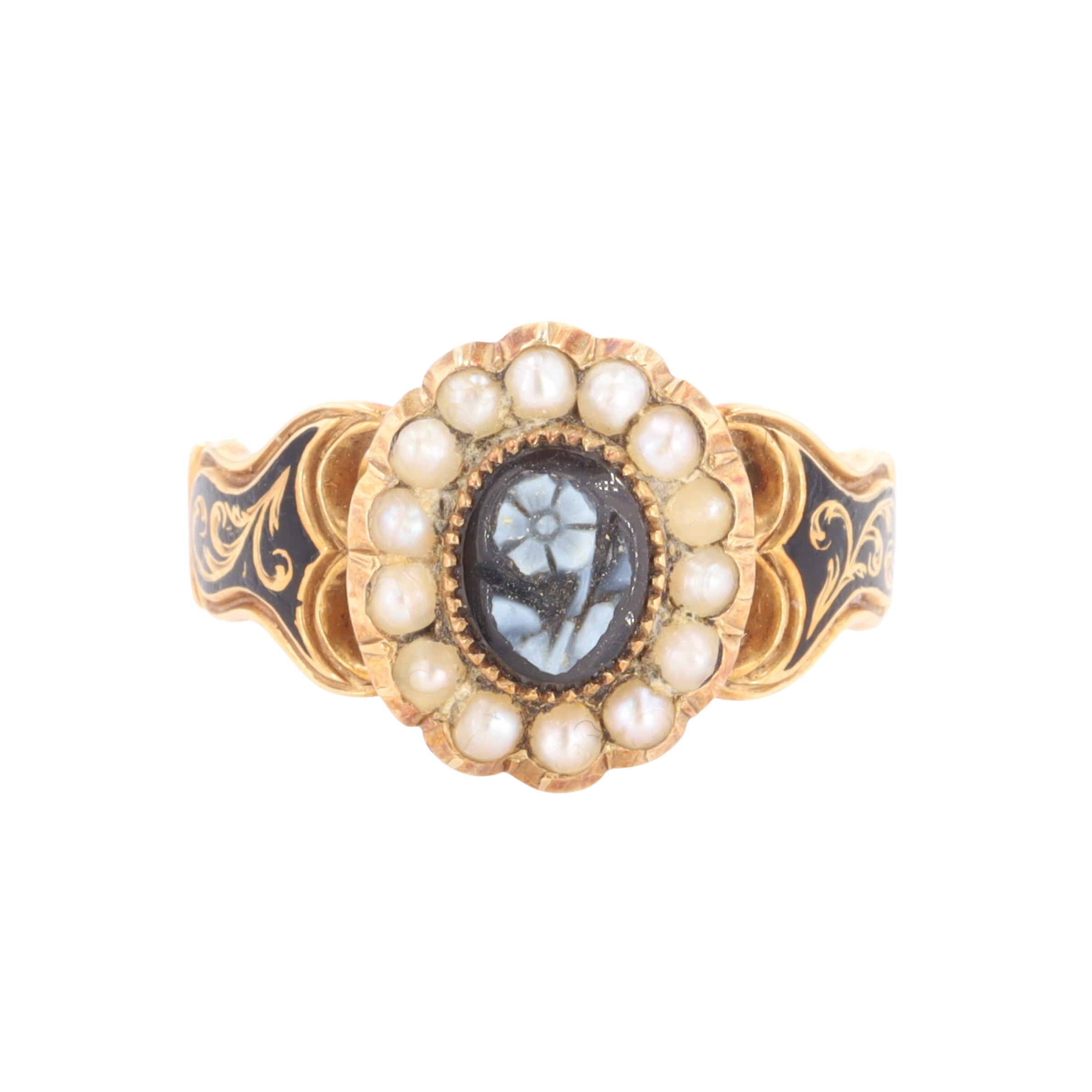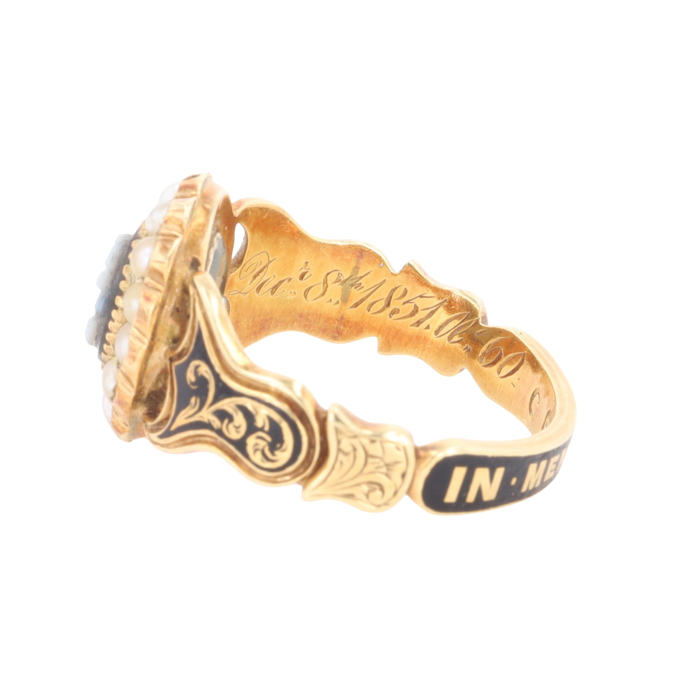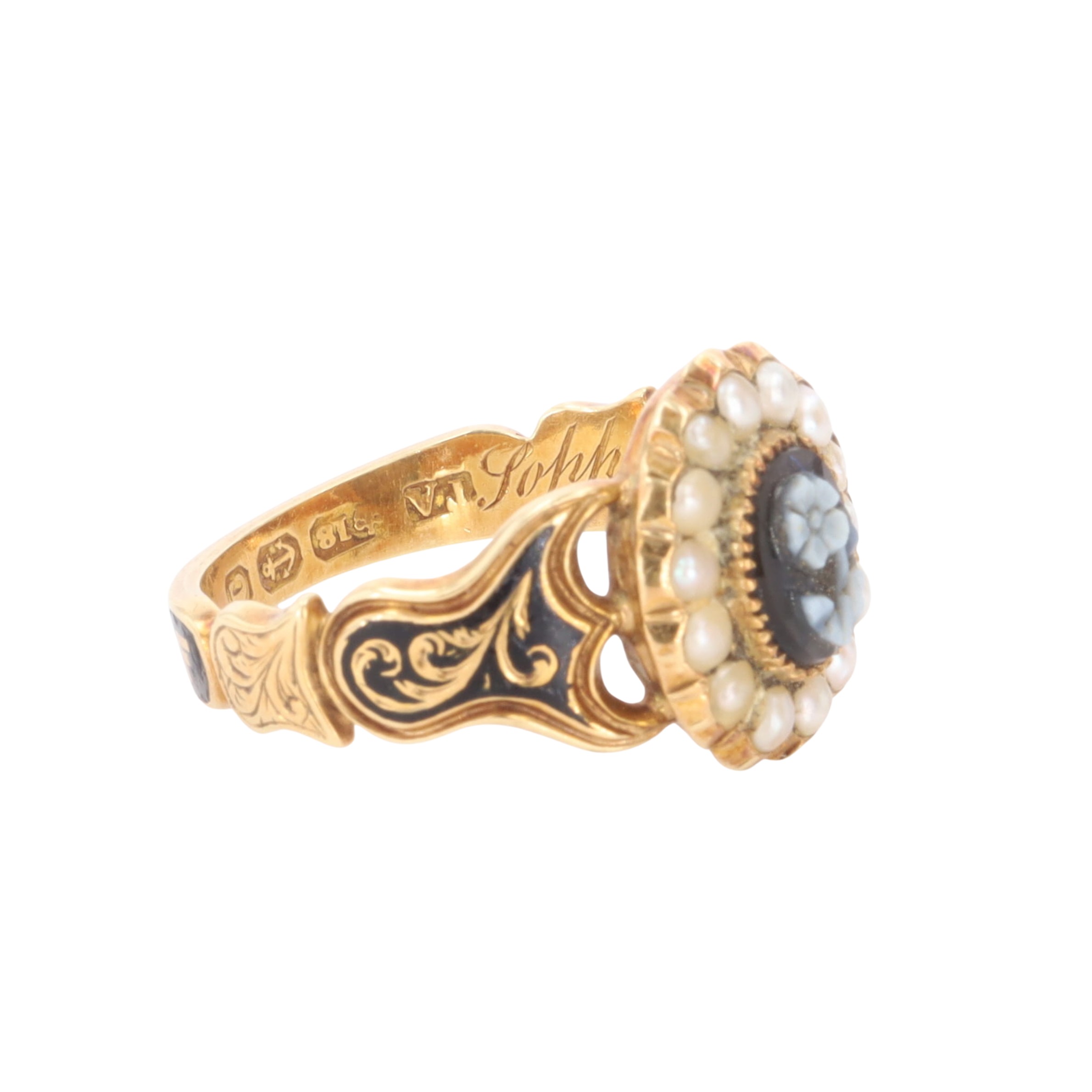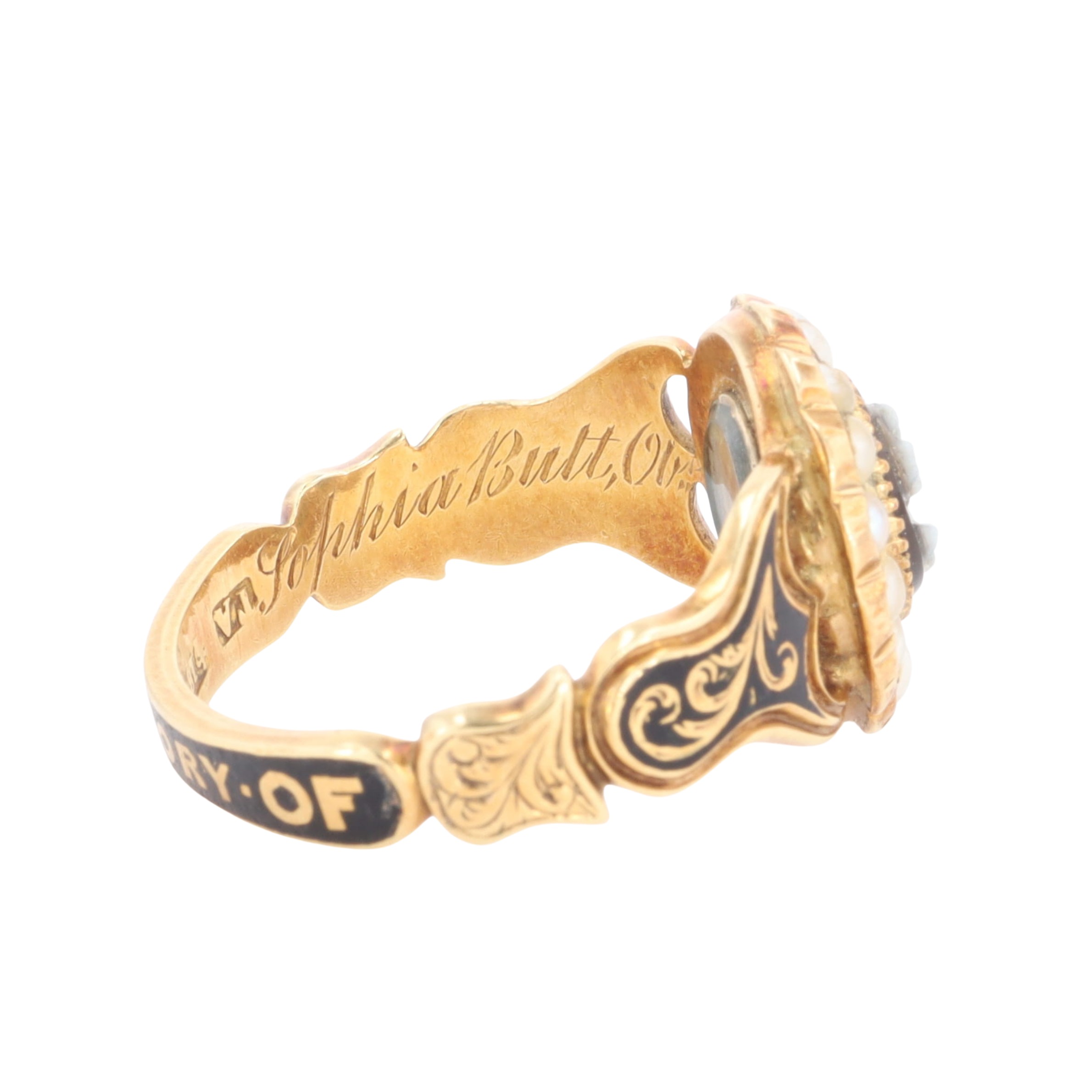 Victorian Carved Sardonyx Black Enamel Split Pearl Mourning Ring with Box. This piece is hallmakred for 18ct gold on the inner band, with inscription of 'Sophia Butt [...] Dec 8th 1851 at 60'. There is light to moderate wear and scratches to metal and stones. The enamel is in generally good condition with some indentation due to age and wear. The mourning locket is intact, the stones are secure in setting. UK ring size P, weighs 4.9g.