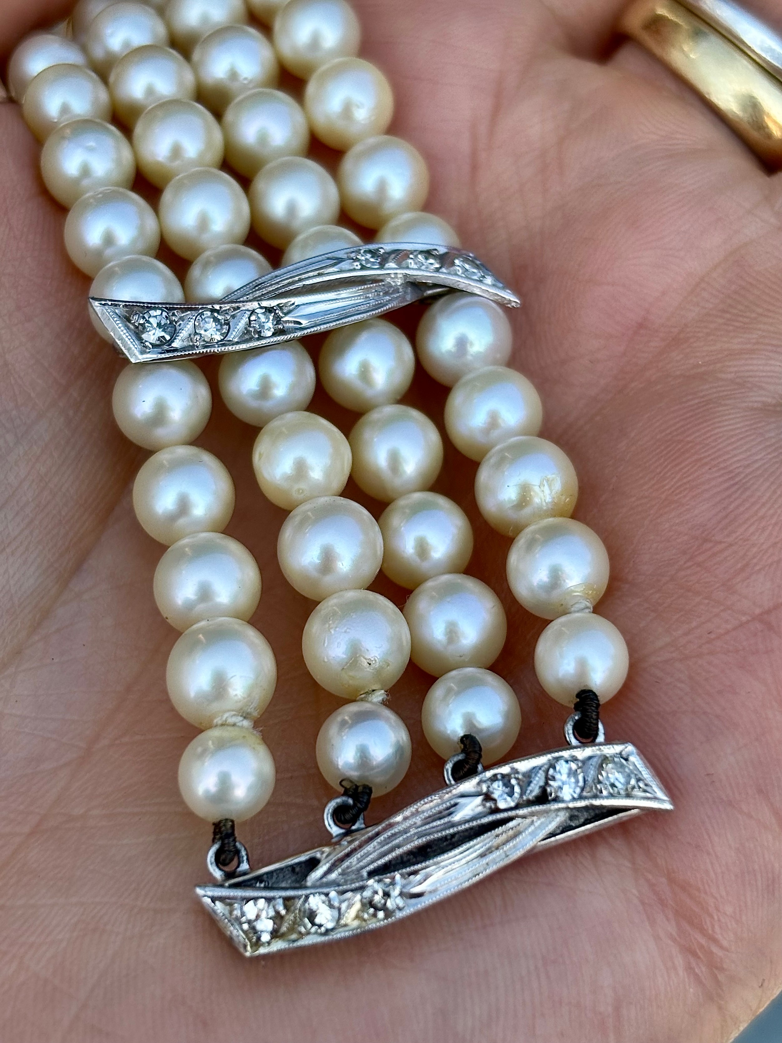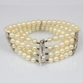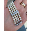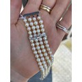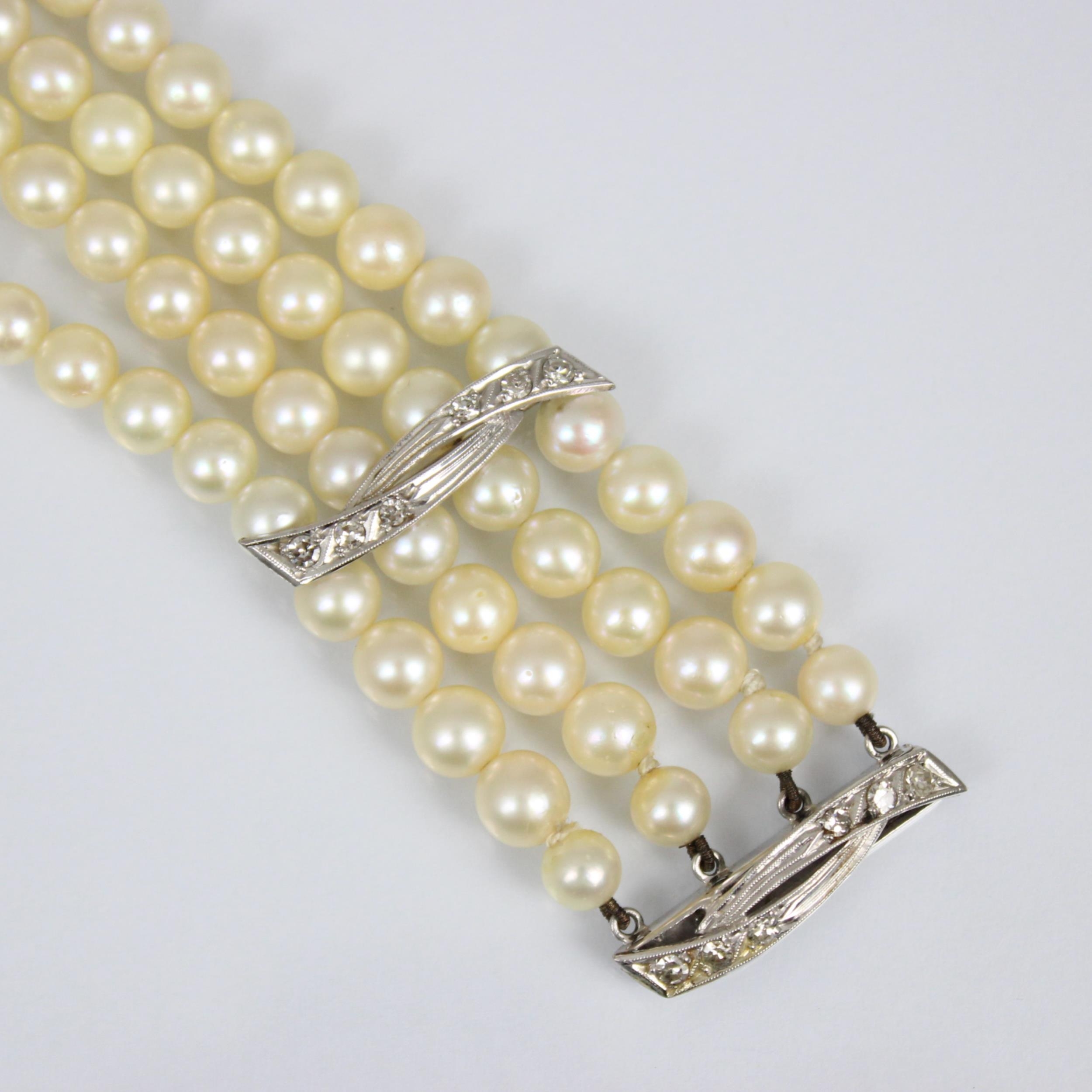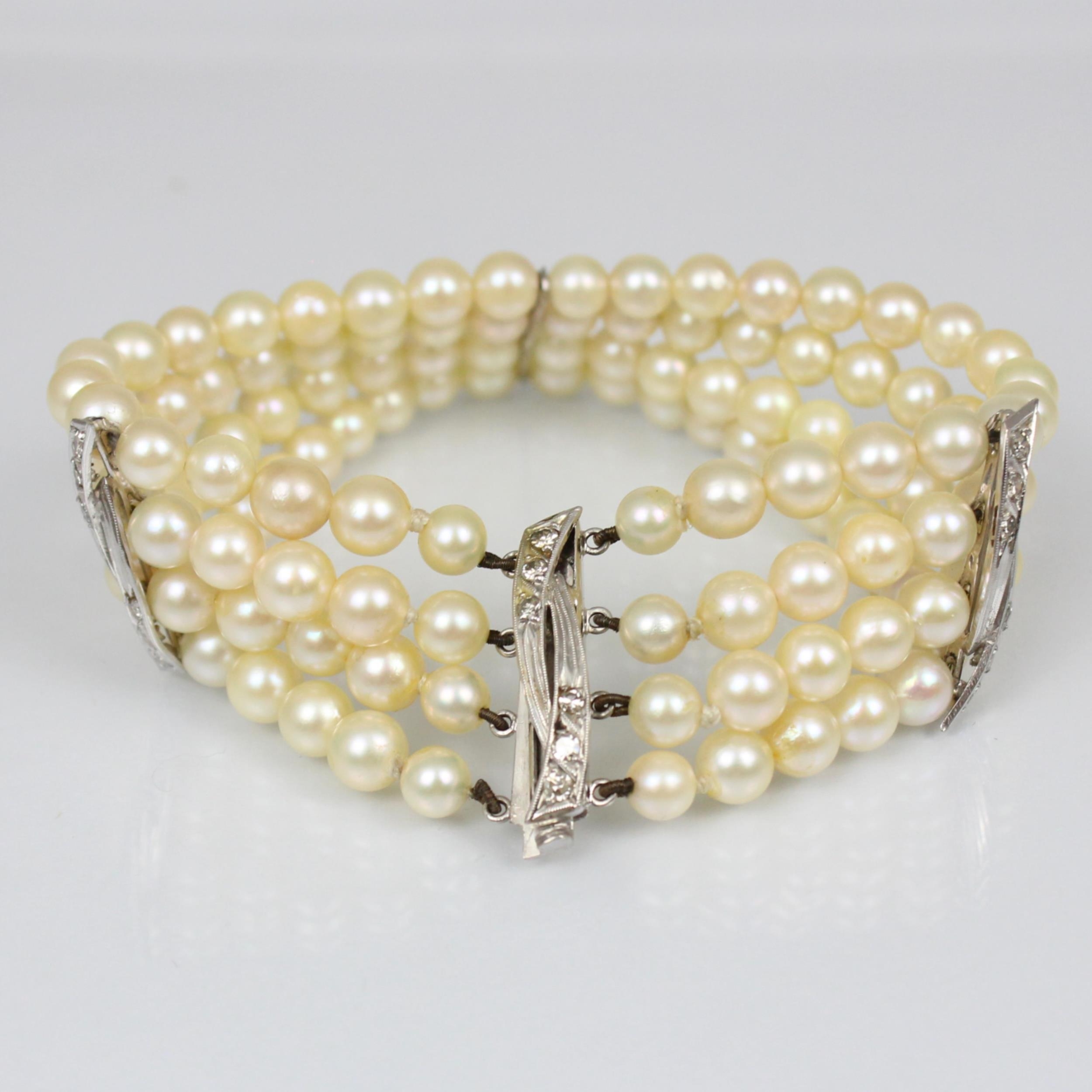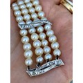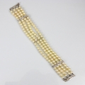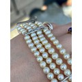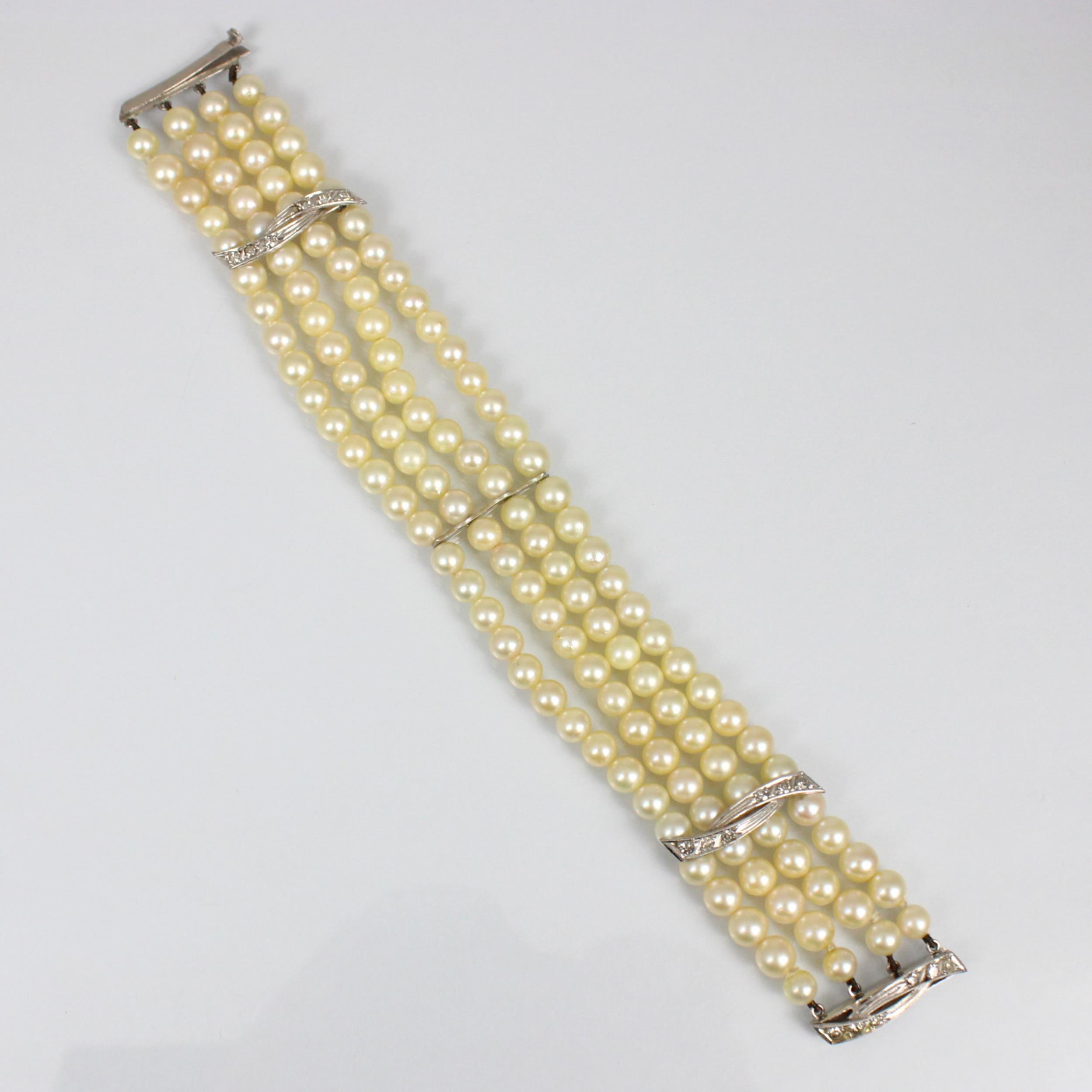 A cultured pearl and diamond bracelet, the three white metal stylised bars set with six graduated diamonds to each bar, set between quadruple strand of uniform spherical cultured pearls, 19cm long, 40gms, pearls 5mm