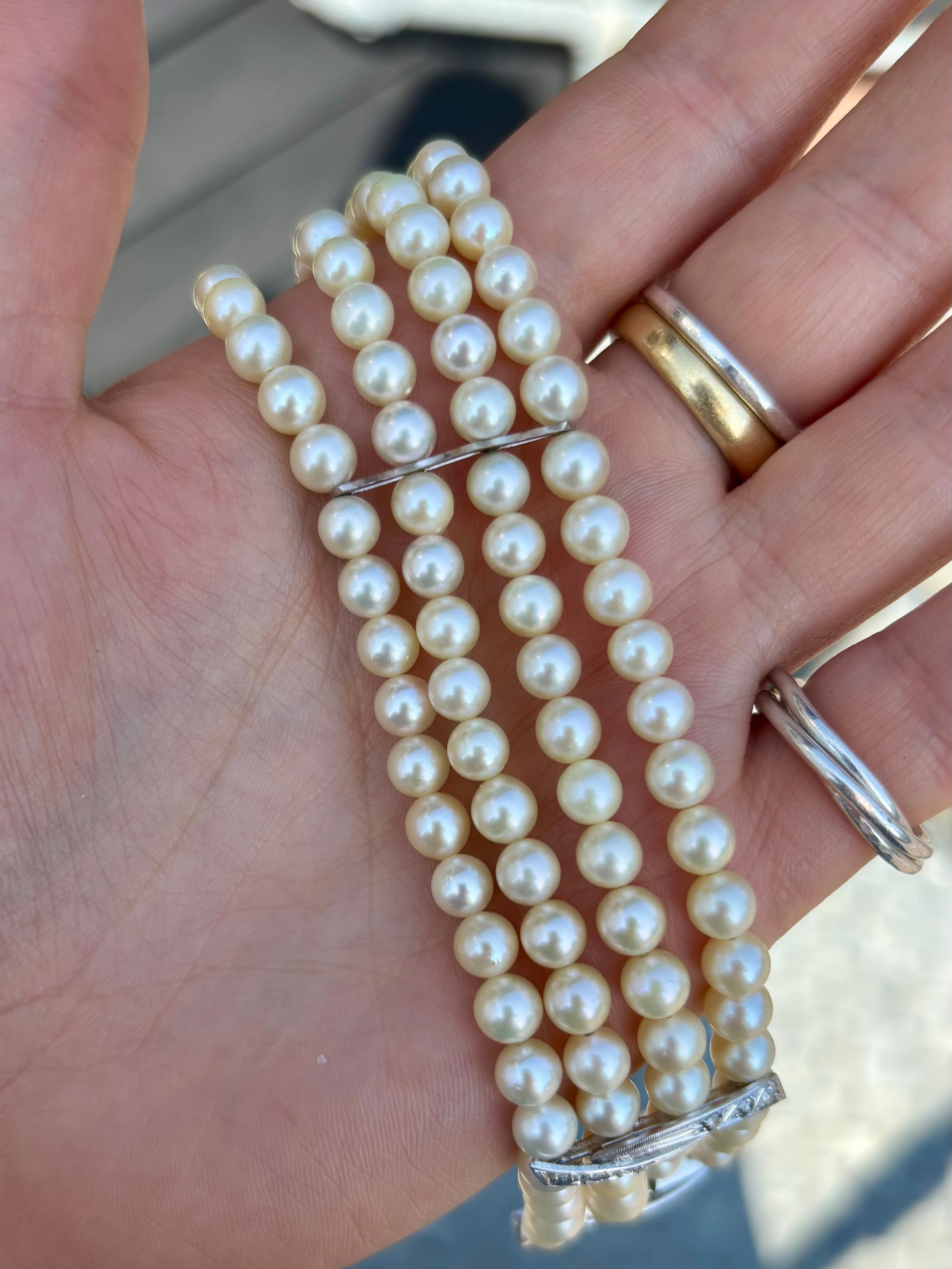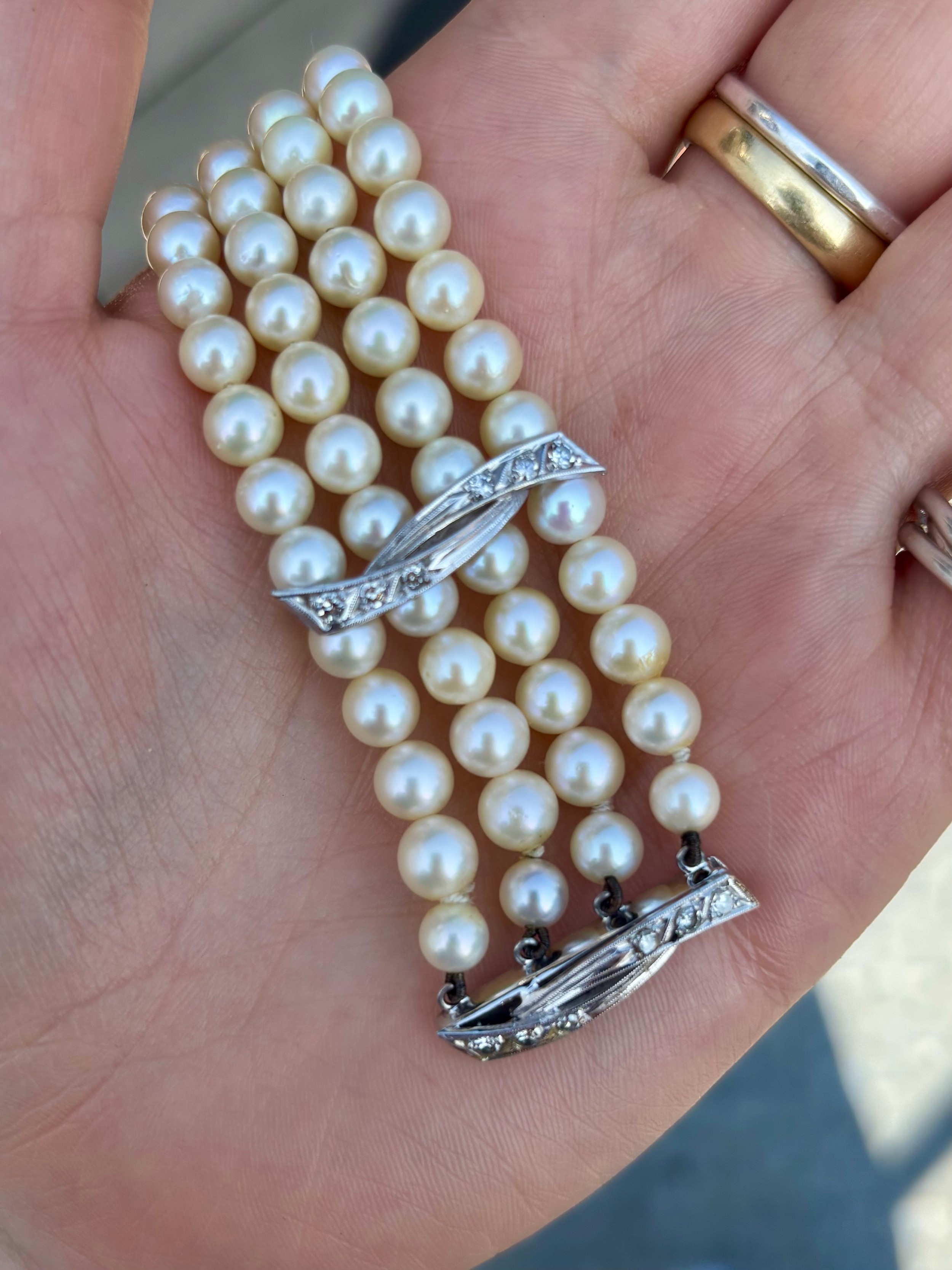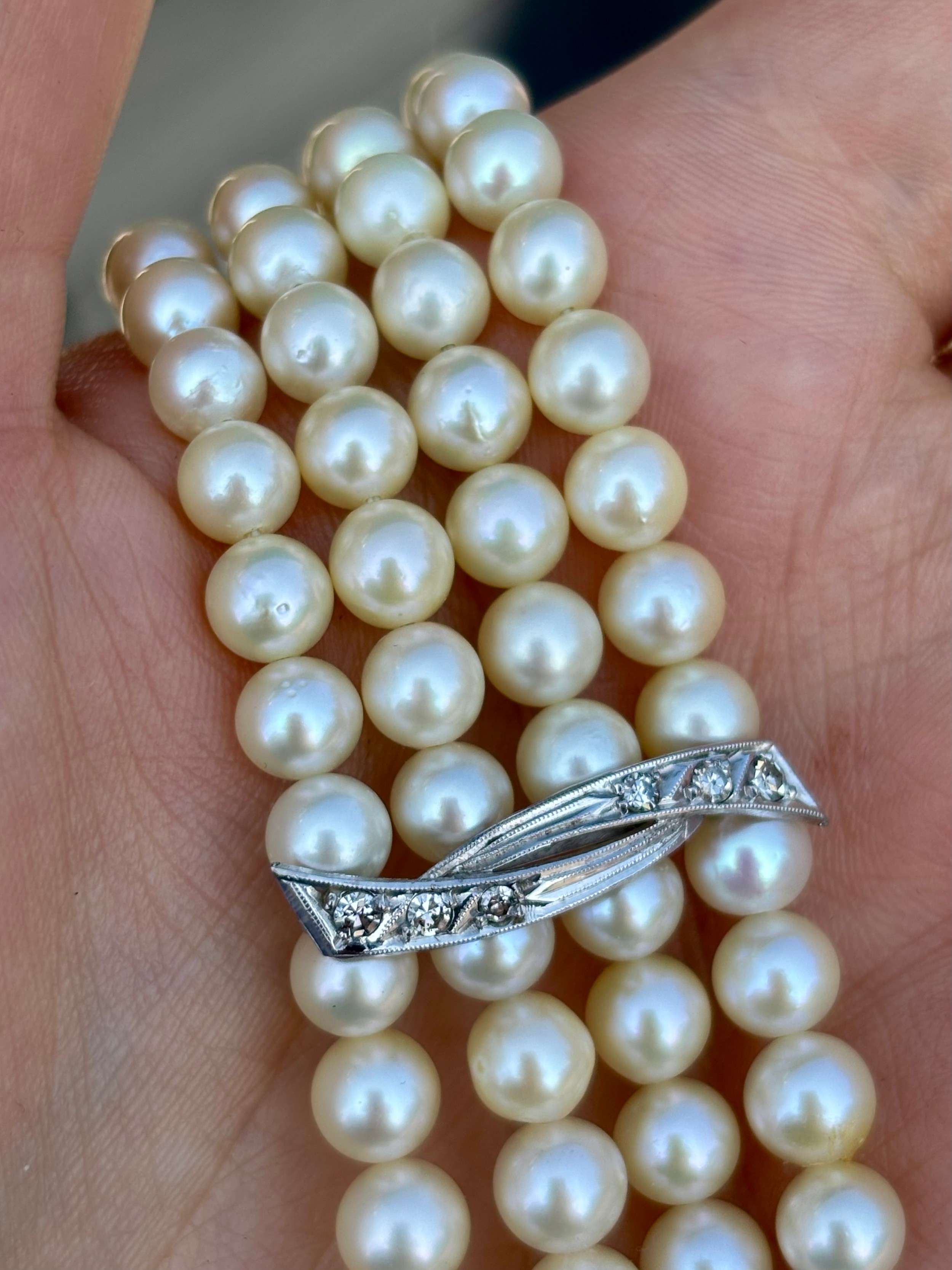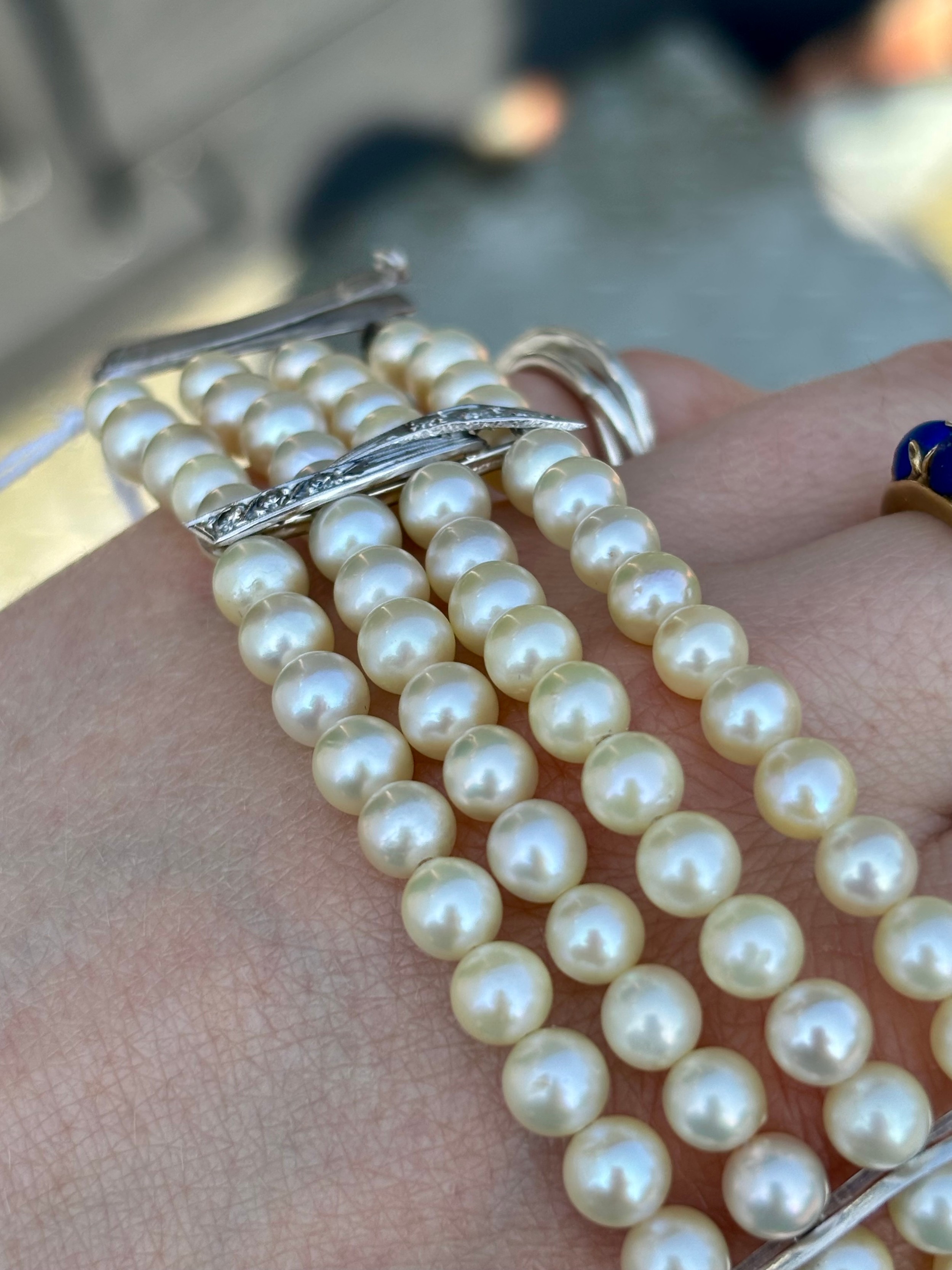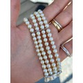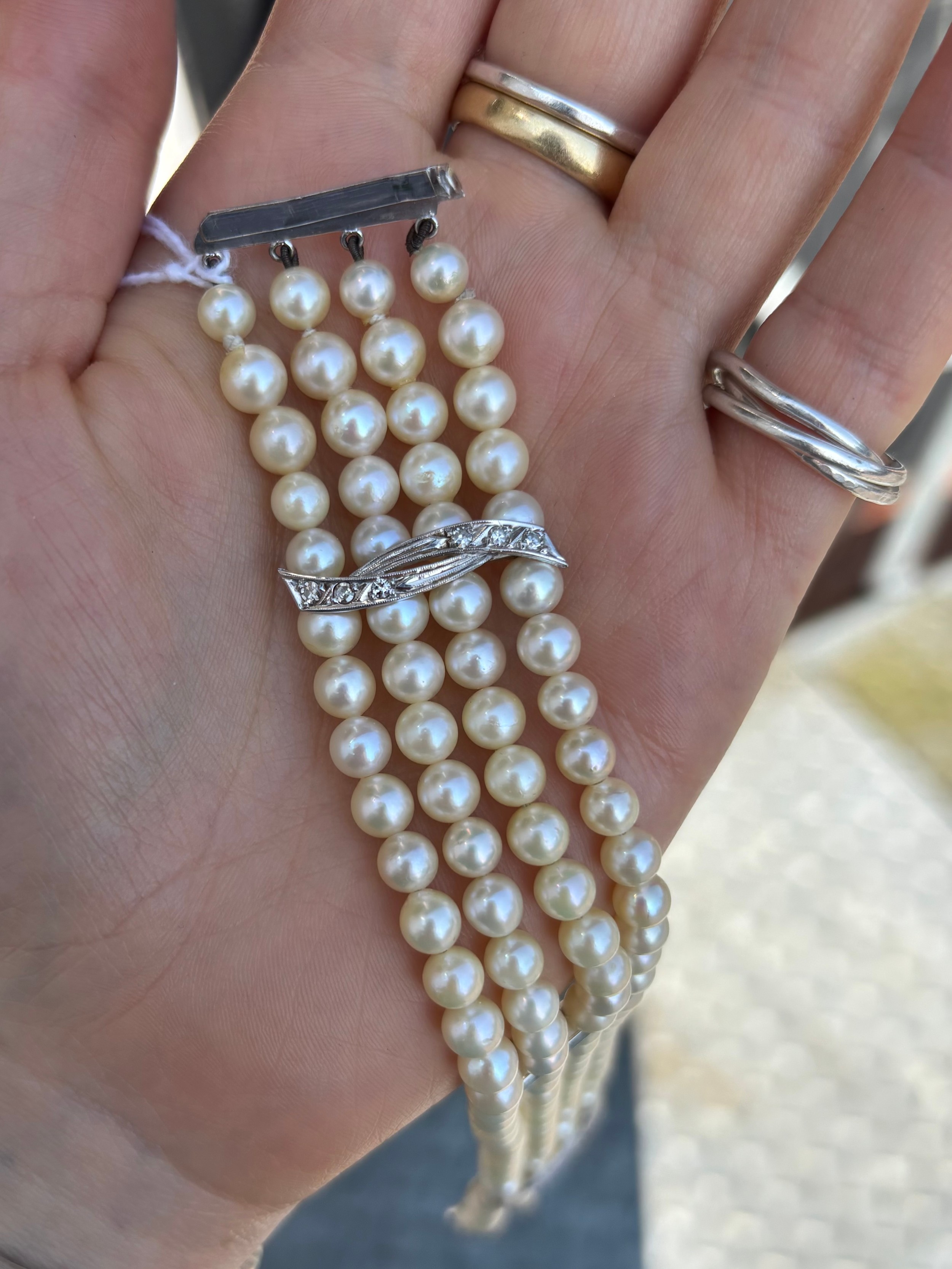 A cultured pearl and diamond bracelet, the three white metal stylised bars set with six graduated diamonds to each bar, set between quadruple strand of uniform spherical cultured pearls, 19cm long, 40gms, pearls 5mm