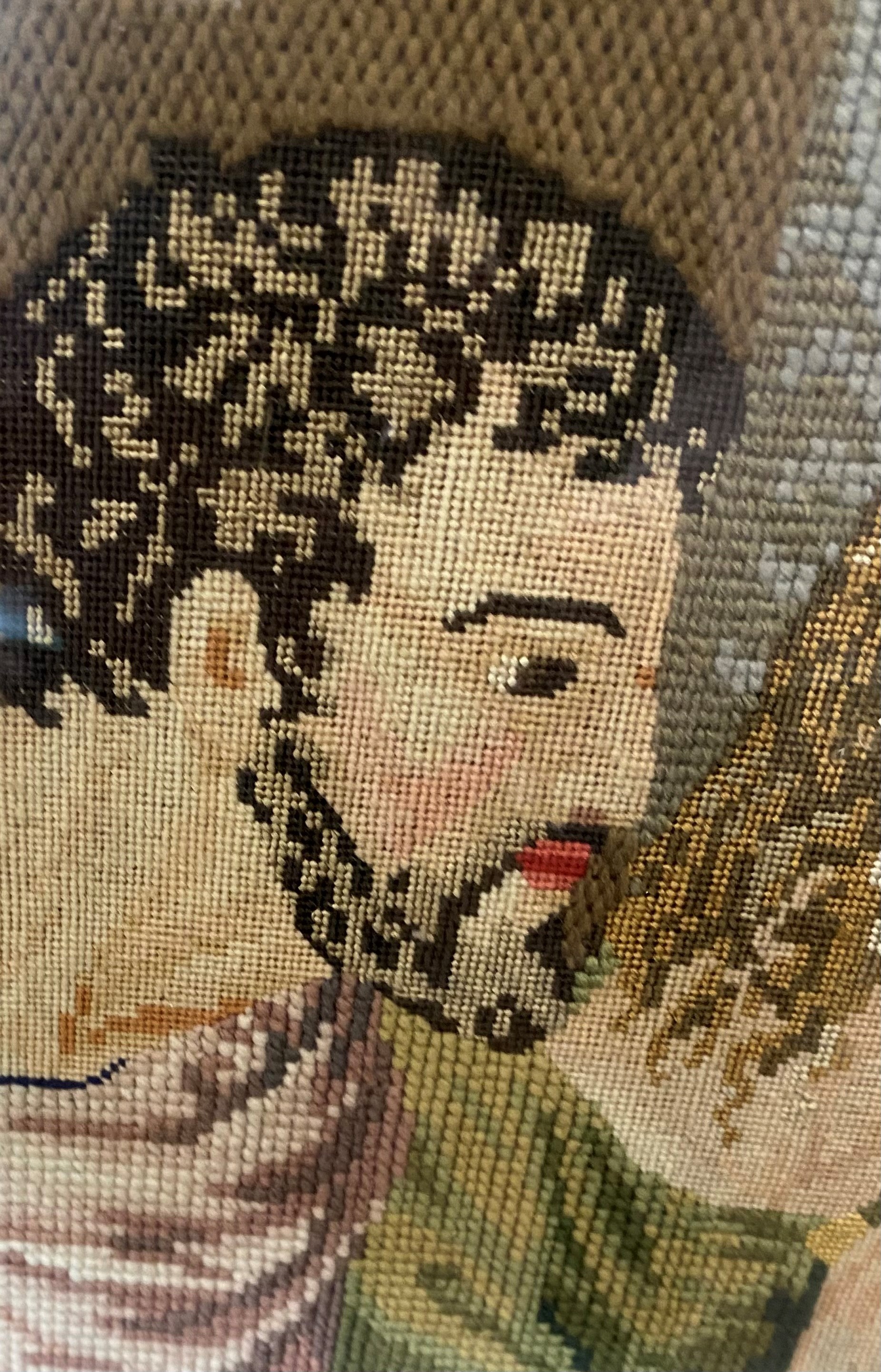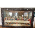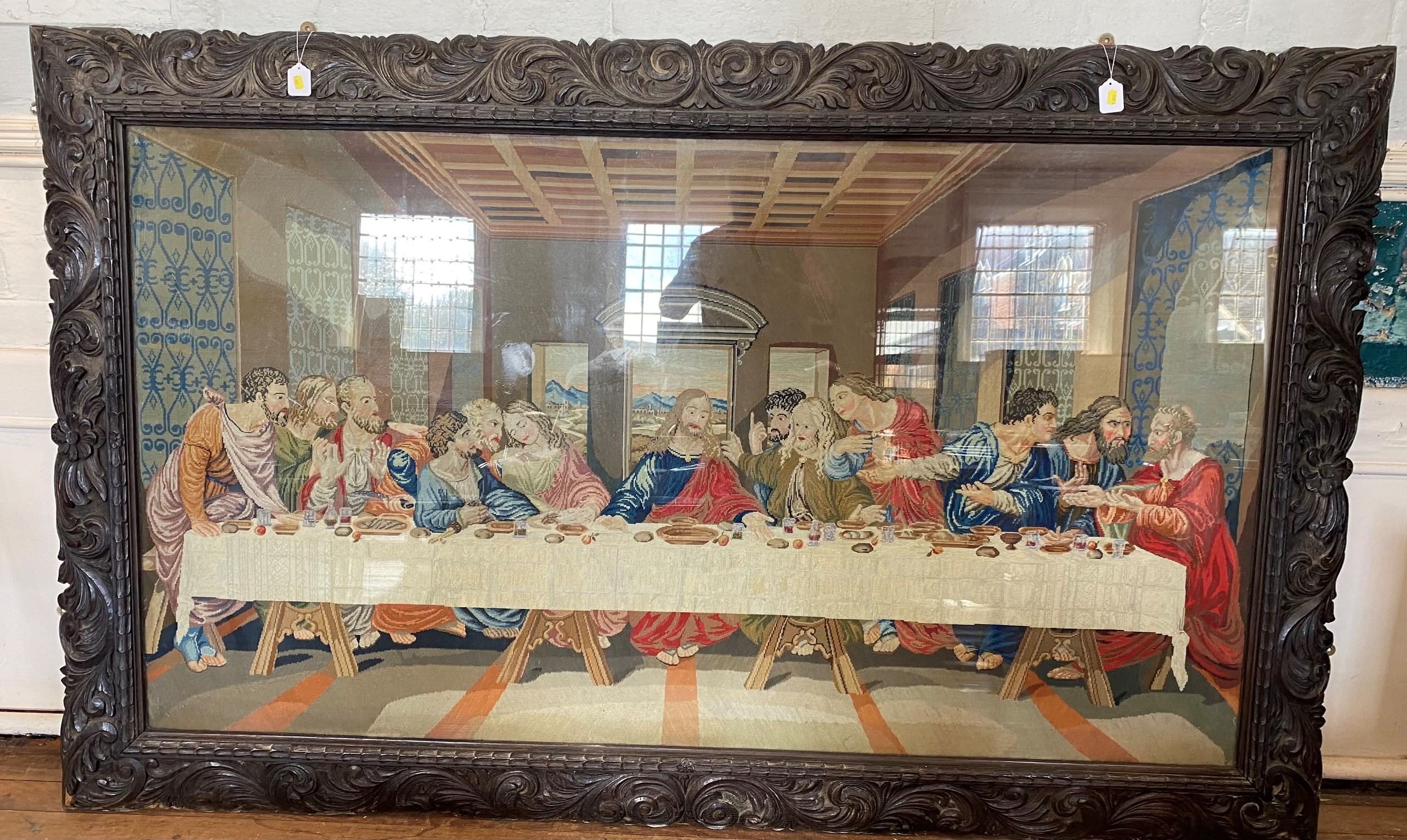 A Large and Impressive Berlin Gross Point Tapestry of the last Supper. 19th century. In a massive carved black oak frame. The tapestry 108cm x 196cm