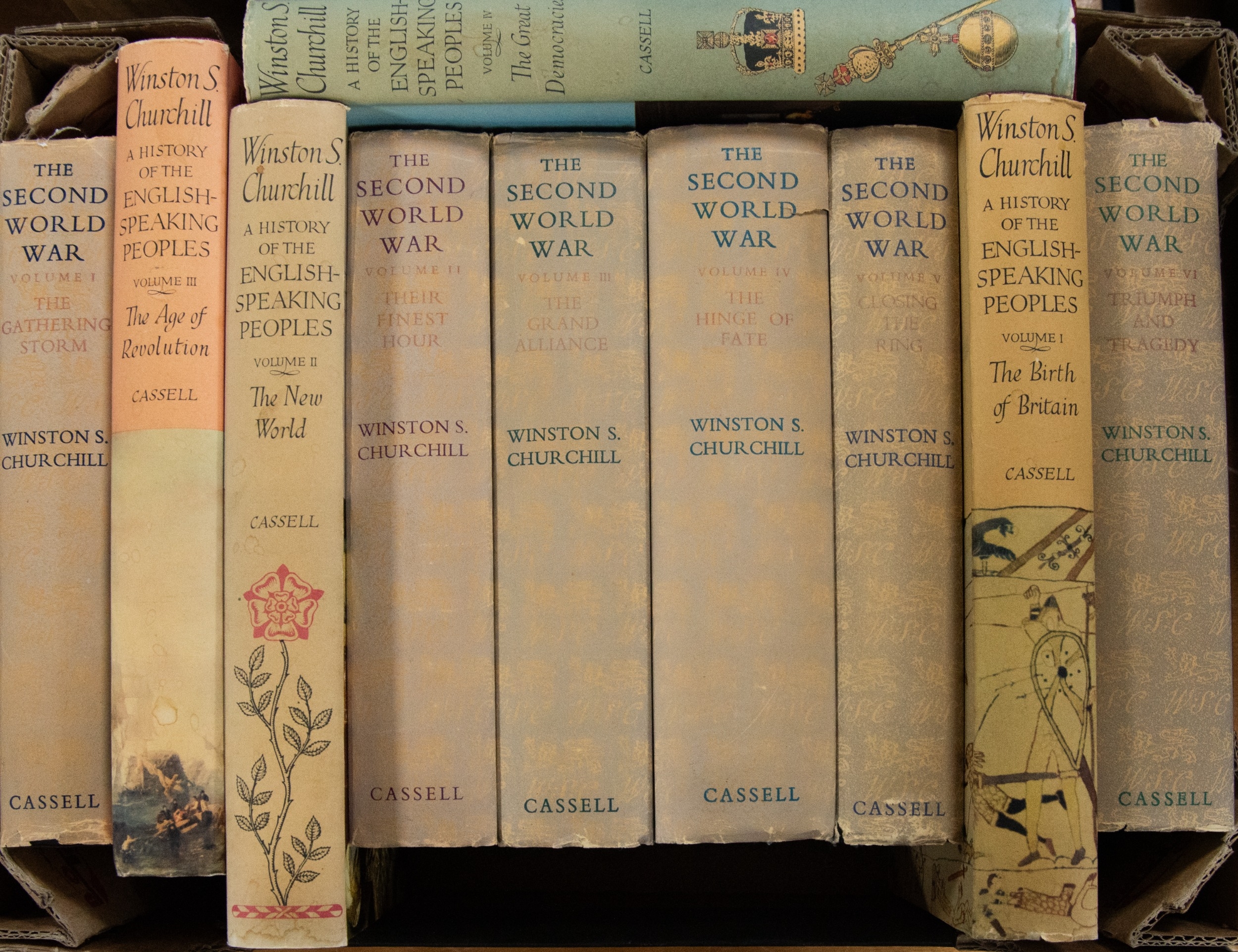 Winston S Churchill - The Second World War, pub Cassell, 6 vol, 1st ed 1948/49/50/51/52/54, dj unclipped. Together with Winston S Churchill - A History of the English Speaking People, pub Cassell, 4 vol, 1st ed 1956/56/57/58, dj unclipped. (10)