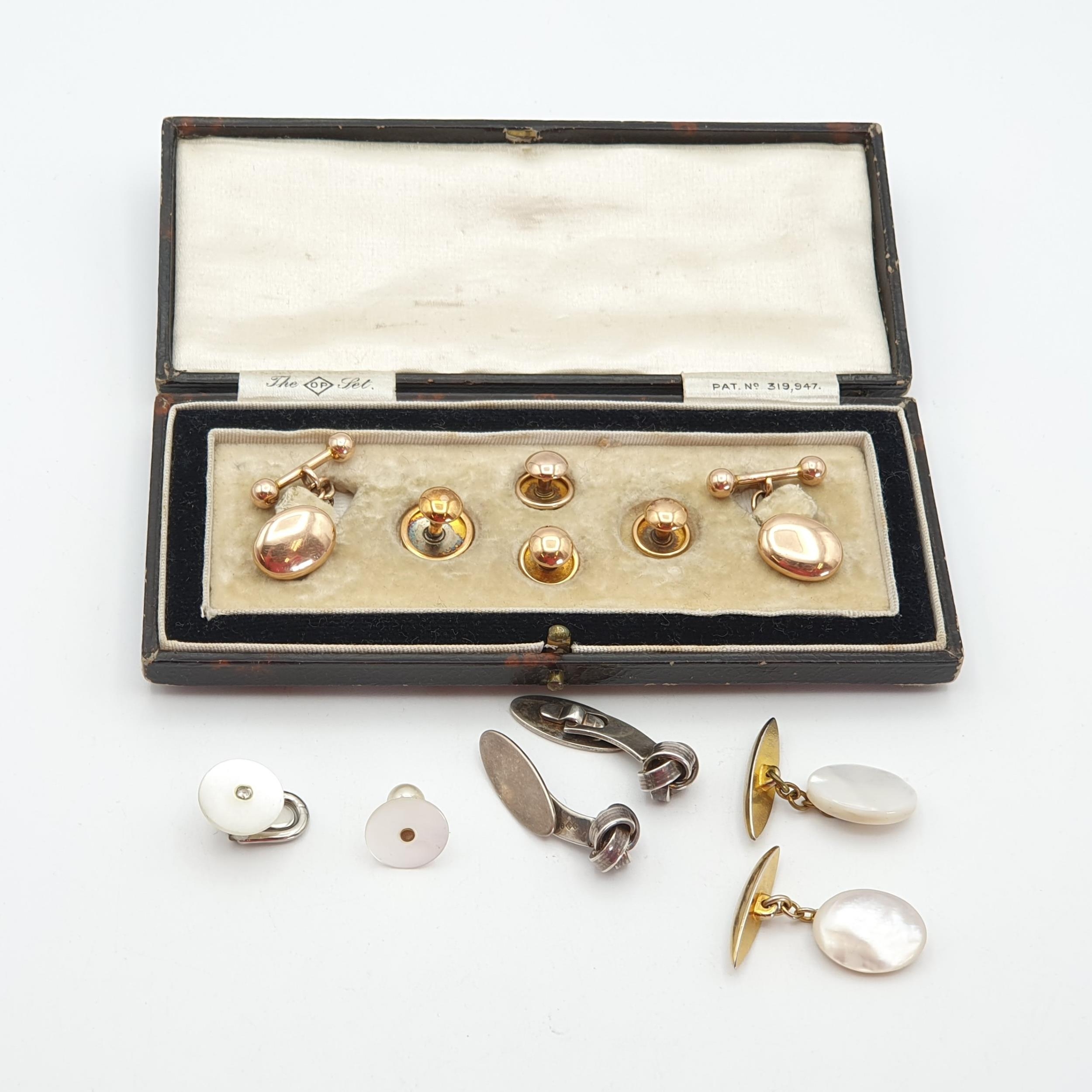 A pair of antique Oval Cufflinks with bar links and four shirt studs, unmarked but XRF indicates 9ct gold, 11.5 gms, in a fitted case, a pair of knot Cufflinks marked 925 and various other mother of pearl Cufflinks and Shirt Studs