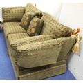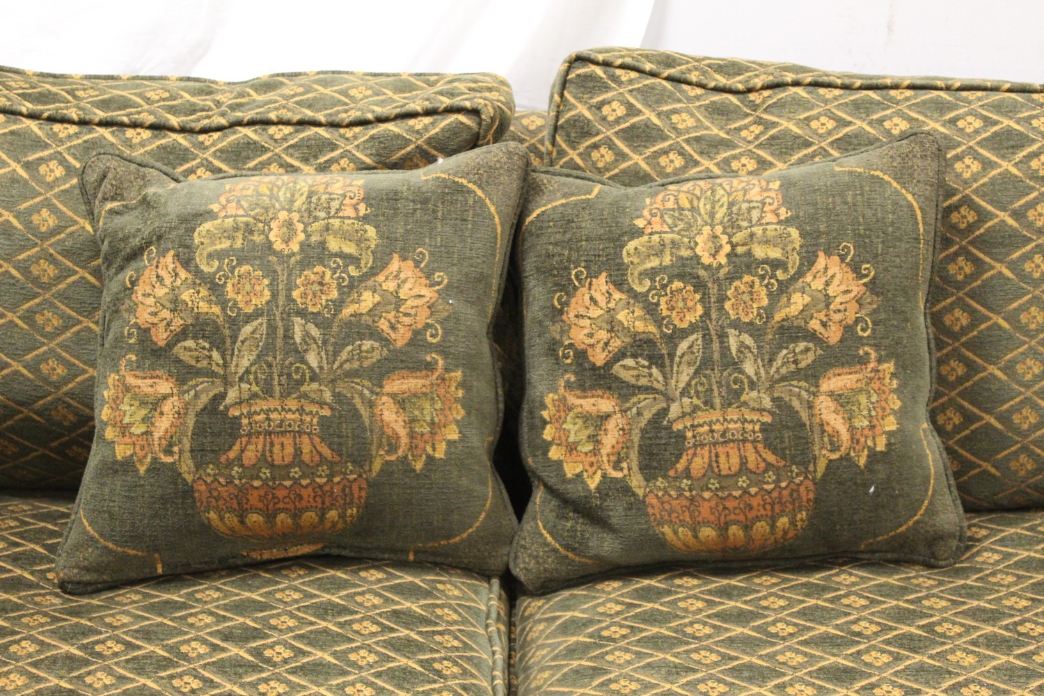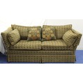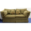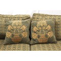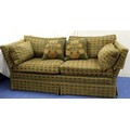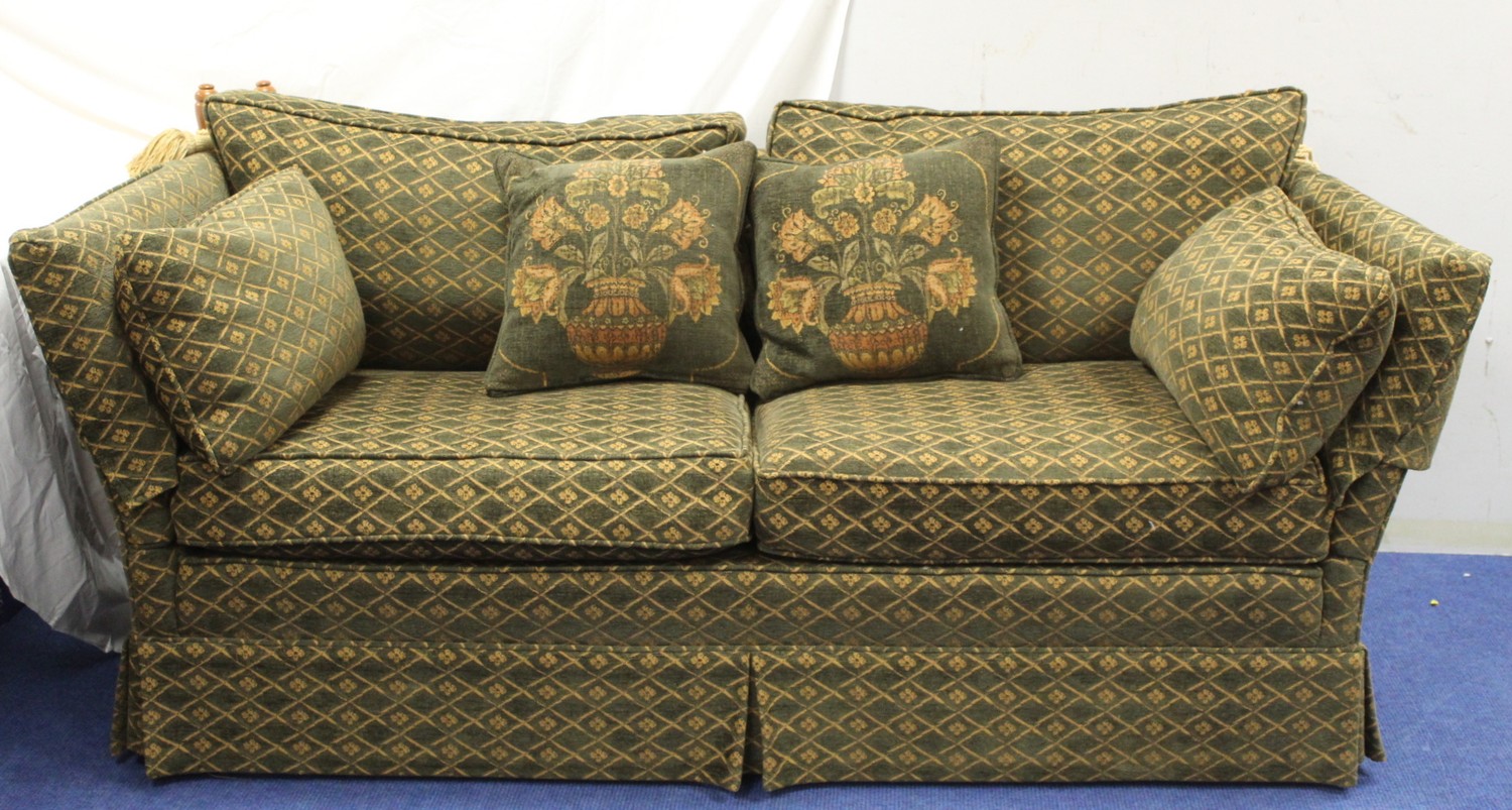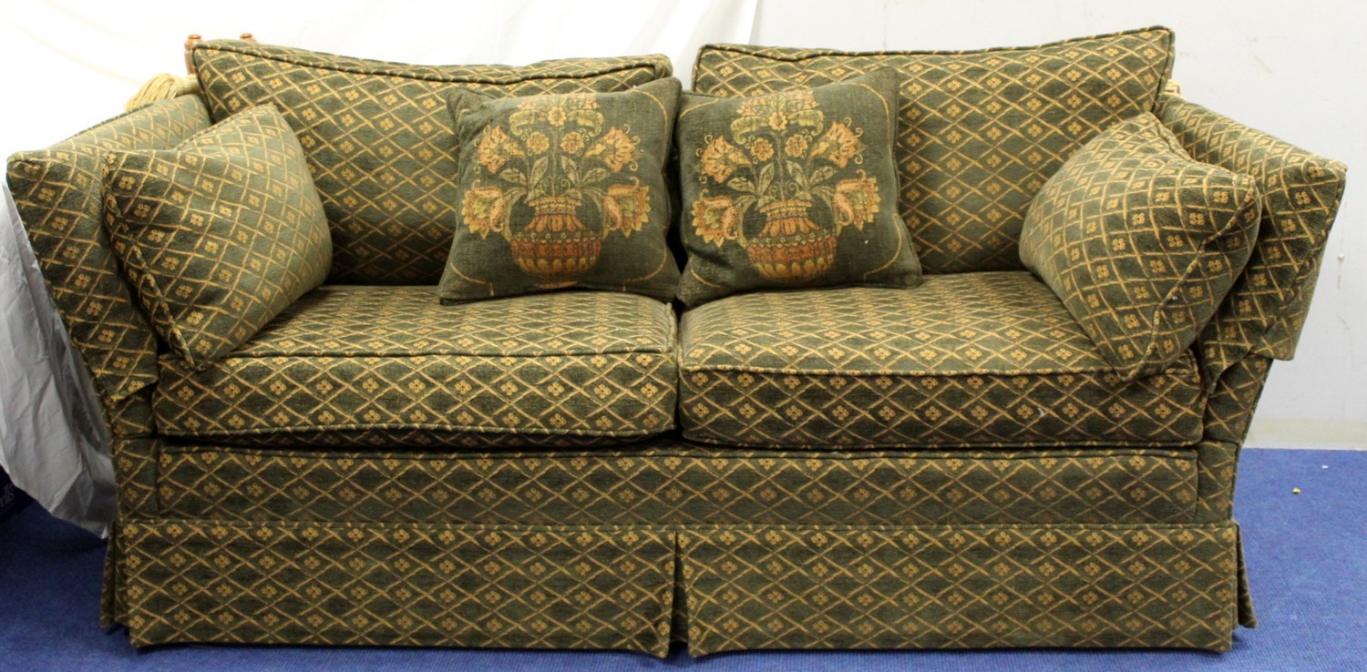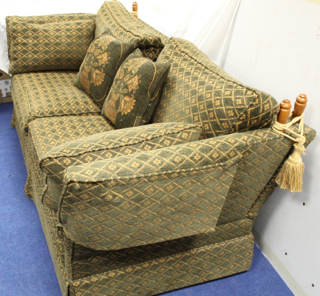 Peter Guild three seater Knole sofa upholstered in green and gold boucle moquette, with four scatter cushions. 184cm long x 92cm deep x 76cm high (excluding knops).